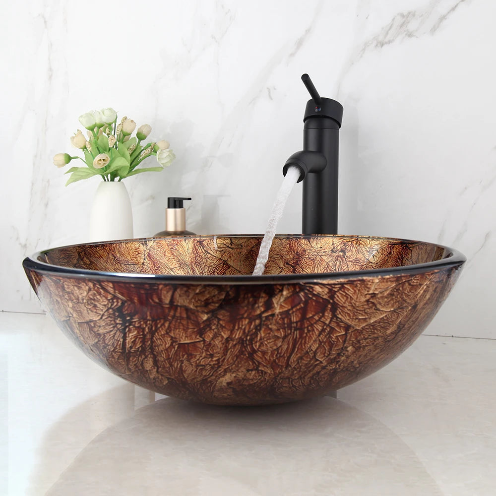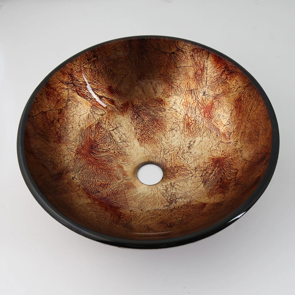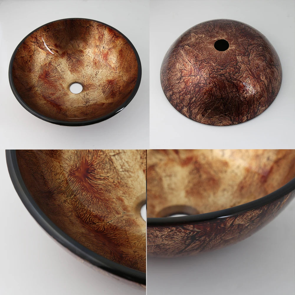 KEMAIDI Waschbecken mit Wasserhahn-Abfluss-Kombination aus gehärtetem Glas, 43,2 cm rundes Waschbecken, braunes Badezimmer-Schüsselwaschbecken über dem Waschbecken