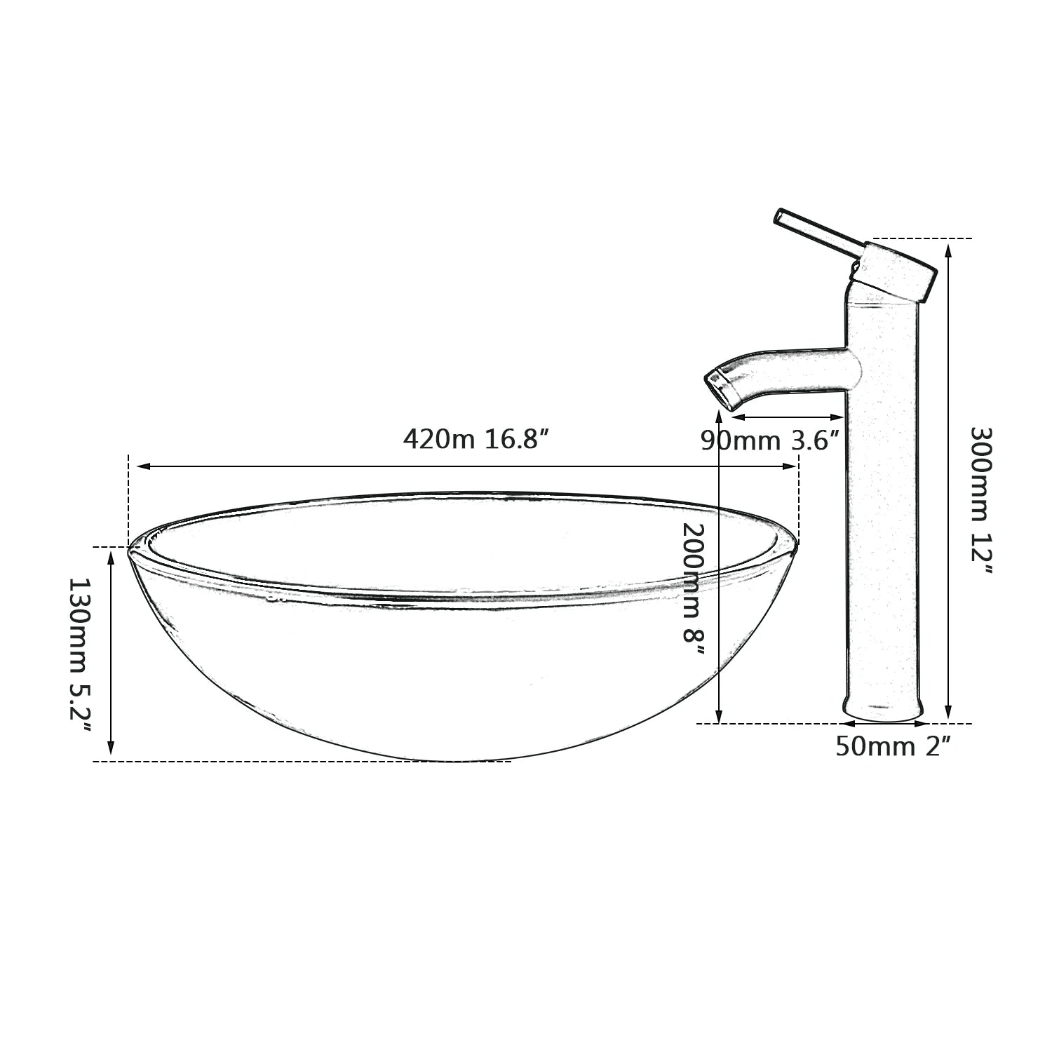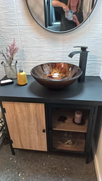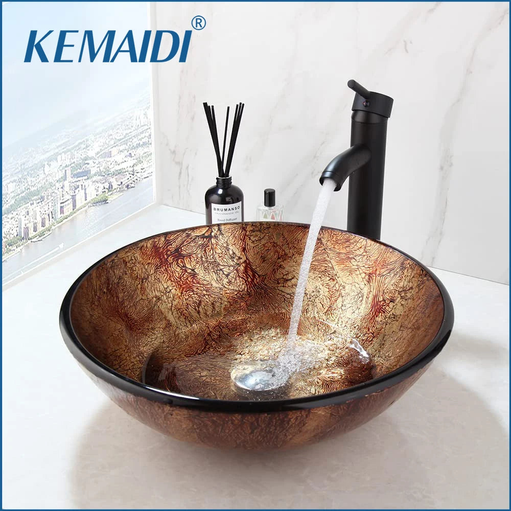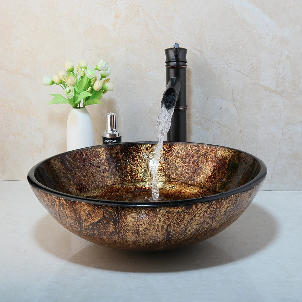 KEMAIDI Waschbecken mit Wasserhahn-Abfluss-Kombination aus gehärtetem Glas, 43,2 cm rundes Waschbecken, braunes Badezimmer-Schüsselwaschbecken über dem Waschbecken