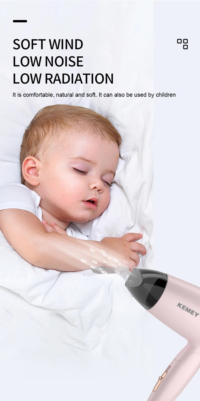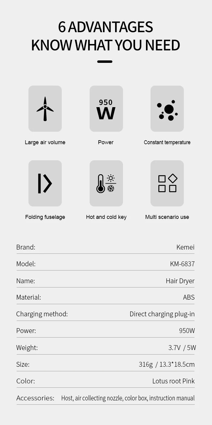Kemei Portable Handle Compact Hair Dryer Foldable Low Noise Blower Dryer Hot Wind Long Life for Outdoor Travel 950W Student Use