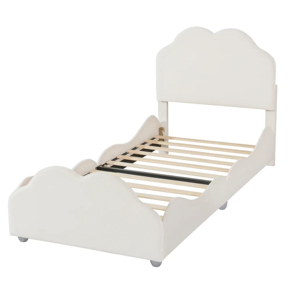 Kinderbett 90 x 200 cm hohes Geländer, Kinderbettgestell mit wolkenförmigem Kopf und Fußteil, Bett aus hautfreundlichem Samt