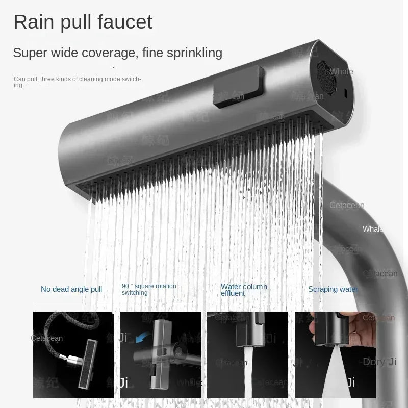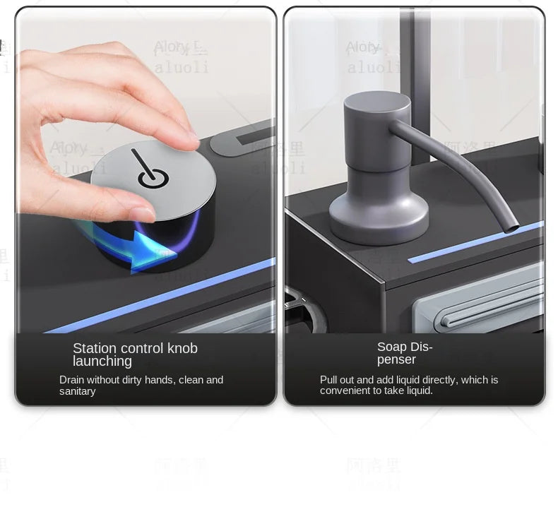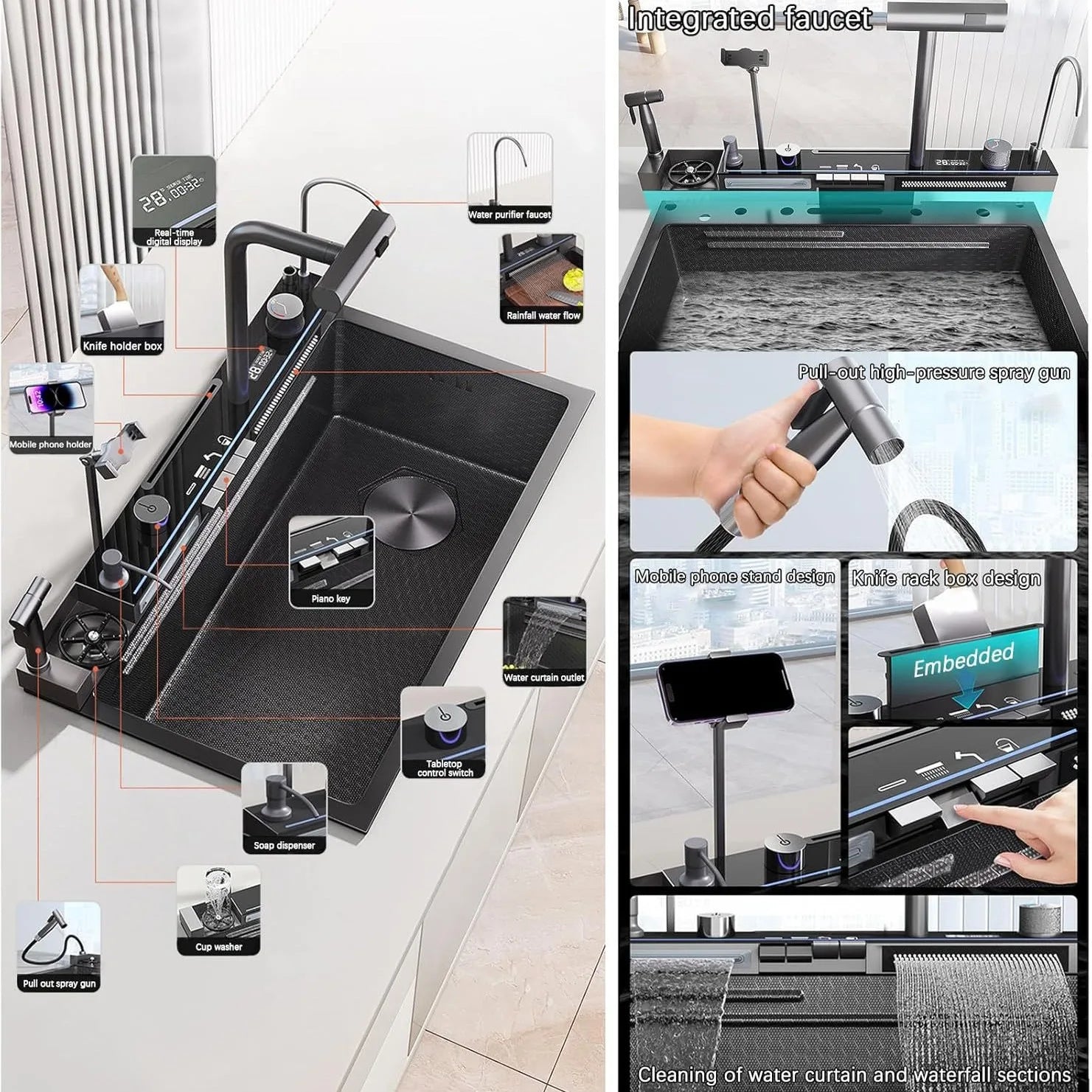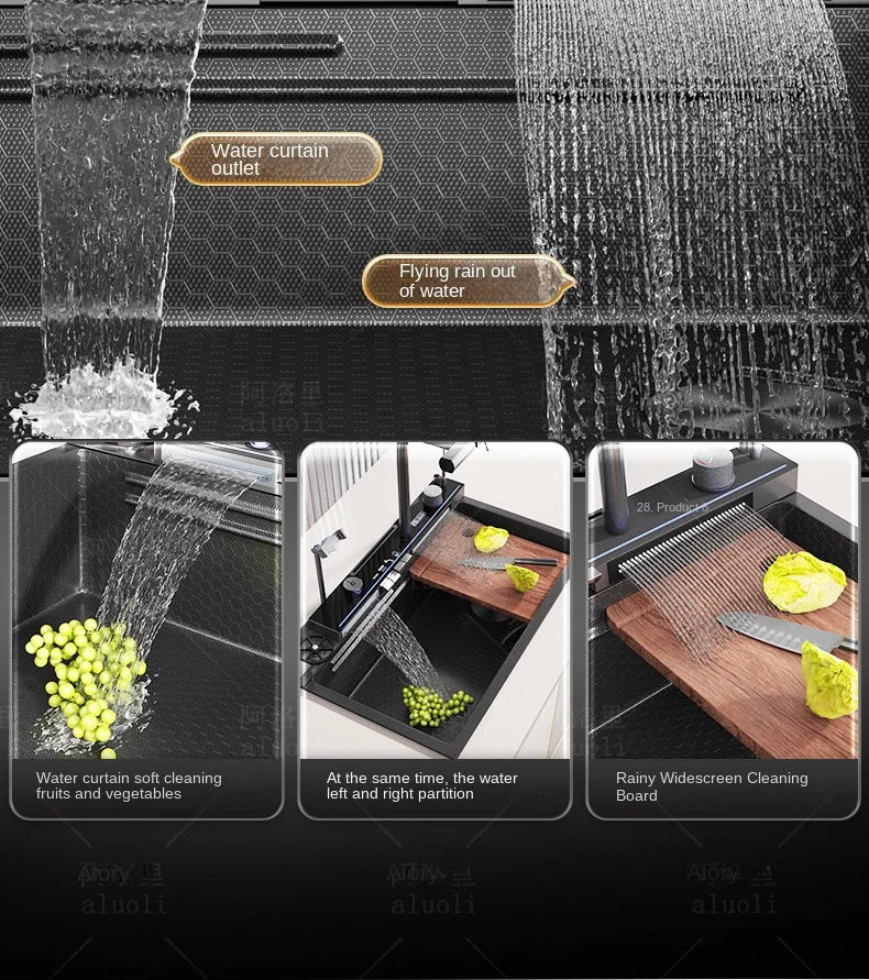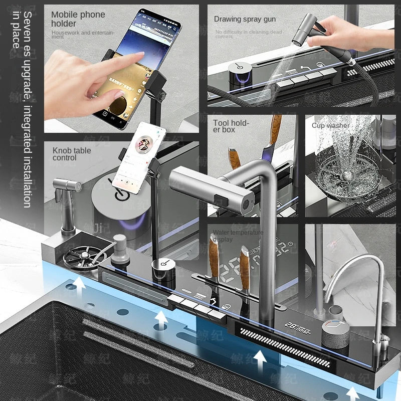 Kitchen 304 Stainless Steel Waterfall Sink, Large Single Slot, Digital Display Embossed Washing Basin Household Dishwashing Sink