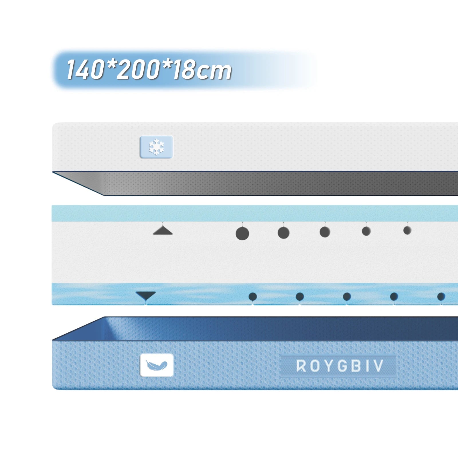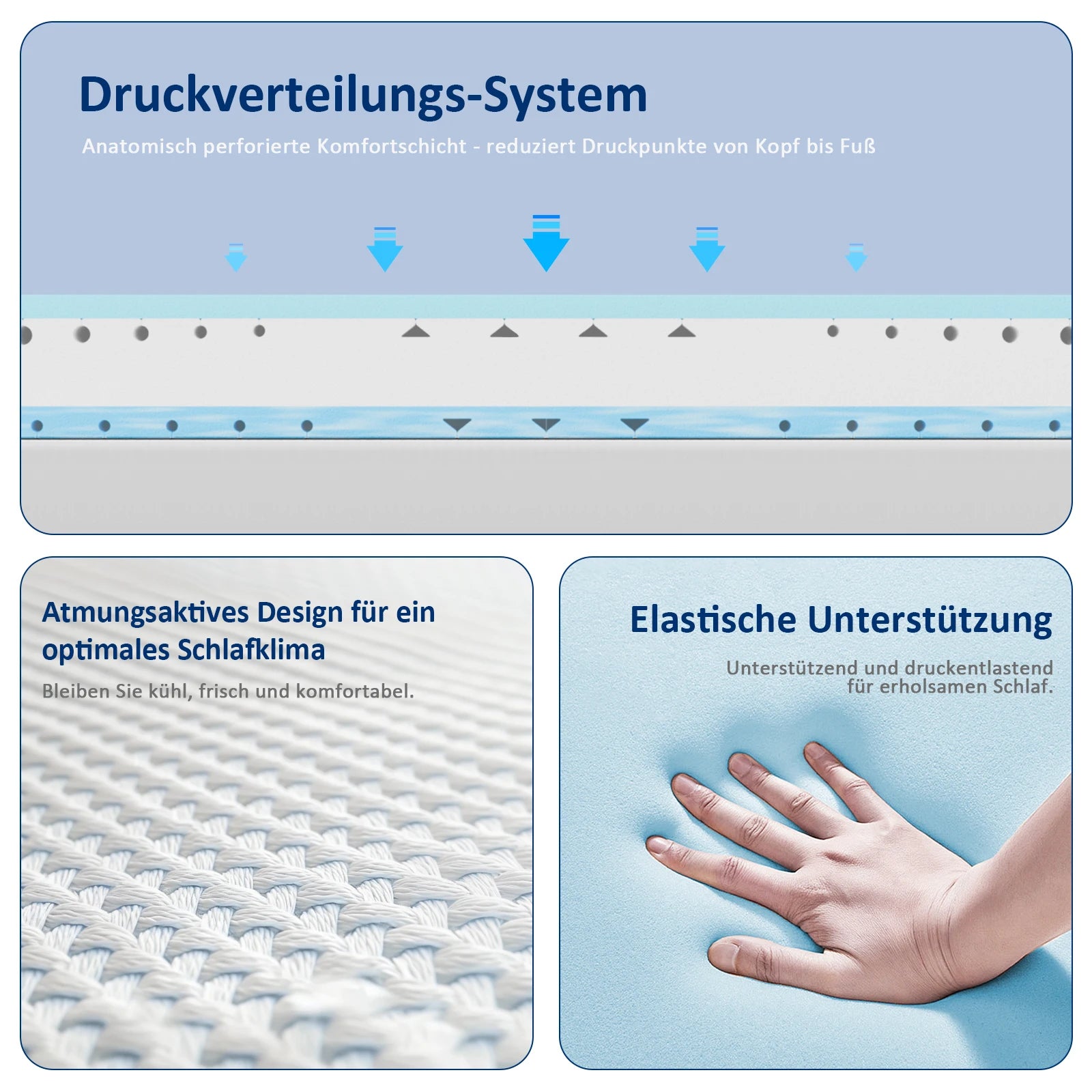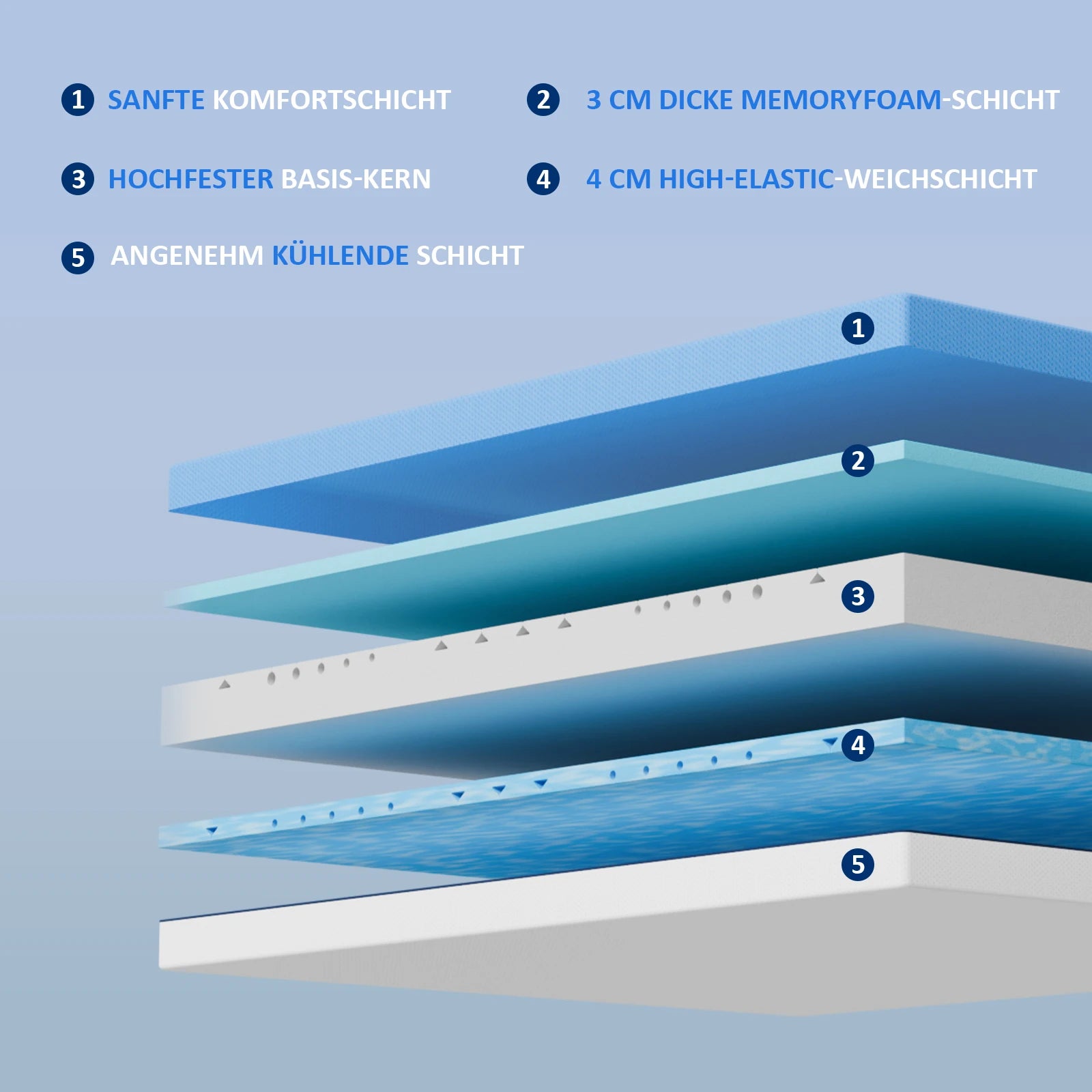 Komfortschaummatratze 140×200×18 cm, wendbar, Memory-Schaum, kühlender Bezug, Härte H3/H4, 18 cm hoch, 7-Zonen Unterstützung