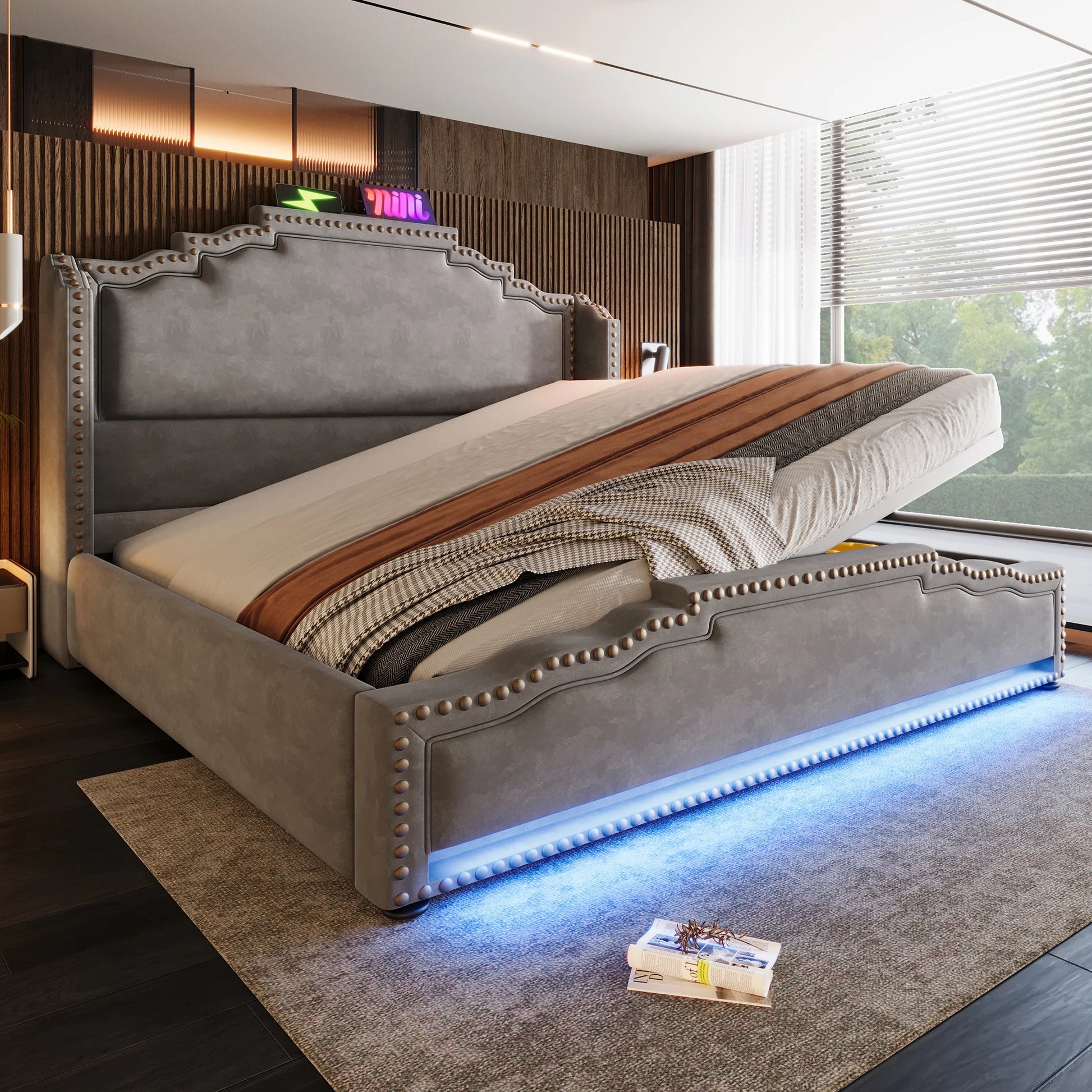 KOMHTOM Doppelbett Samt, Hydraulischer Stauraum, LED-Beleuchtung, USB-C-Ladeanschluss, ohne Matratze