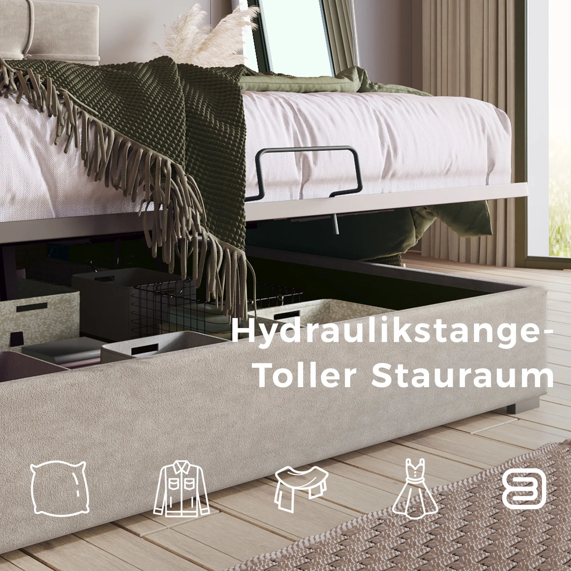 KOMHTOM Hydraulisch Polsterbett Hellgrau - Verstellbares Kopfteil, Metallrahmen-Lattenrost, mit Stauraum, Samtbezug