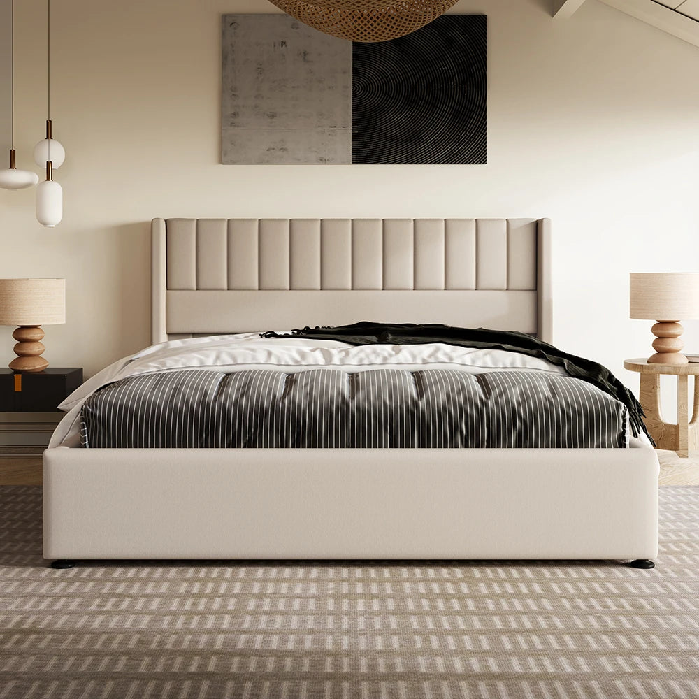 KOMHTOM Hydraulisches Doppelbett 180x200cm mit Polster, Lattenrost aus Holz, Metallrahmen, Leinen, Beige