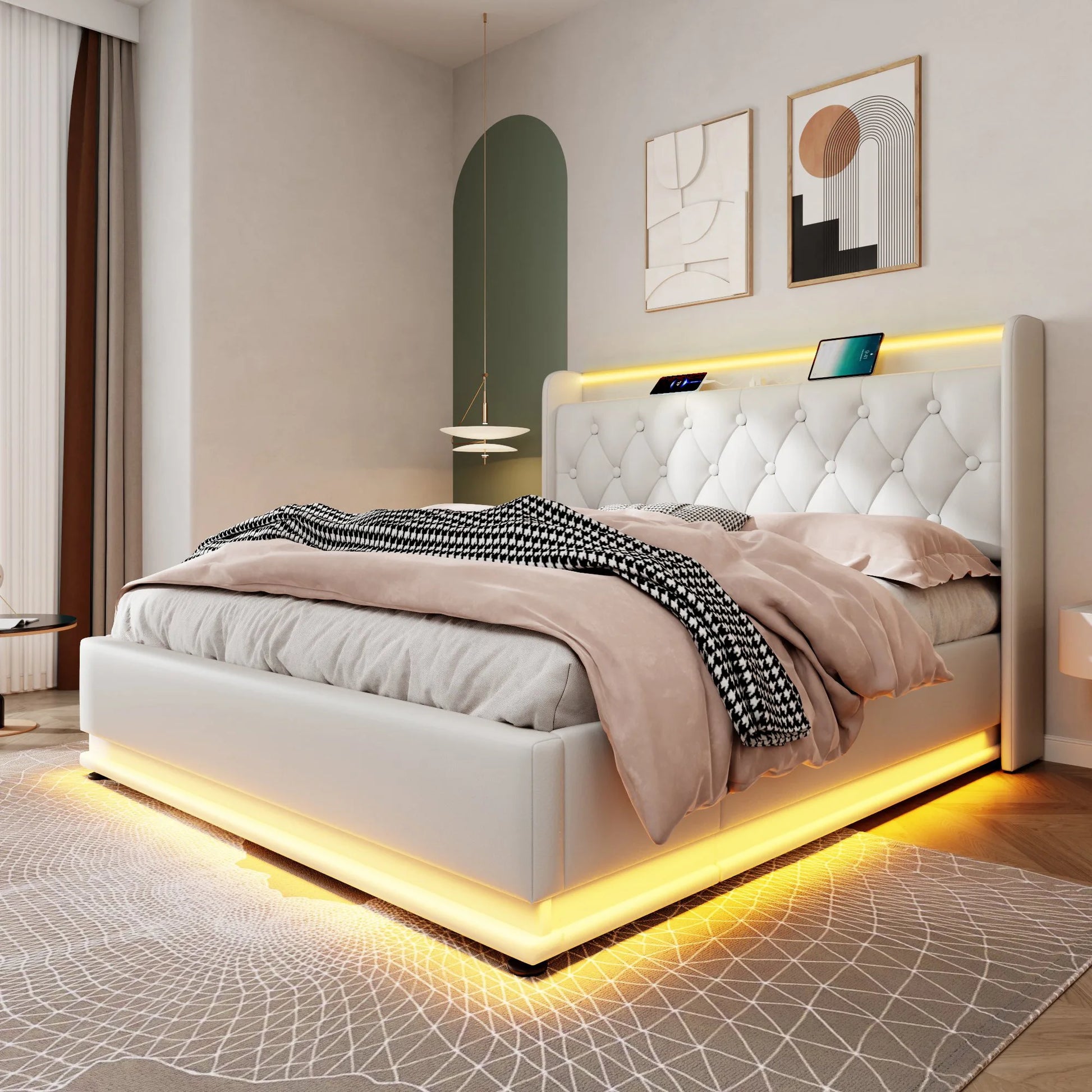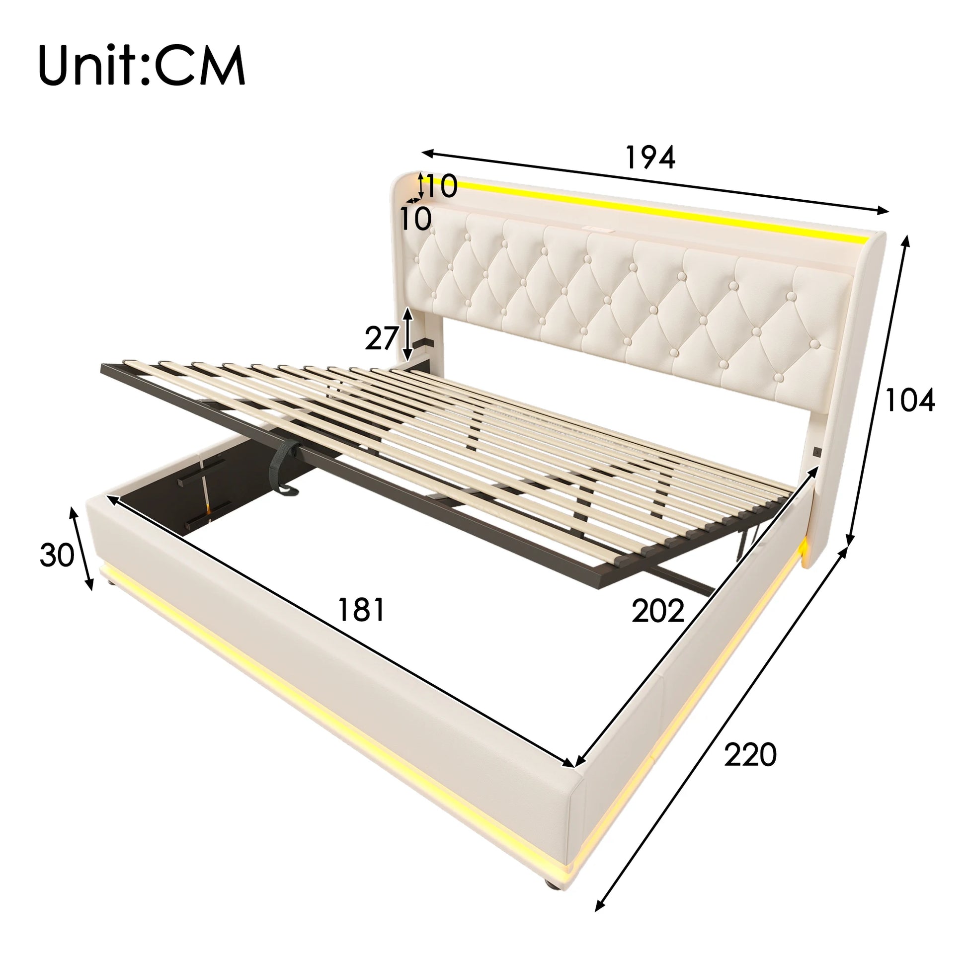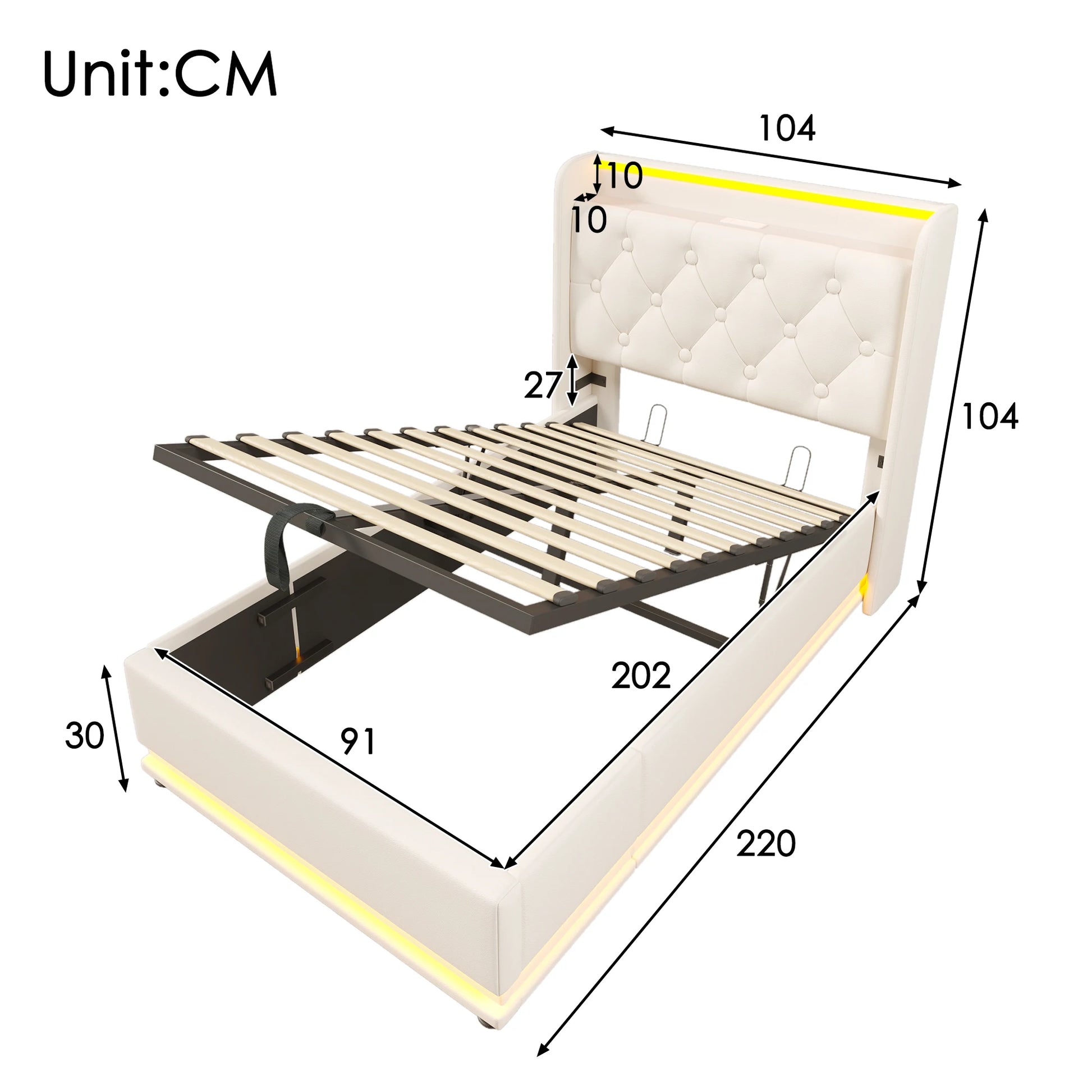 KOMHTOM Hydraulisches Lagerbett Weiß PU - 360-Surround-LED-Funktion, mit USB Typ-C Ladefunktion, ohne Matratze