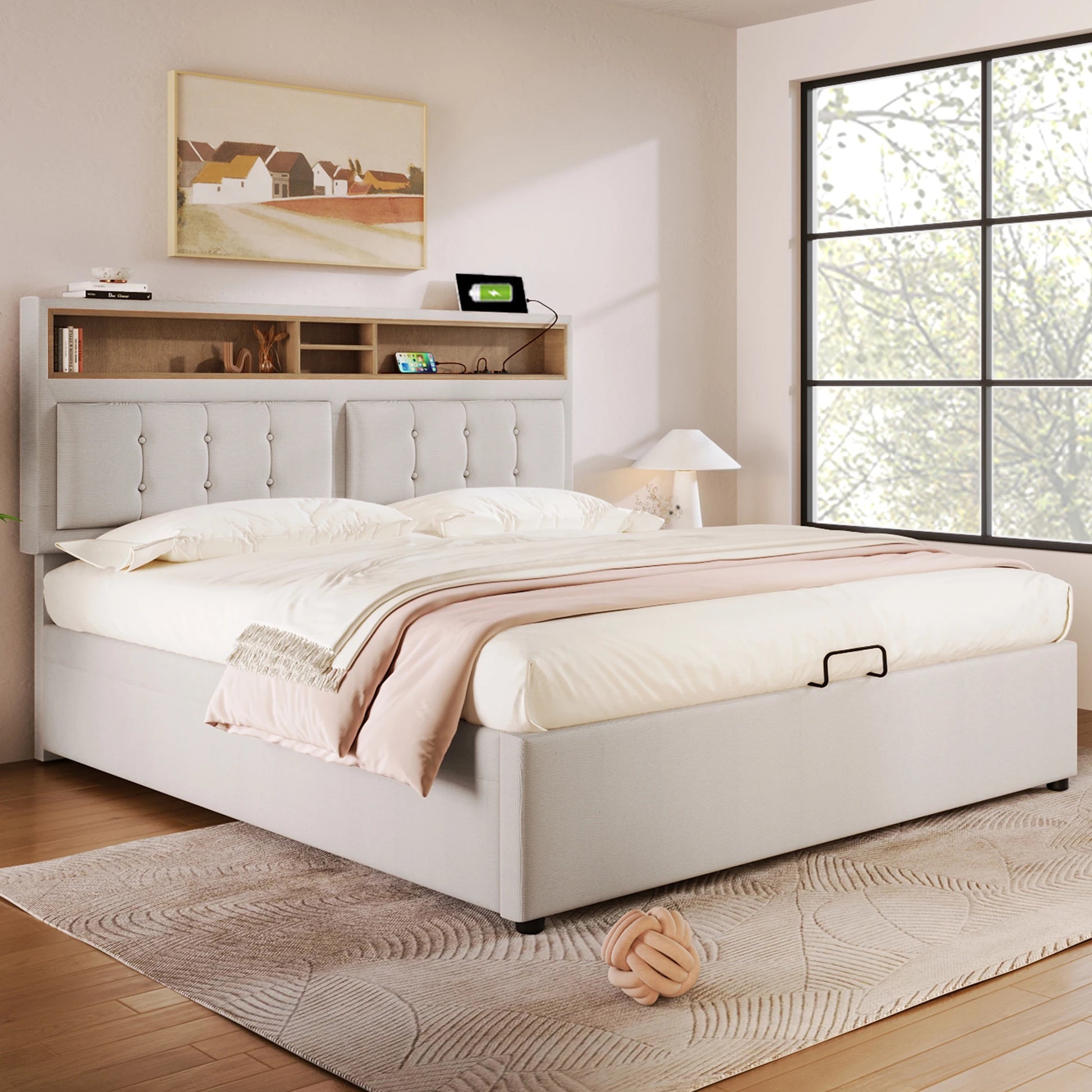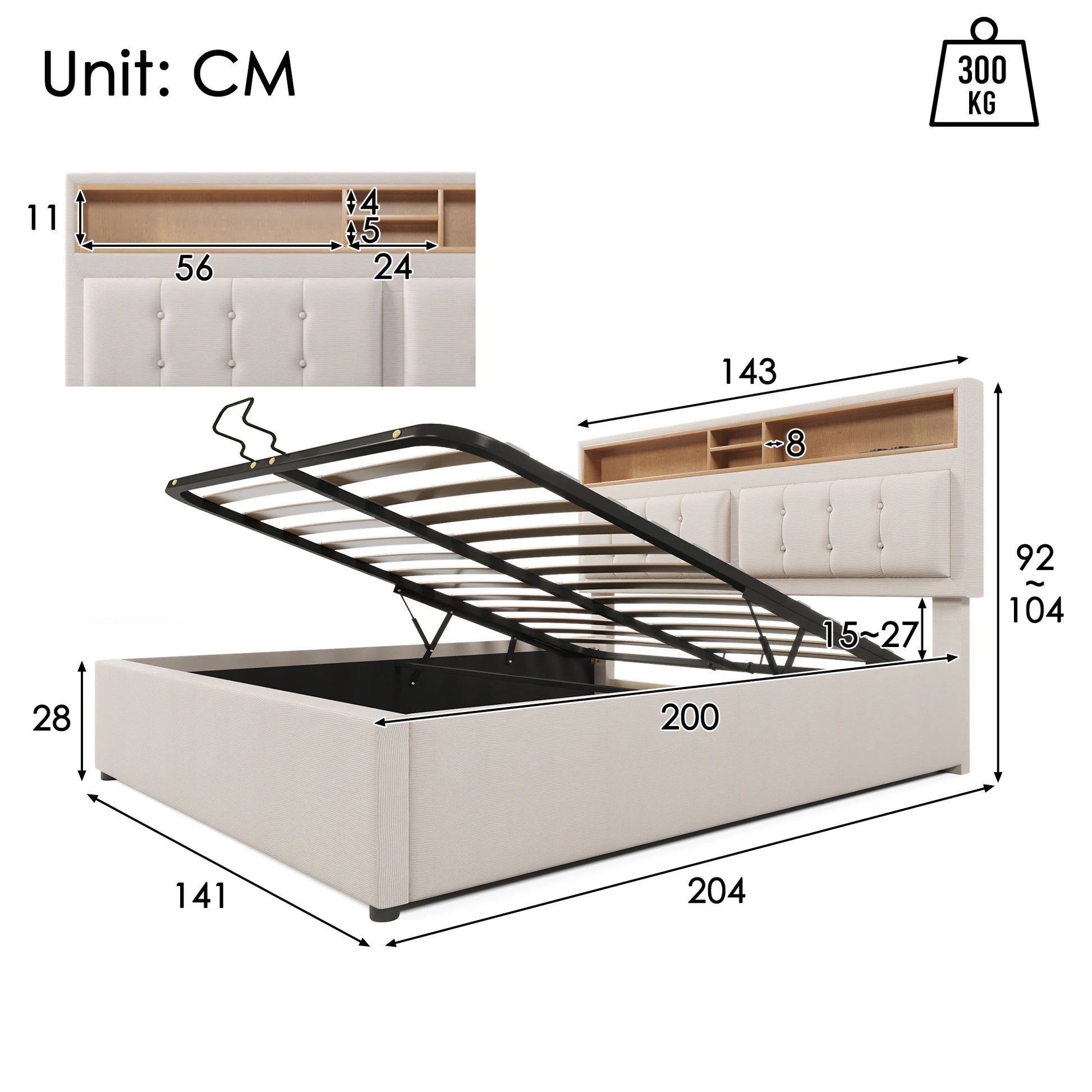 KOMHTOM Polsterbett Doppelbett Jugendbett Leinen - USB C Steckdose Ladefunktion im Kopfteil, Stauraumbett, ohne Matratze