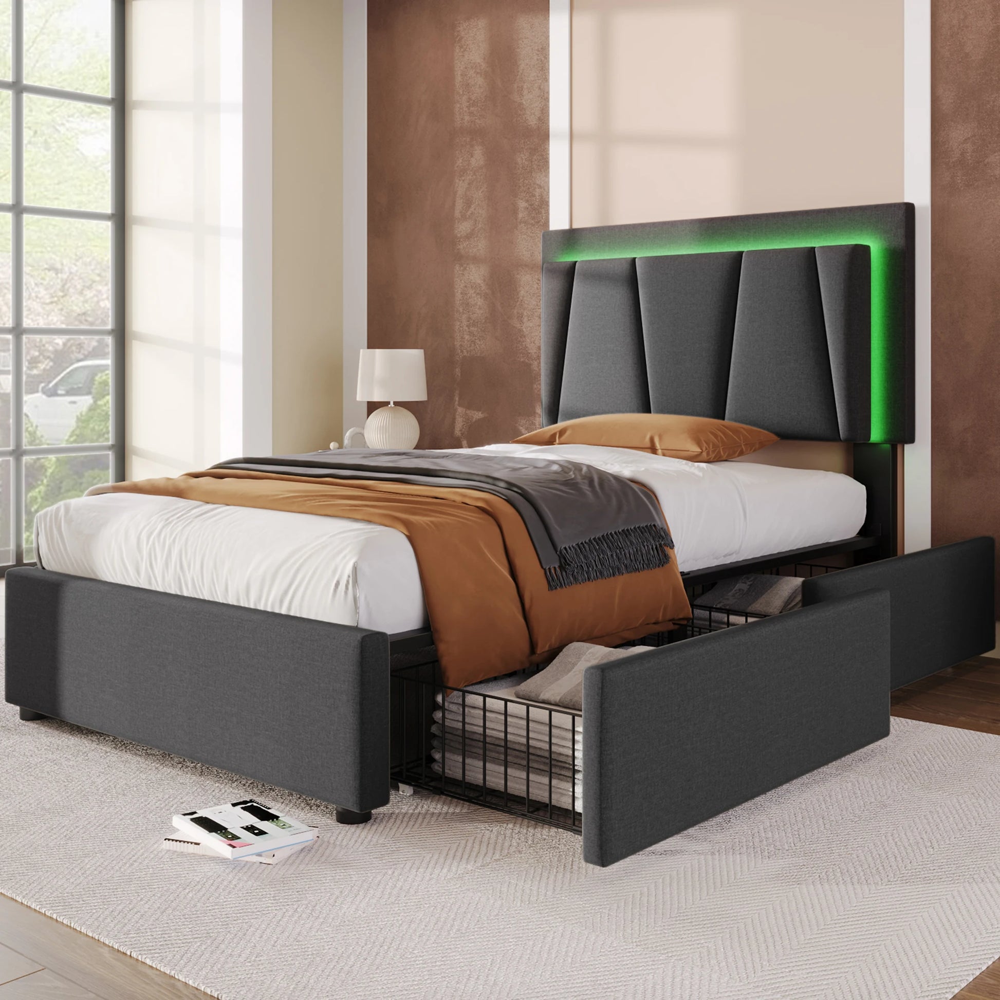 KOMHTOM Polsterbett Einzelbett 90x200 cm, LED-Beleuchtung, 2 Schubladen, höhenverstellbares Kopfteil, ohne Matratze