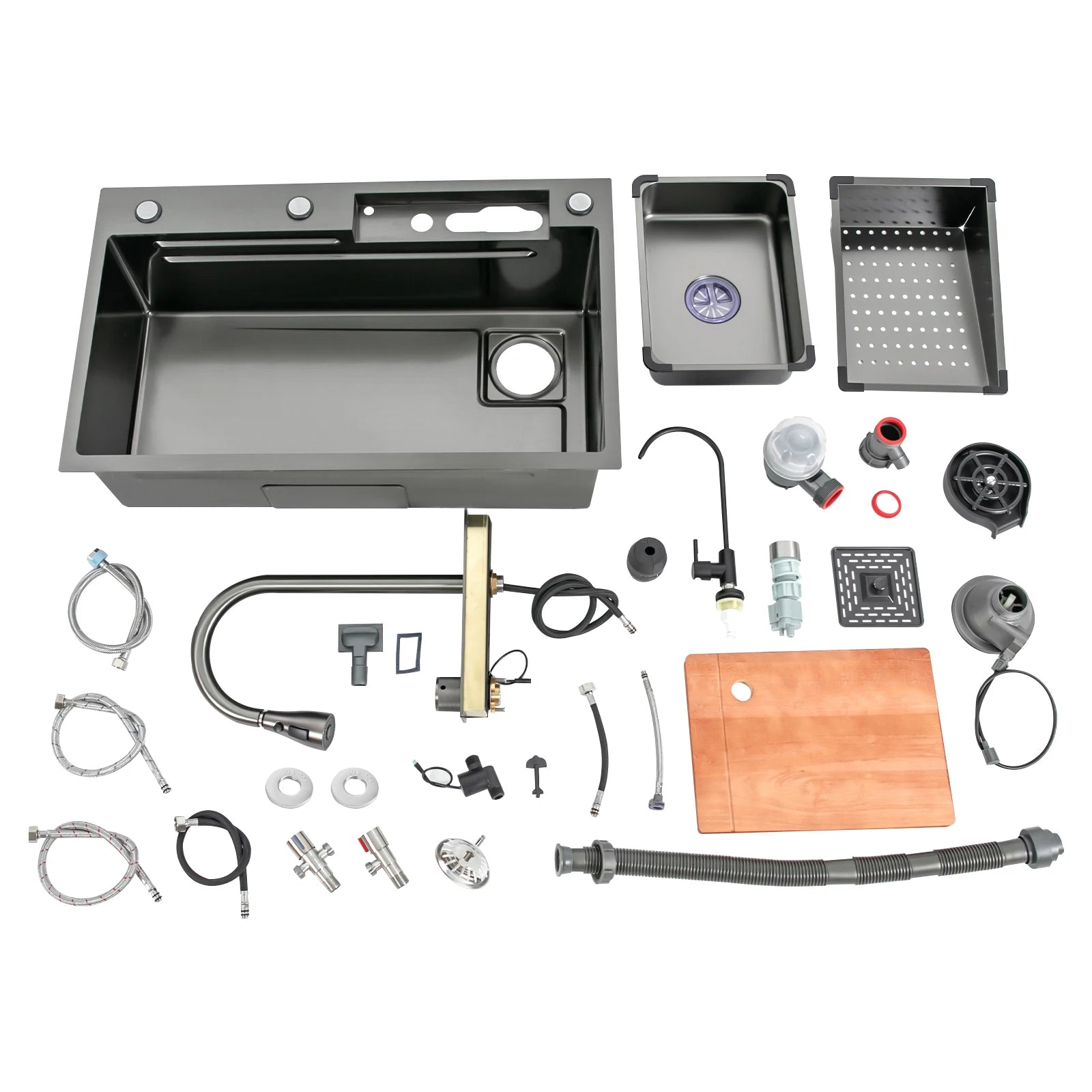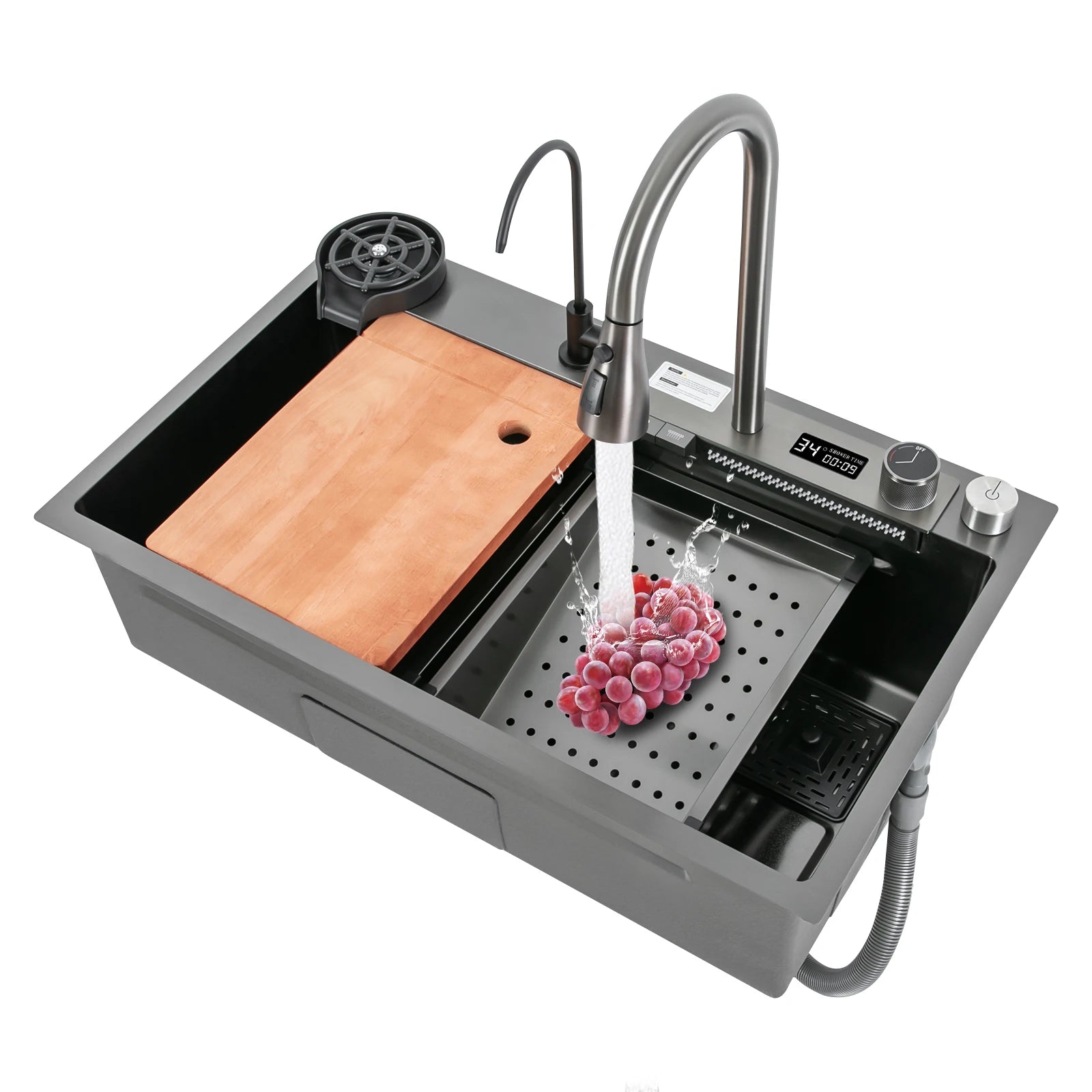Küchenspüle aus Edelstahl 201 mit Digitalanzeige, ausziehbarer Wasserhahn, Abtropfkorb, Schneidebrett, Hochdruck-Becherwascher