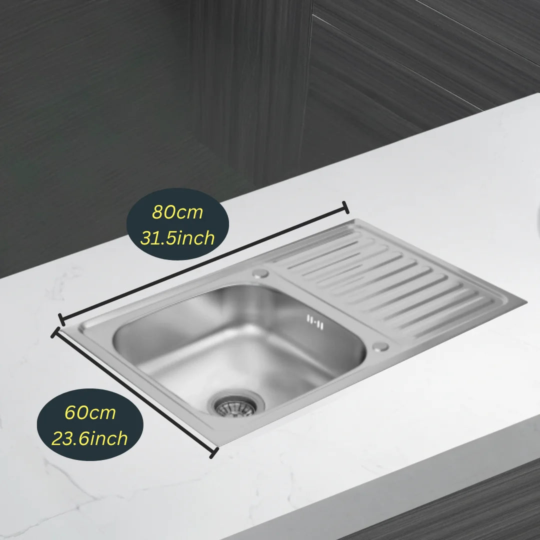 Küchenspüle aus Edelstahl, 80 x 60 cm, mit Abtropffläche, Einzelschüssel, Wasserhahnloch, umschaltbar auf der Oberseite