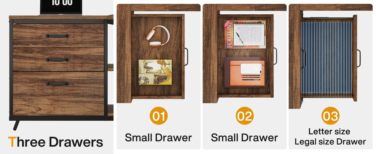 L-förmiger Computertisch mit 3 Schubladen, Home-Office-Schreibtisch mit Regalen, 53-Zoll-Industrie-PC-Schreibtisch für kleine Räume, rustikales Braun
