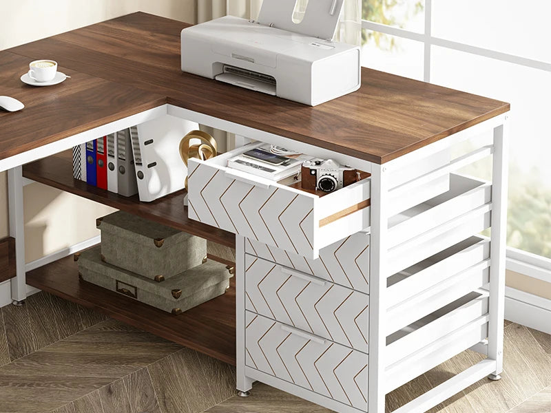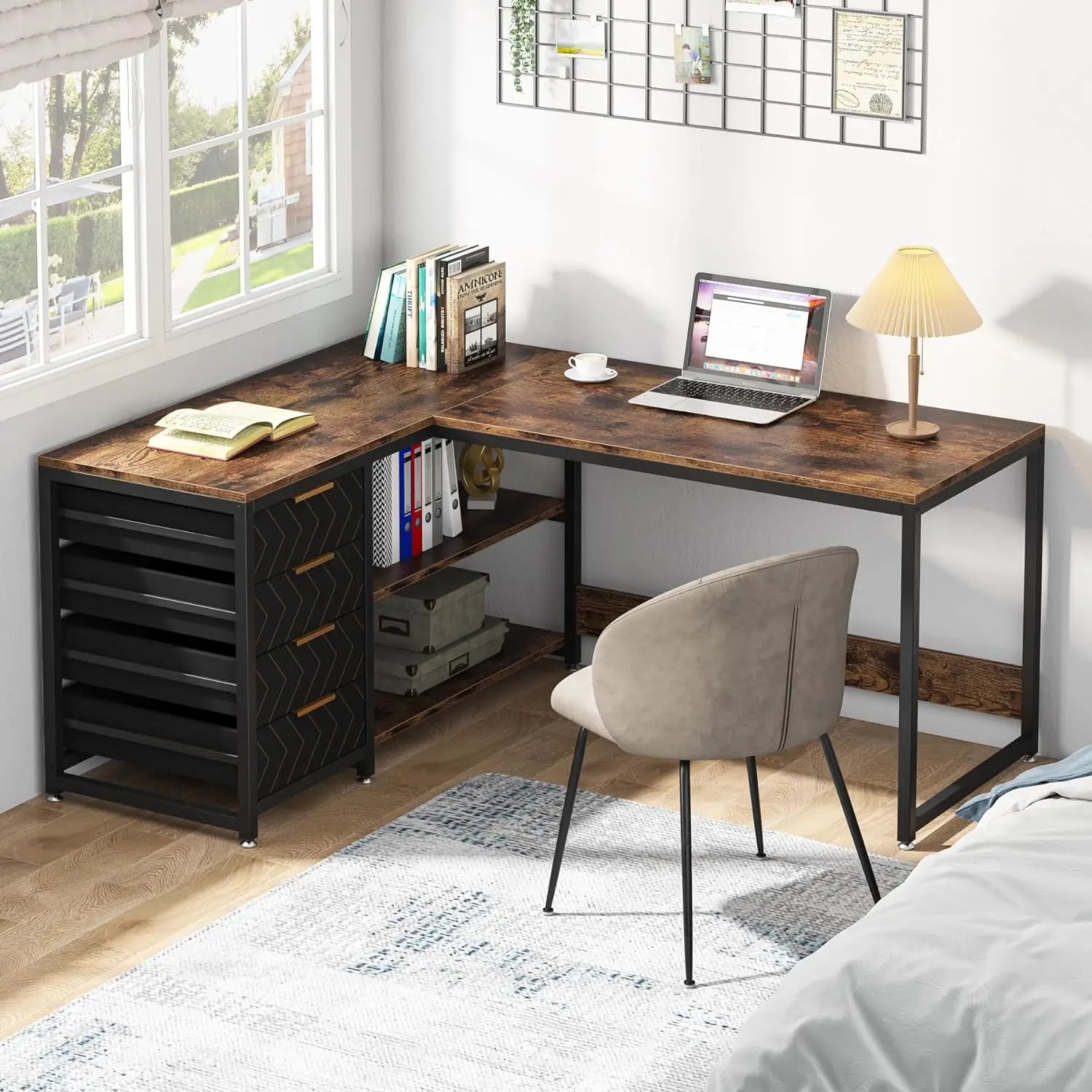 L-förmiger Computertisch mit Schubladen, 59-Zoll-Eckschreibtisch mit Regalen, Arbeitszimmer-Schreibtisch für das Heimbüro