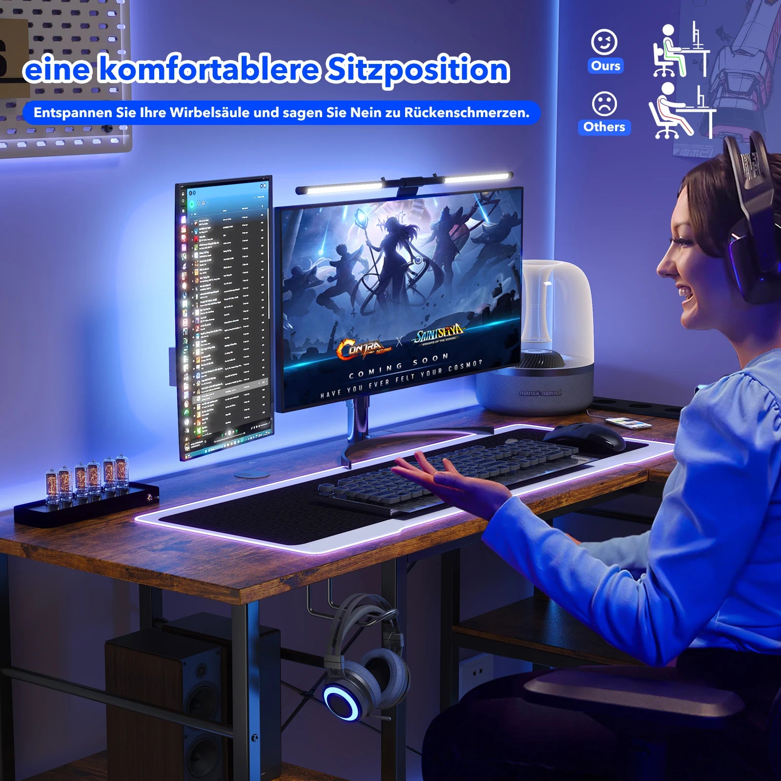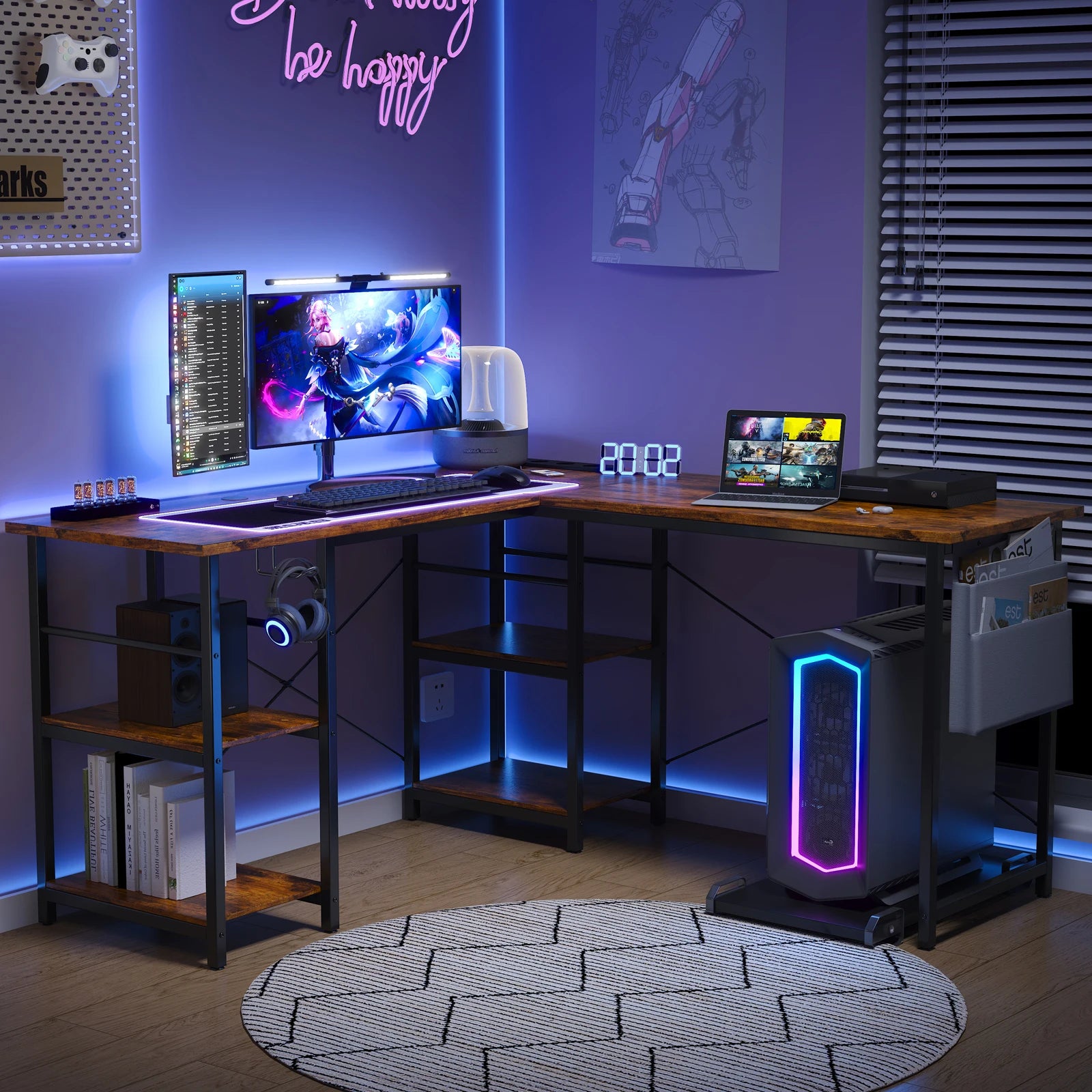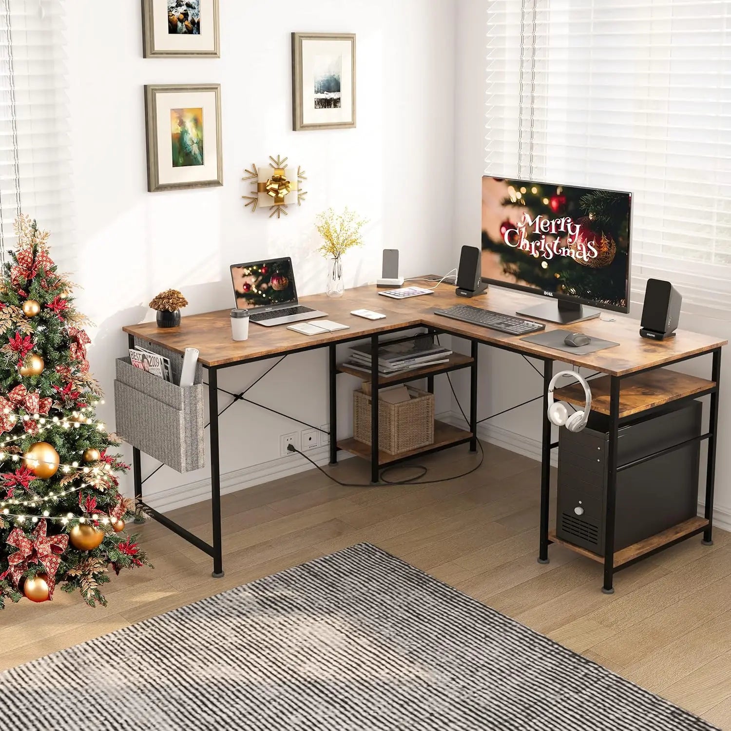 L-förmiger Schreibtisch im Industrial-Stil, 140/230cm, Verstellbarer Computertisch mit Ablagen & Integrierter Steckdose
