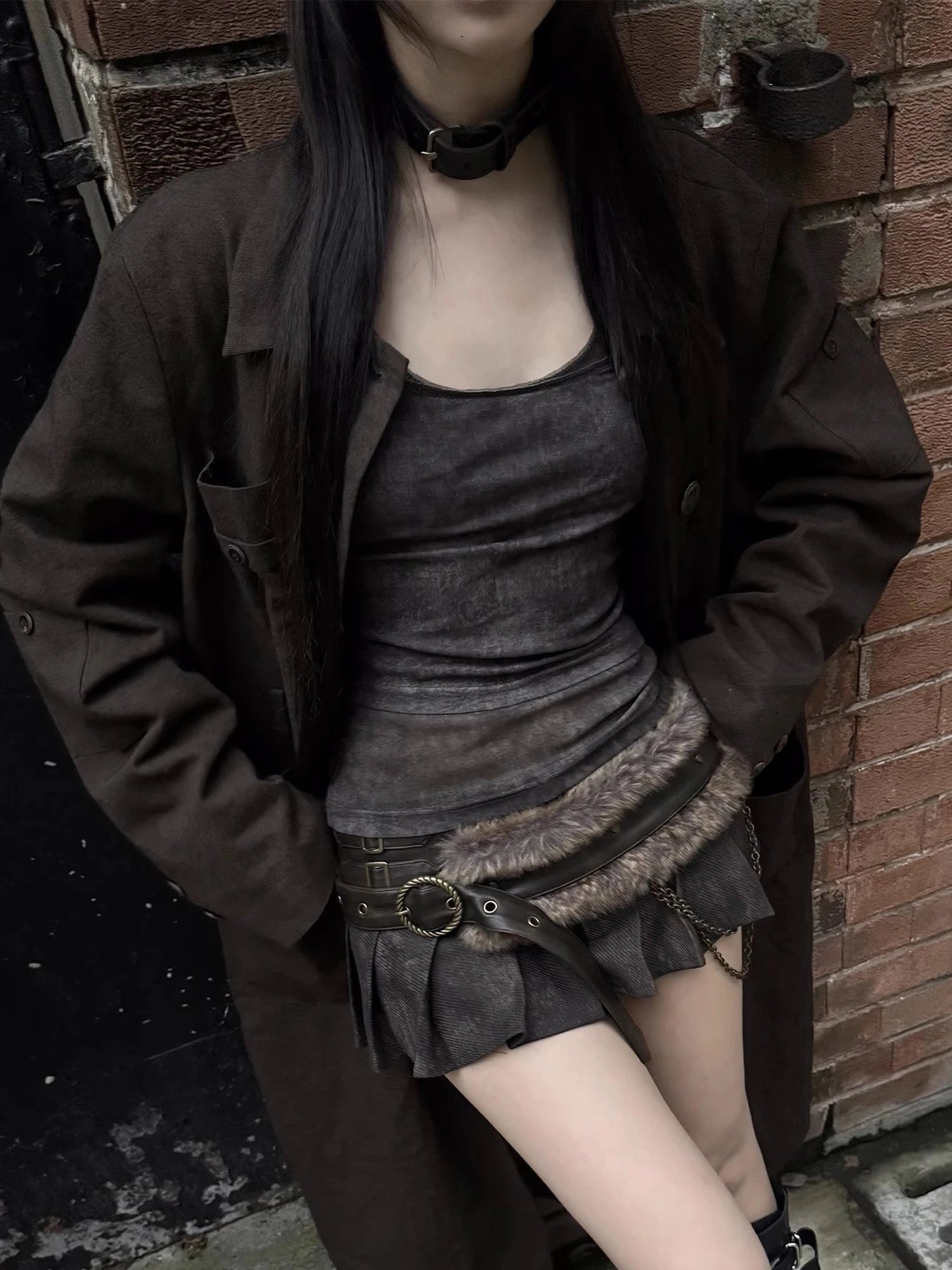 Lautaro Spring Summer Cool Washed Distressed Soft Pu Leather Mini Pleated Skirt Women High Waist Belt Luxury Designer Clothes