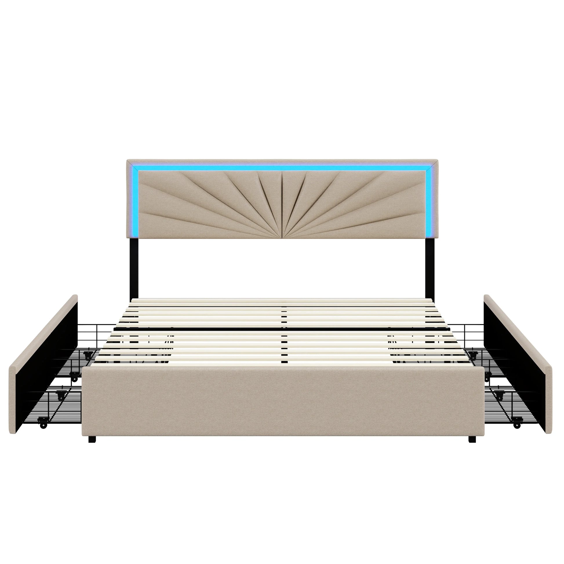 Lazyspace Beige-Leinen-Polsterbett, Doppelbettrahmen, Stauraumbett mit 4 Schubladen und höhenverstellbarem Kopfteil mit RGB-LED
