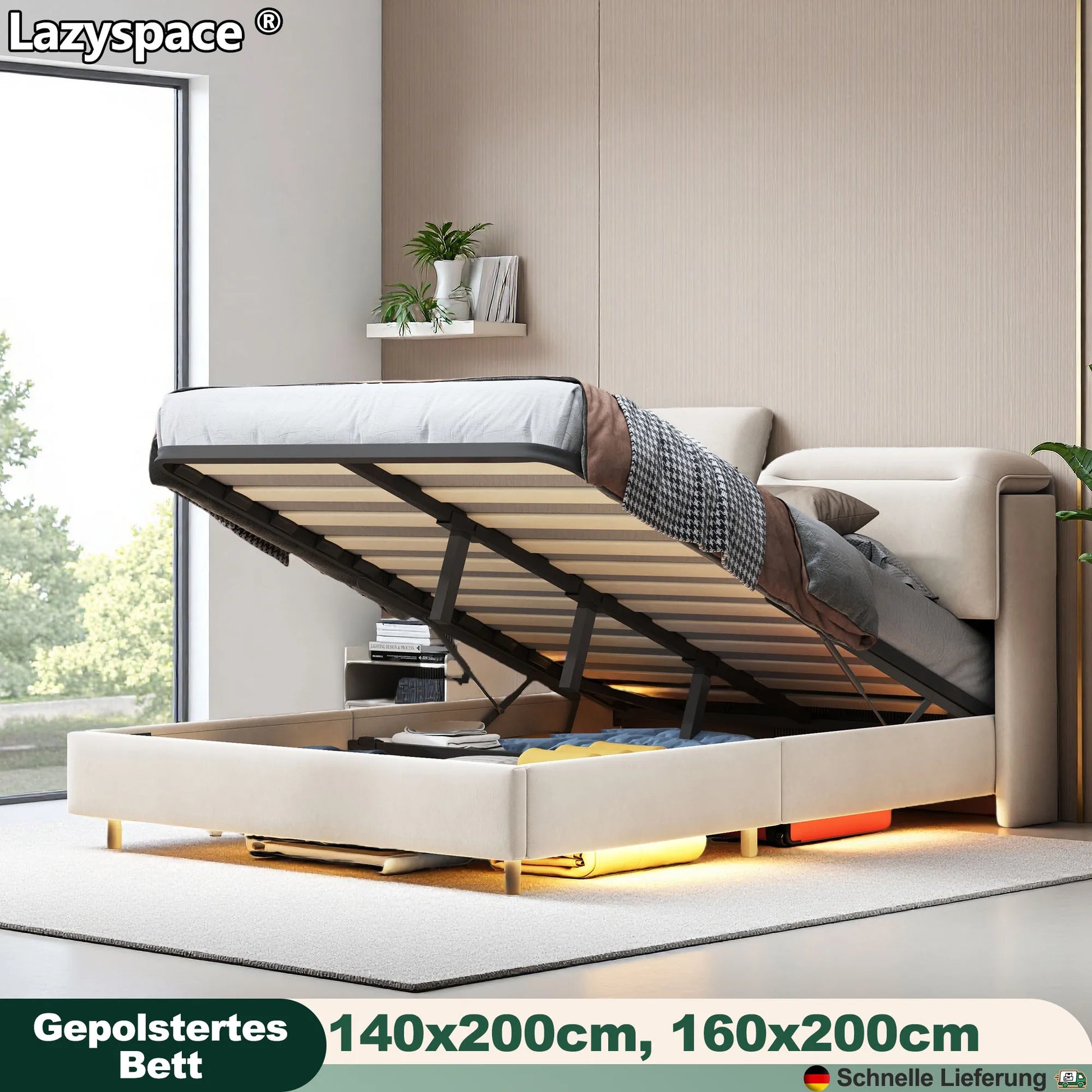 Lazyspace Samt gepolstertes Bett, Doppelbettrahmen, hydraulisches Bett mit Stauraum, verstellbarem Kopfteil und LED-Beleuchtung unter dem Bett