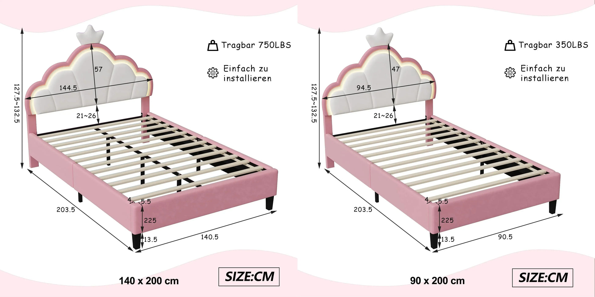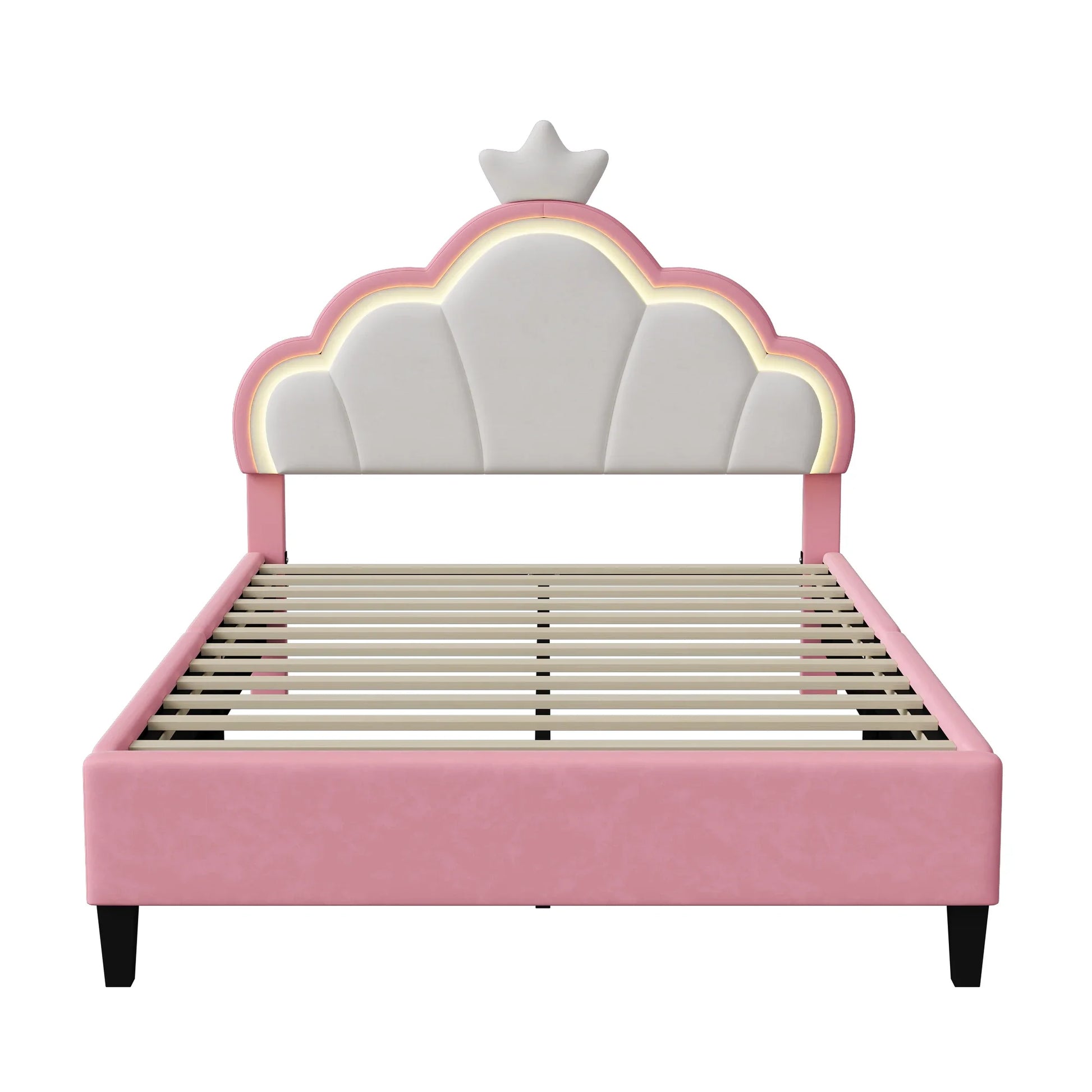 Lazyspace Samt-Polsterbett, LED-Kopfteil in Wolkenform mit dekorativer Krone, rosa Bettrahmen für Mädchen