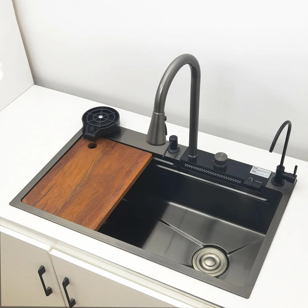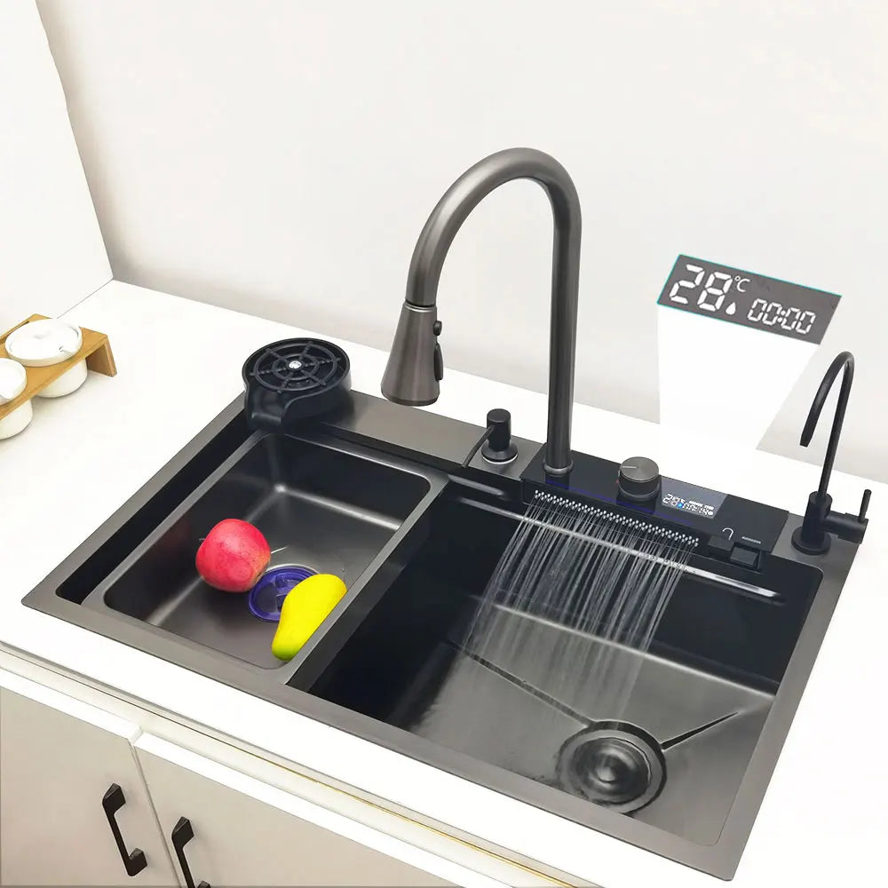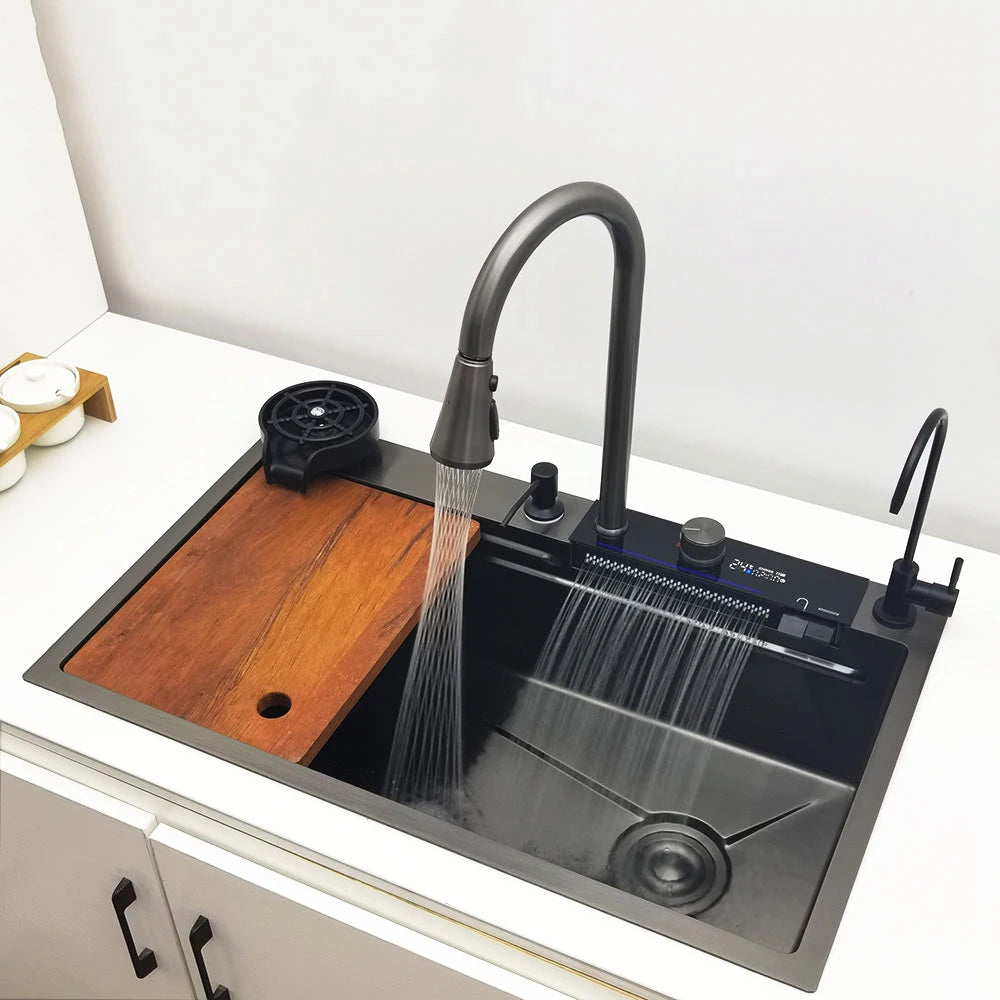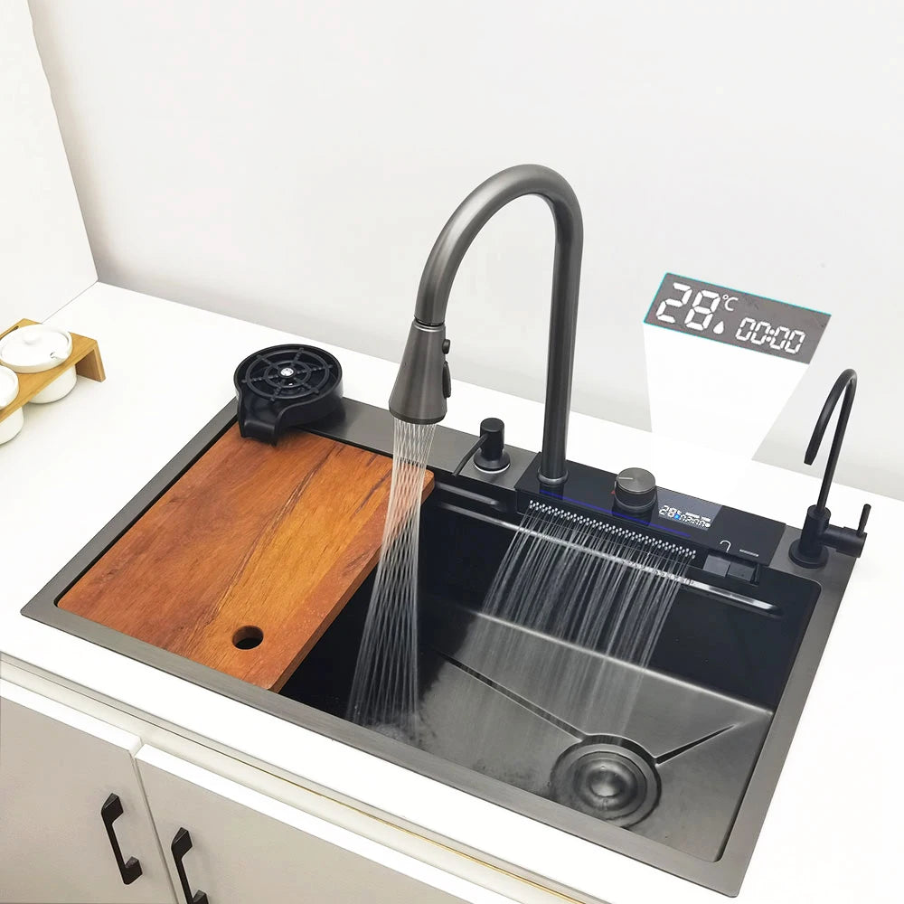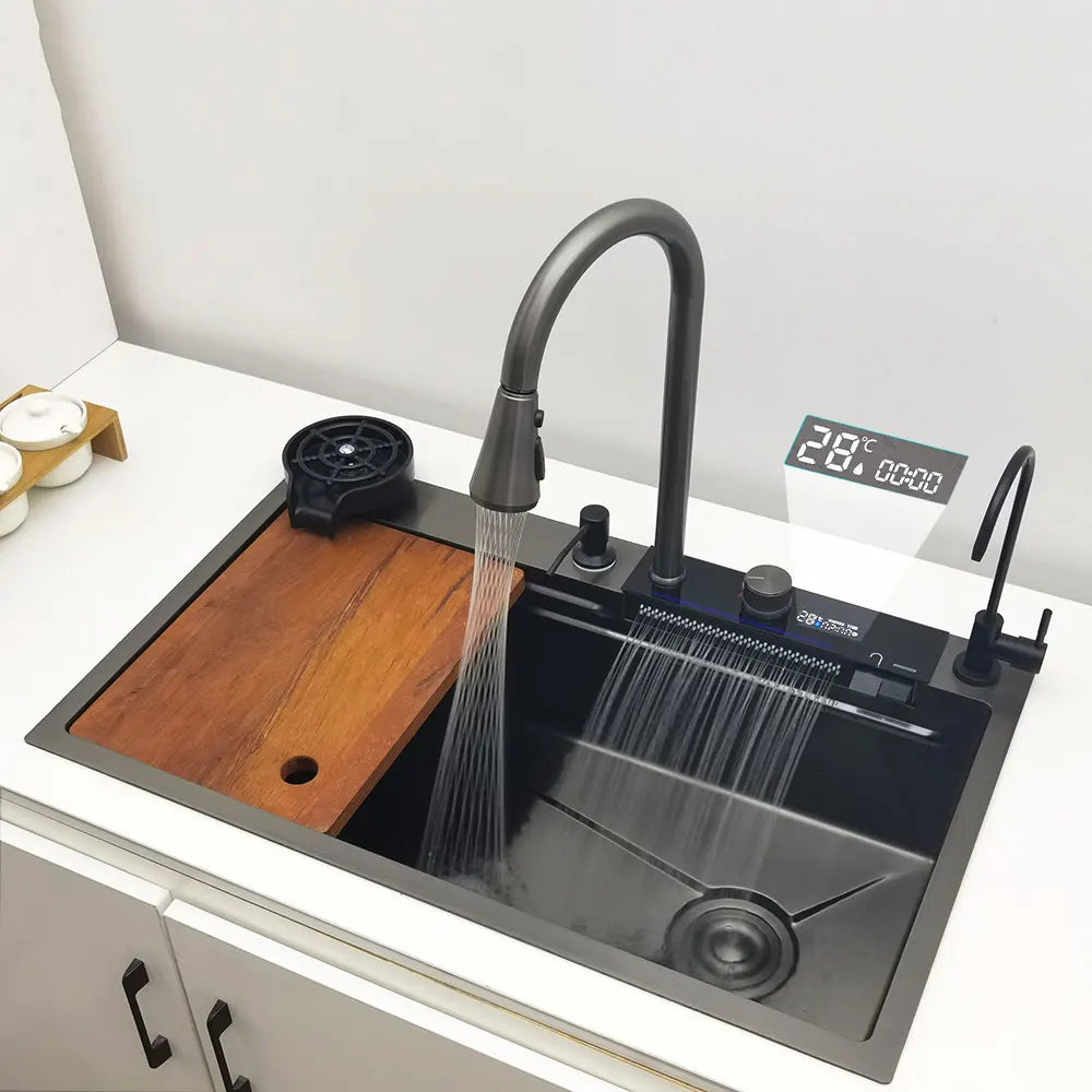 LED-Wasserfall-Küchenspüle, Spüle aus Edelstahl 304, großes Einzelbecken mit Multifunktions-Wasserfall-Wasserhahn über der Theke