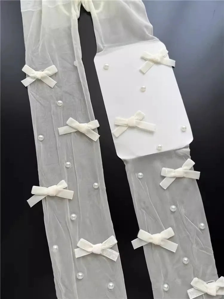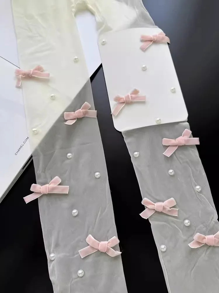 Lolita Pink Velvet Bow Embroidery Pearl Tights Pantyhose Fashion Women Tights JK Lolita Styles Sweet Girls Kawaii Cute Stocking
