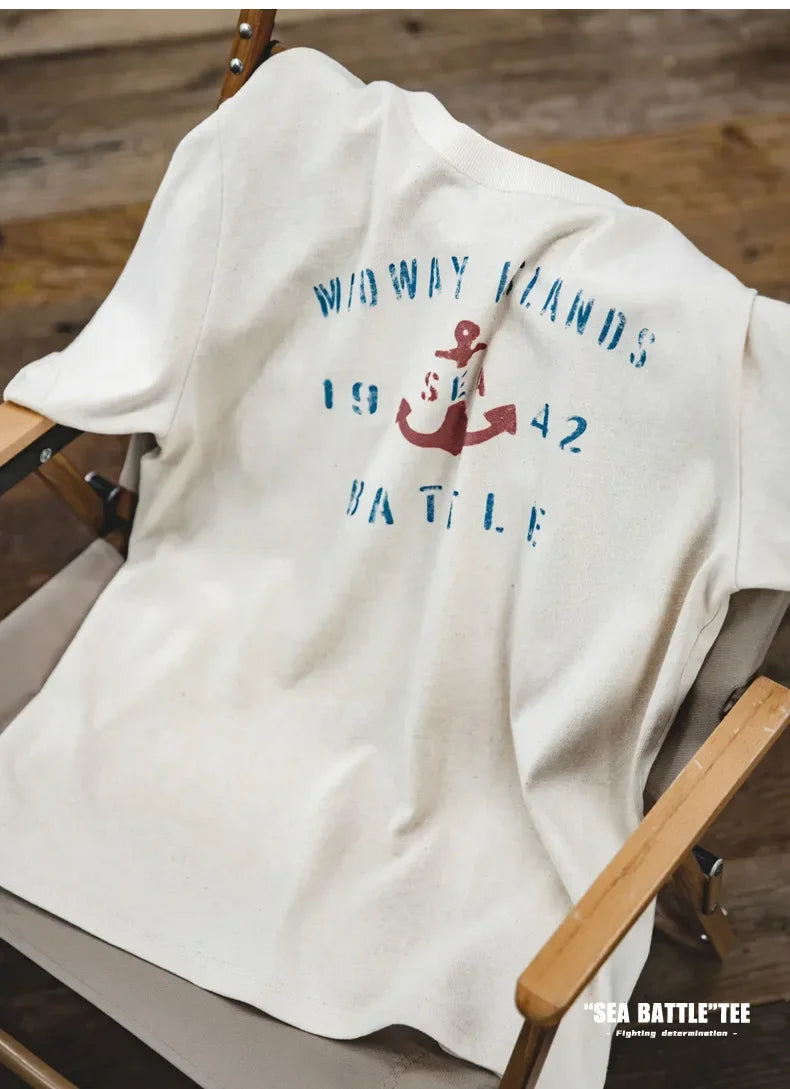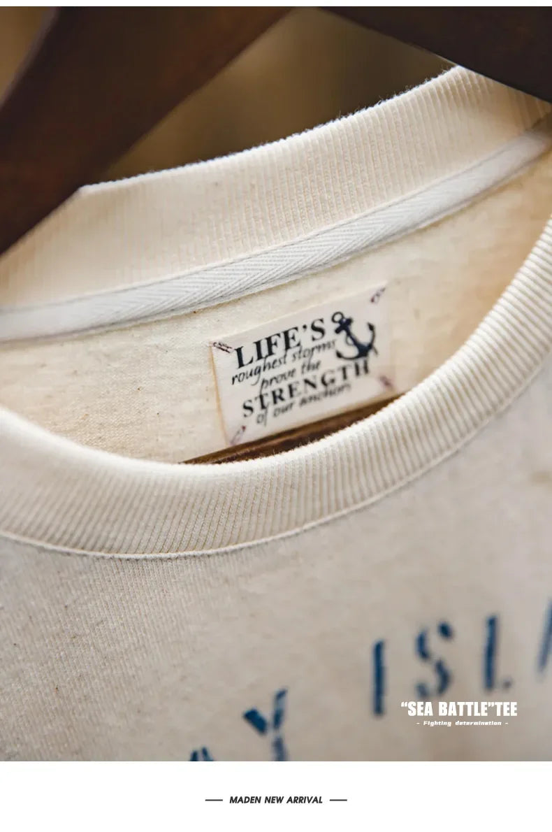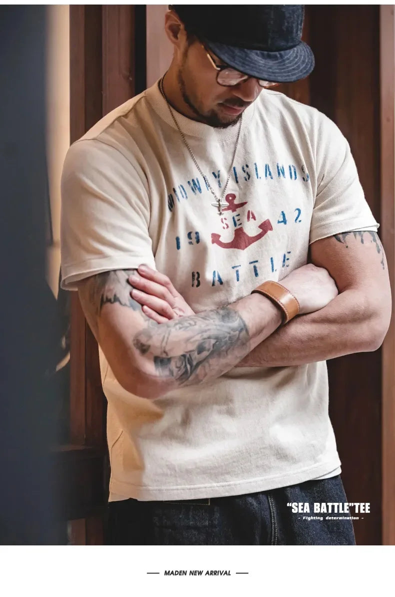Maden Vintage Letter Print Cotton Short Sleeve T-Shirt Men's Summer Loose Fit Ribbed Crew Neck Tee Casual Street Tops for Daily