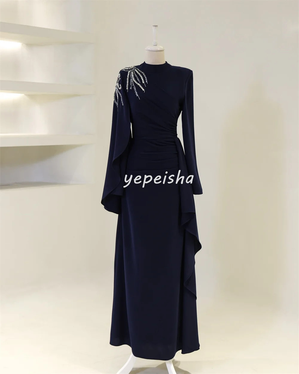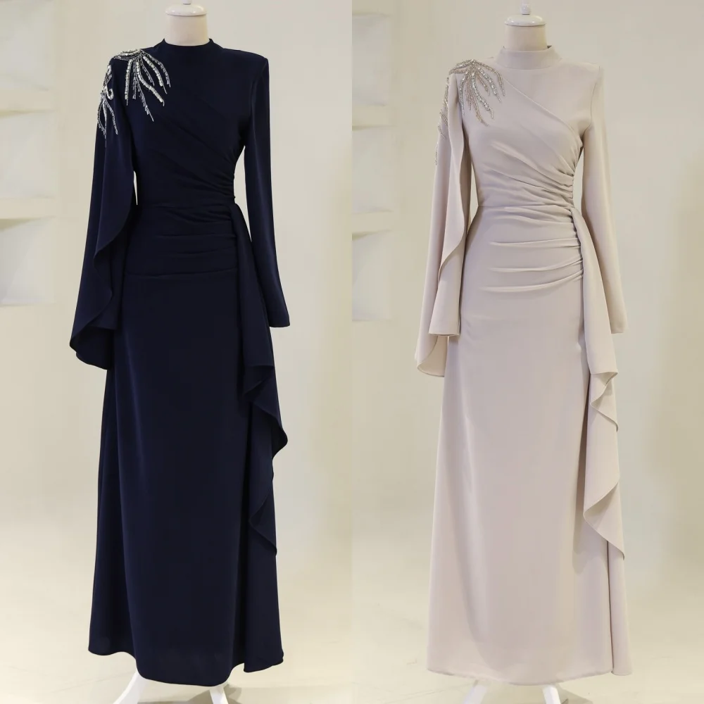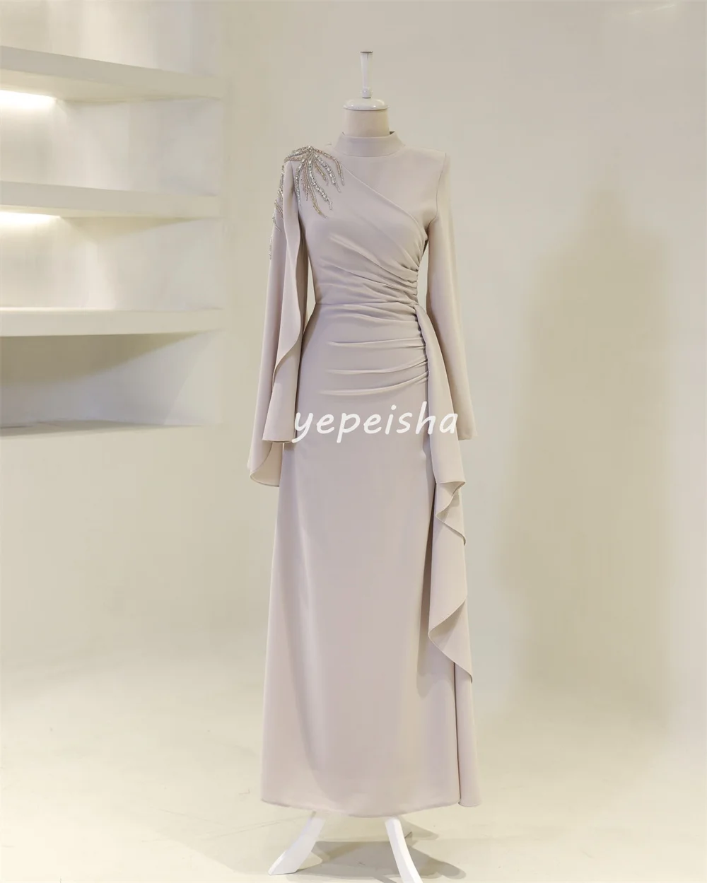 Maßgeschneiderte glitzernde Jersey-Falten, gerüscht, drapiert, mit Perlen besetzt, mit Pailletten, gerader, hoher Kragen, lange Kleider, maßgeschneiderte Anlasskleider im Retro-Stil