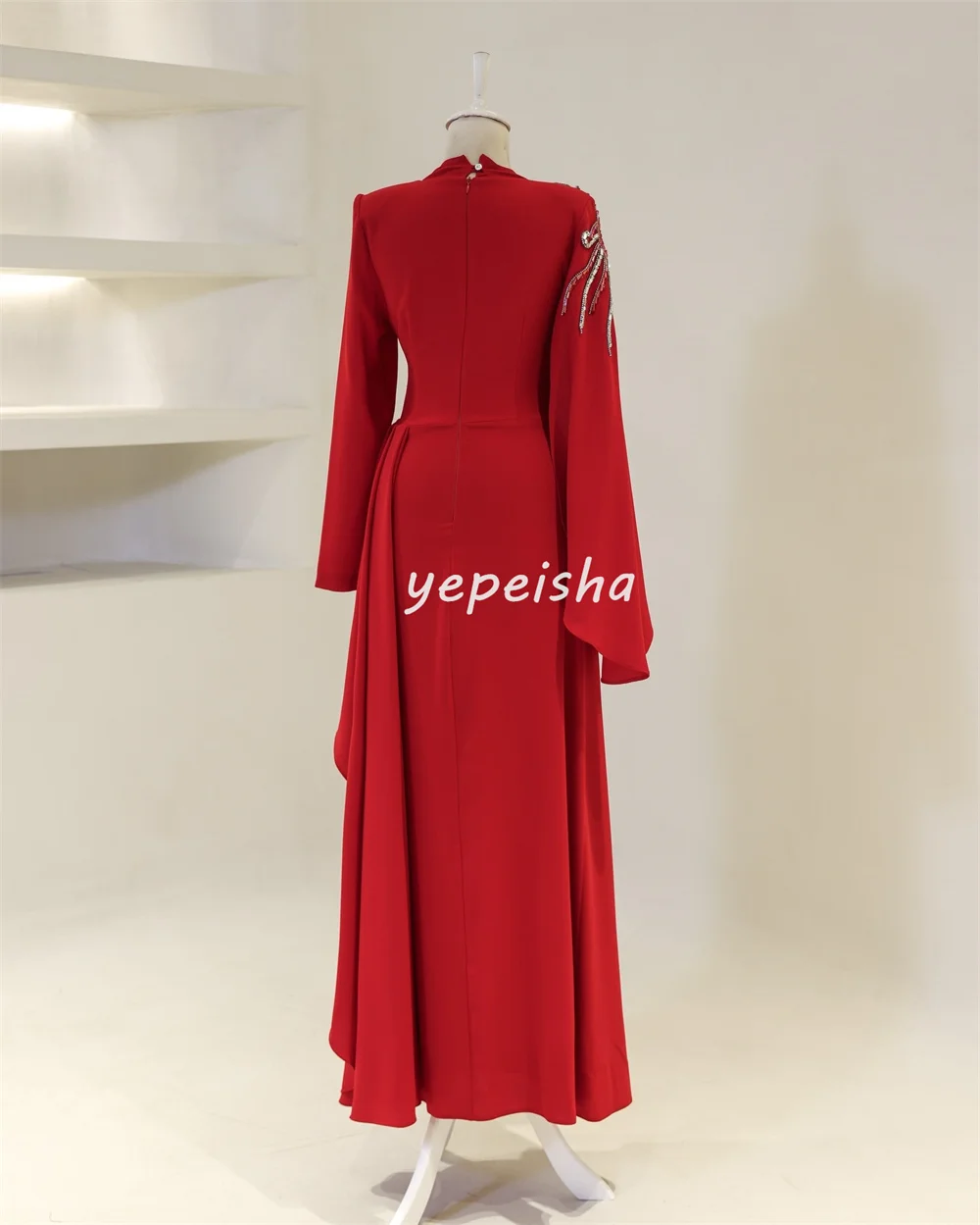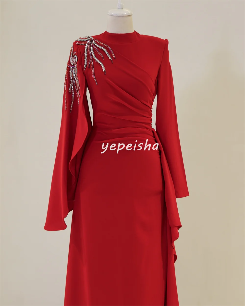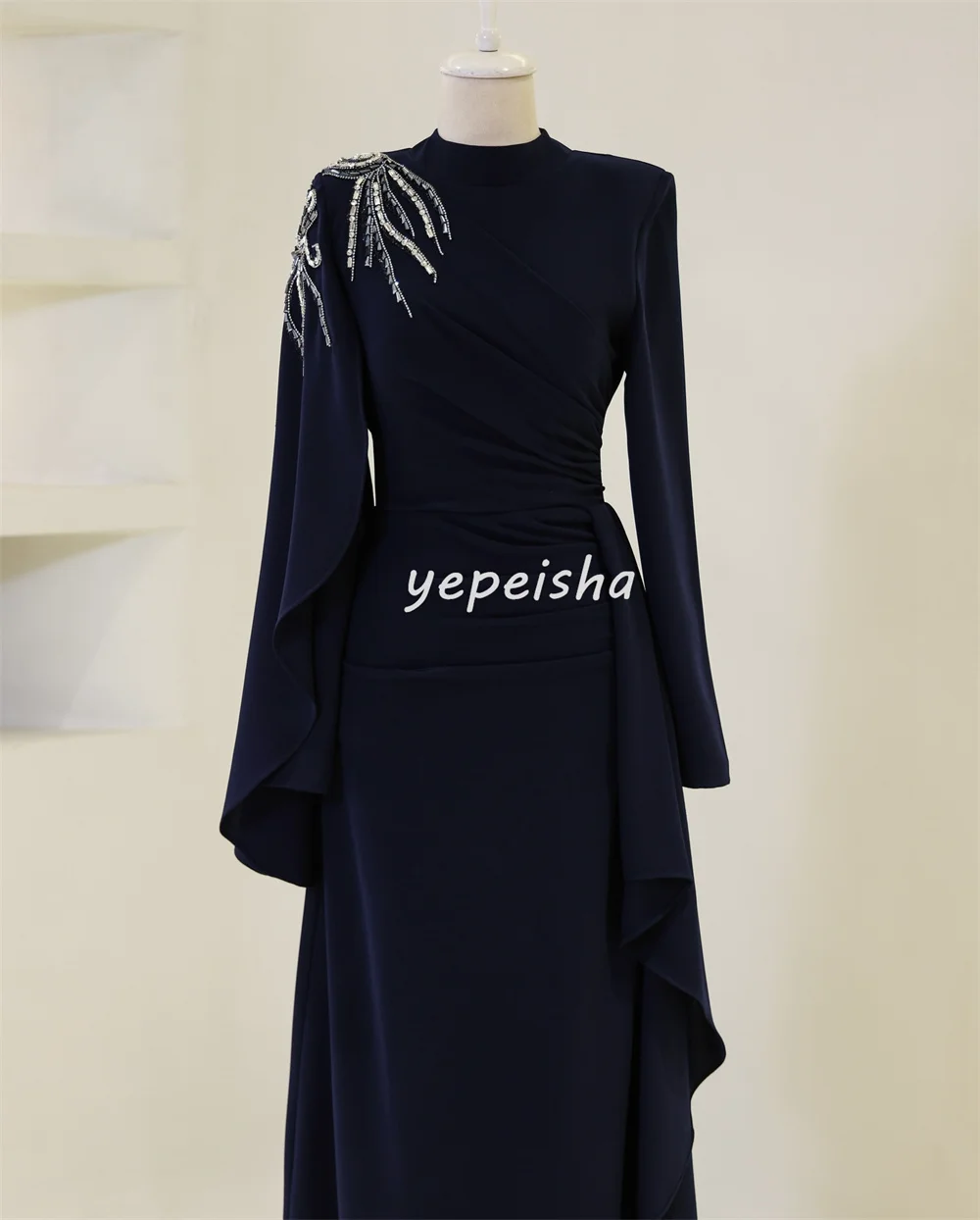 Maßgeschneiderte glitzernde Jersey-Falten, gerüscht, drapiert, mit Perlen besetzt, mit Pailletten, gerader, hoher Kragen, lange Kleider, maßgeschneiderte Anlasskleider im Retro-Stil
