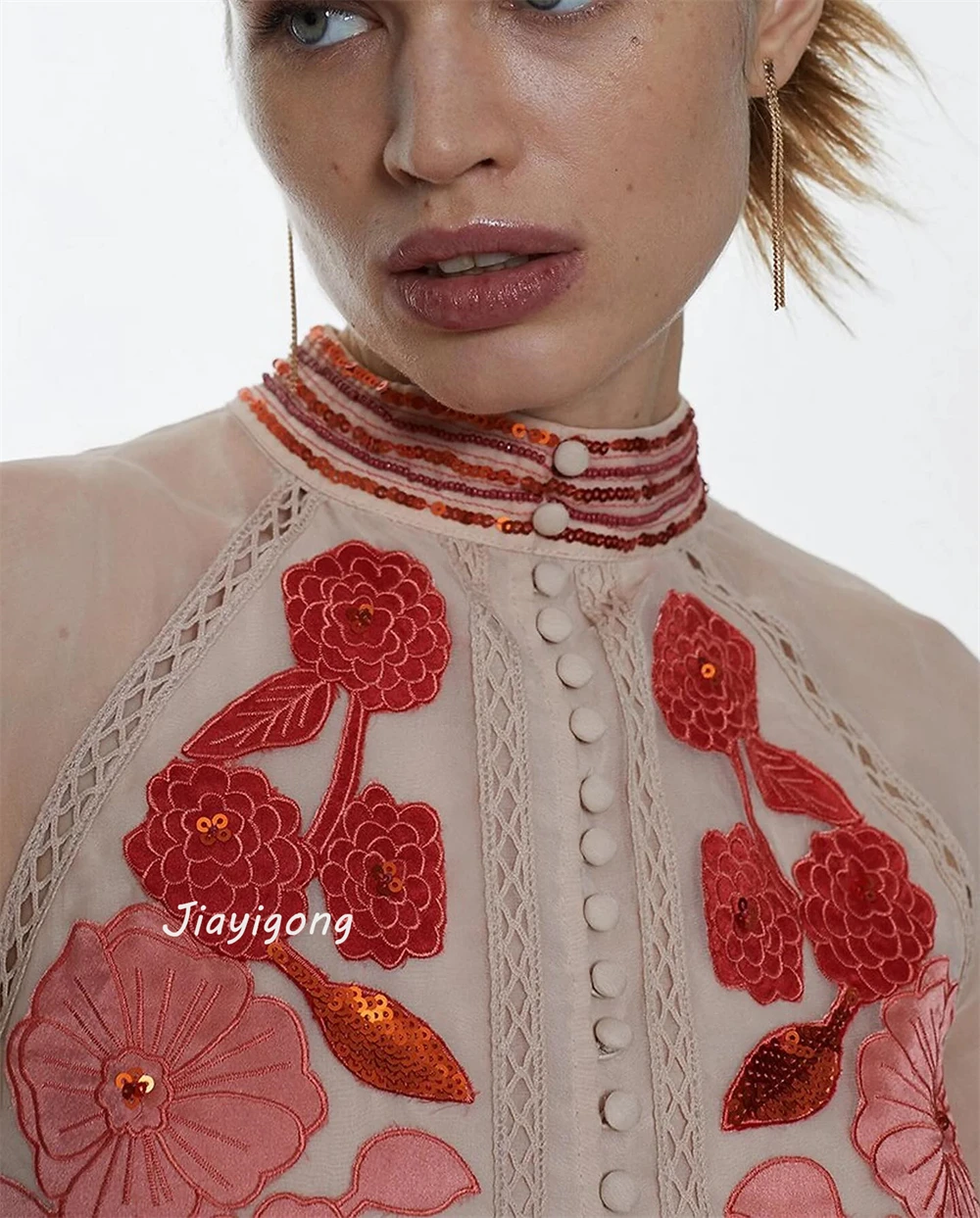 Maßgeschneiderte Jiayigong-Abschlussball-Kleider mit exquisitem Stehkragen, A-Linie, Blumen und Knöpfen aus Organza, maßgeschneiderte Anlasskleider