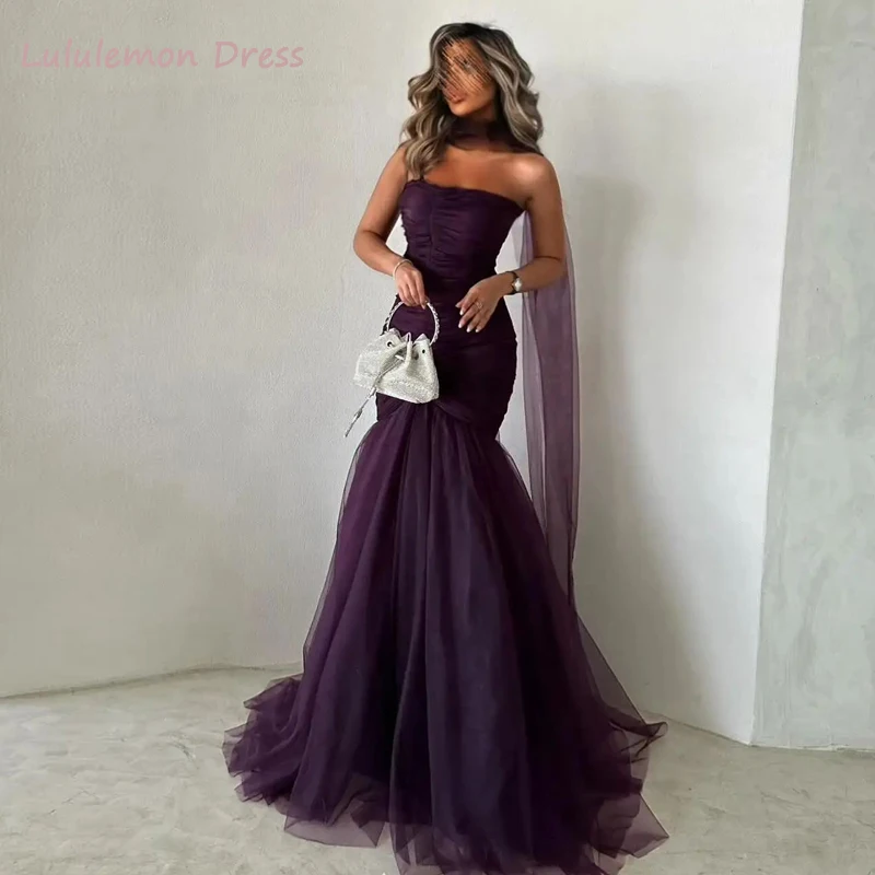 Maßgeschneiderte lila Abendkleider, bodenlang, Party, Meerjungfrau, lange Seidenschals, Robes de Soirée, trägerloses Hochzeitskleid
