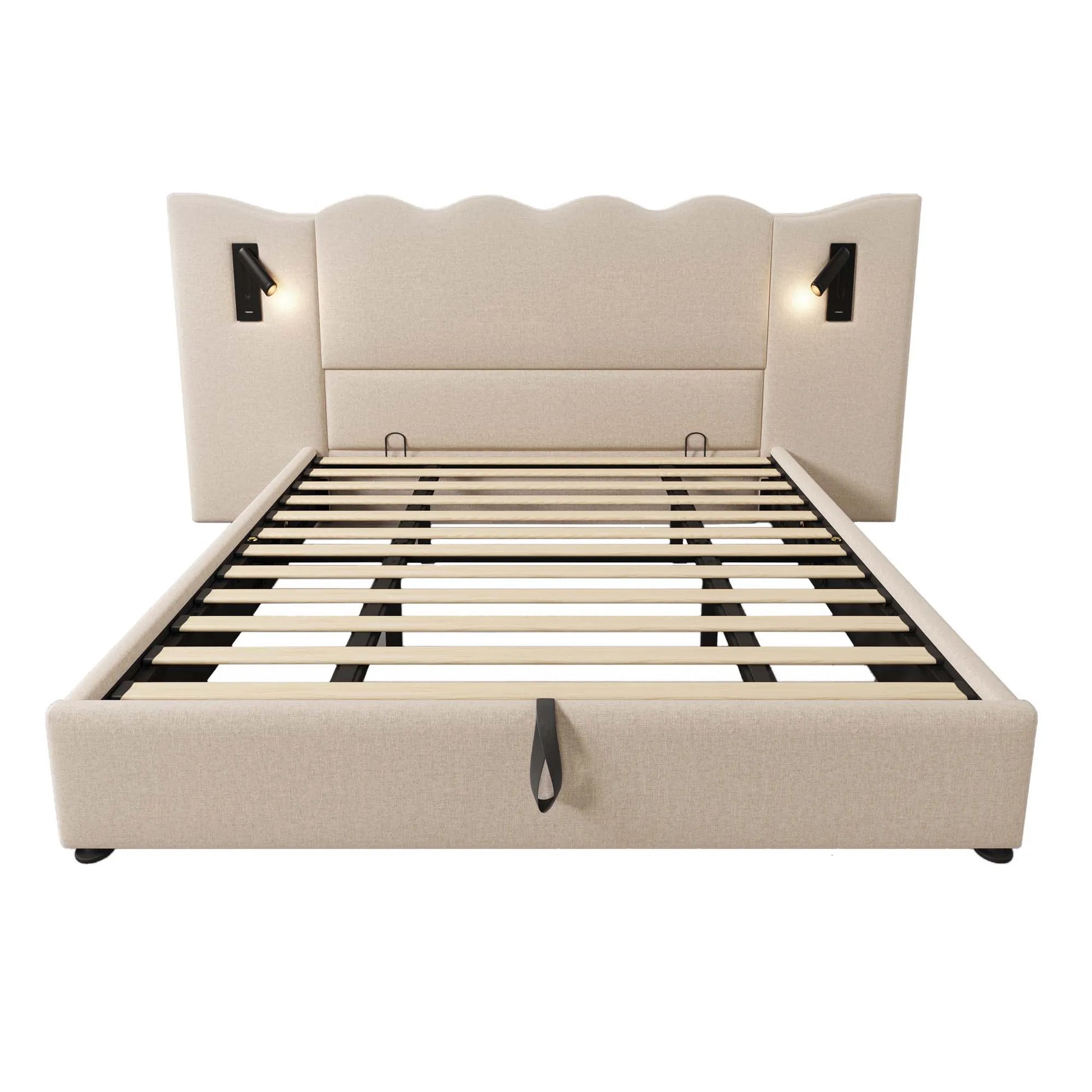 Merax Polsterbett 180x200 Leselampe USB Ladefunktion Stauraumbett Leinen Beige Holz Metall