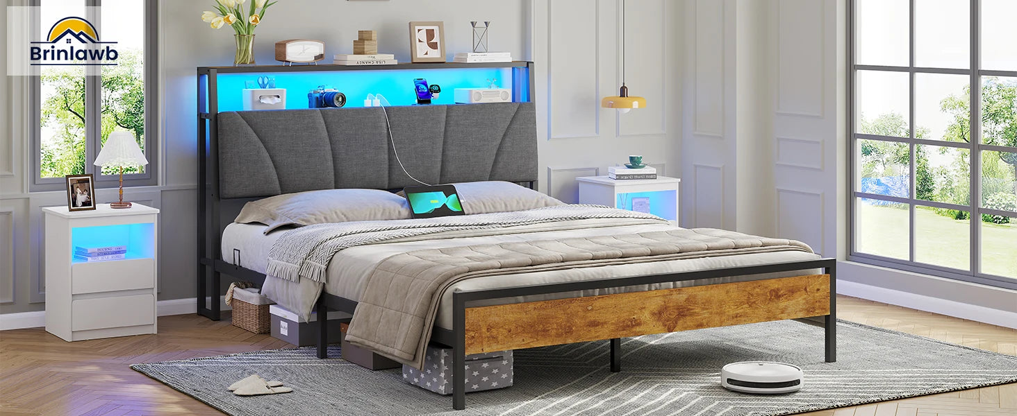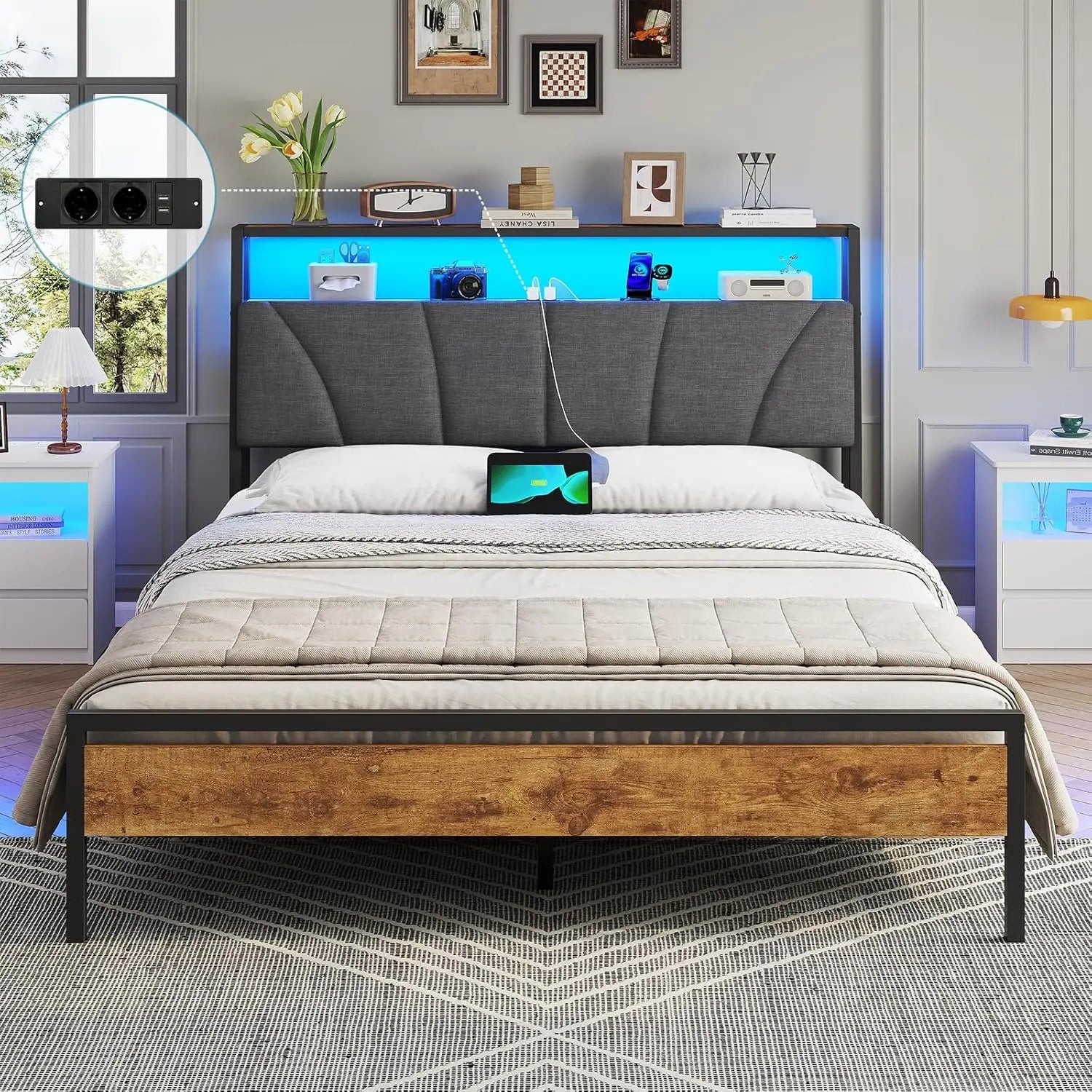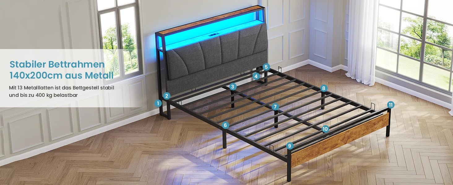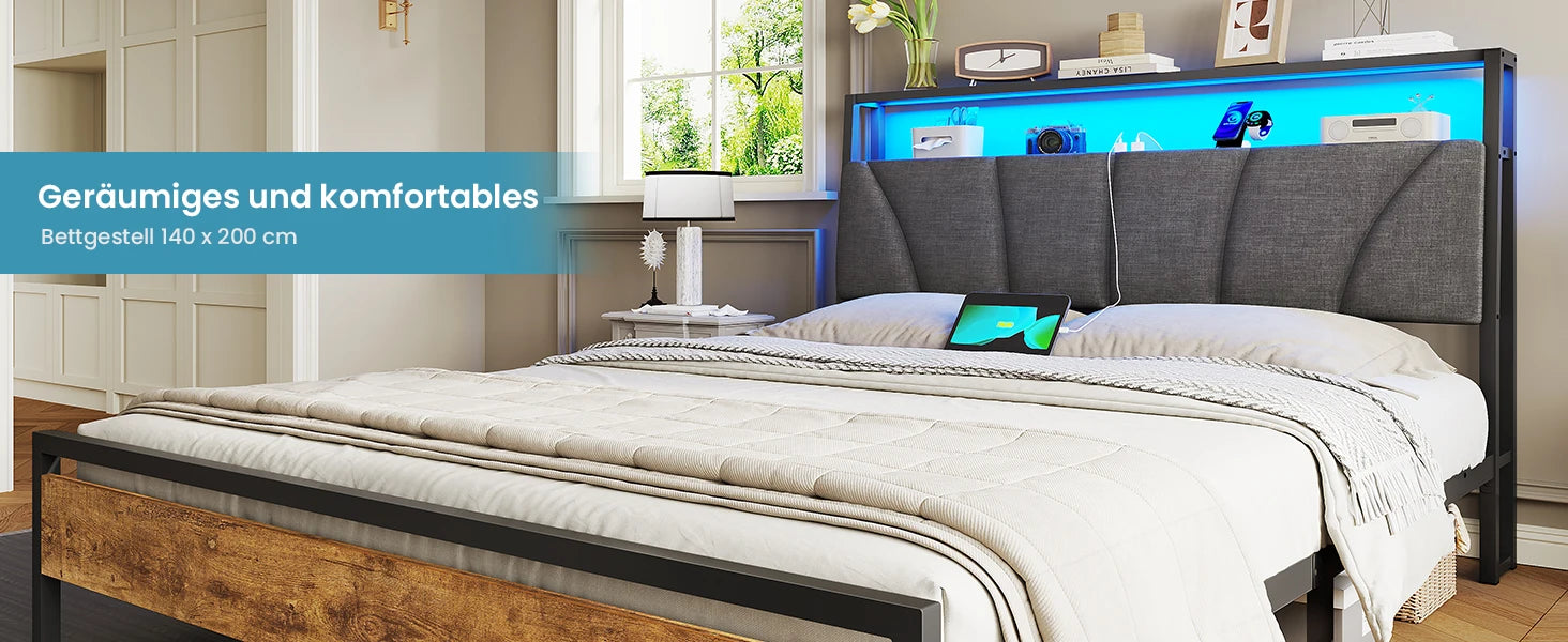 Metallbettgestell 140 x 200 cm mit LED-Beleuchtung, Kopfteil und Ladestation, integriertes Metallbett 140 x 200 mit Gitterbraten