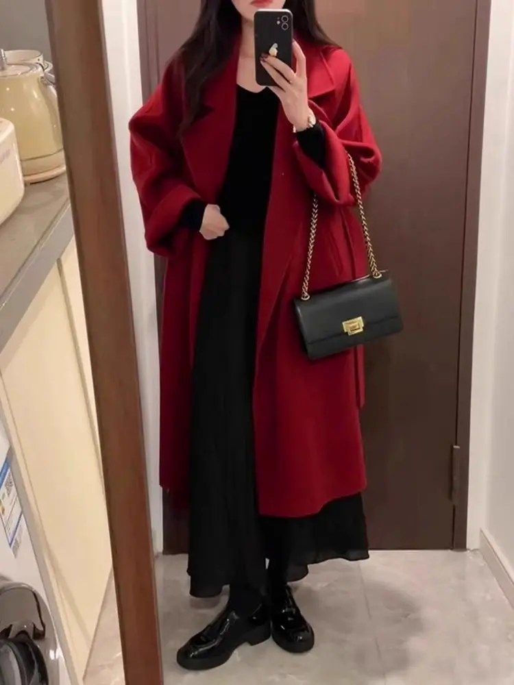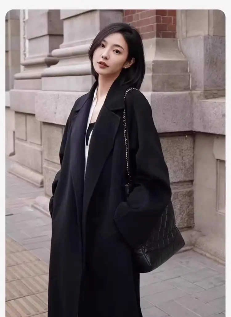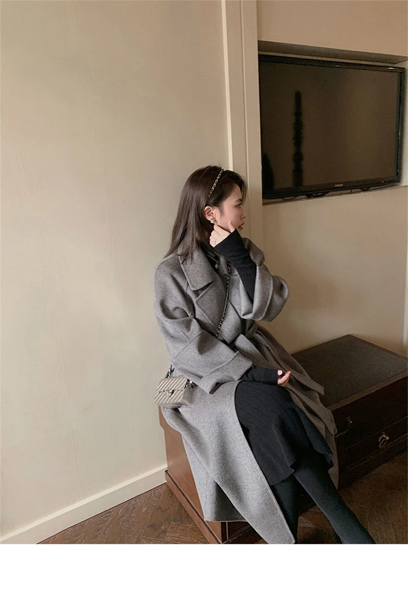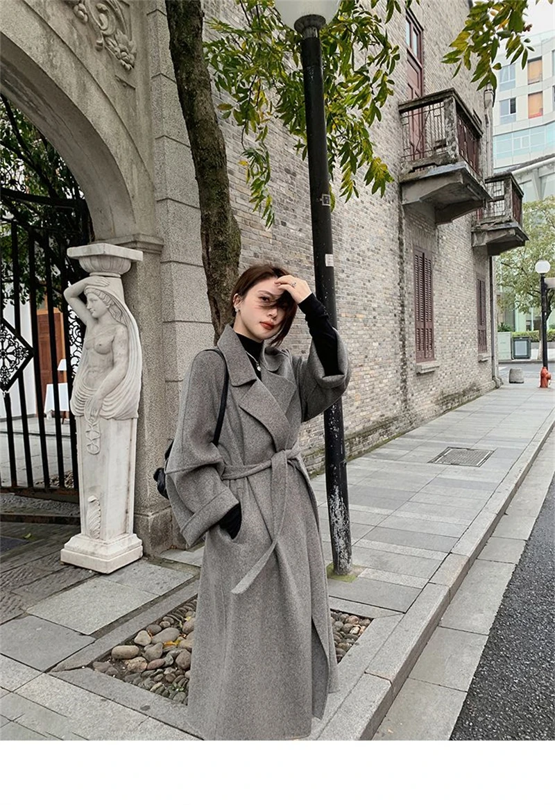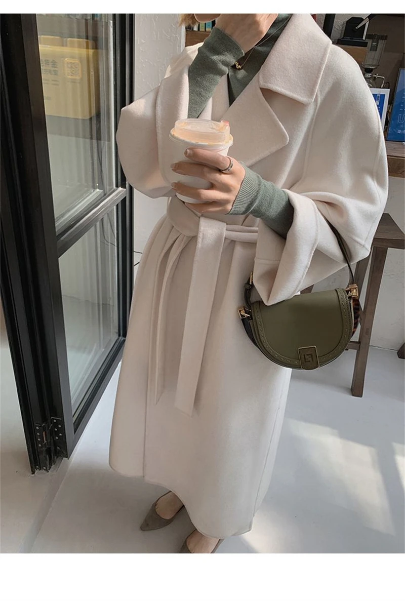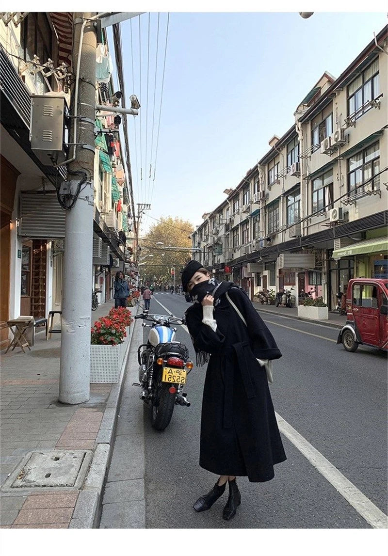 Mode Schwarz Lange Woolen Mantel Mit Gürtel Frauen Lose Revers Mantel Herbst Winter Warme Dame Oberbekleidung High Street