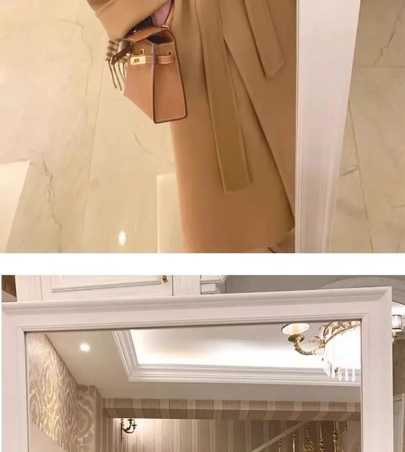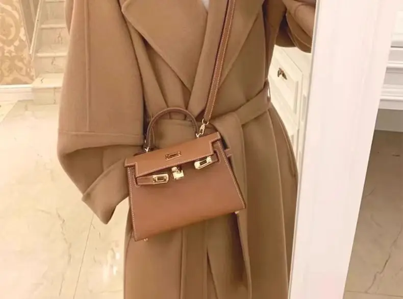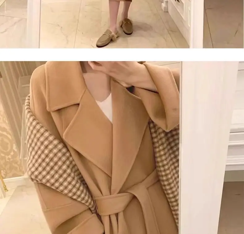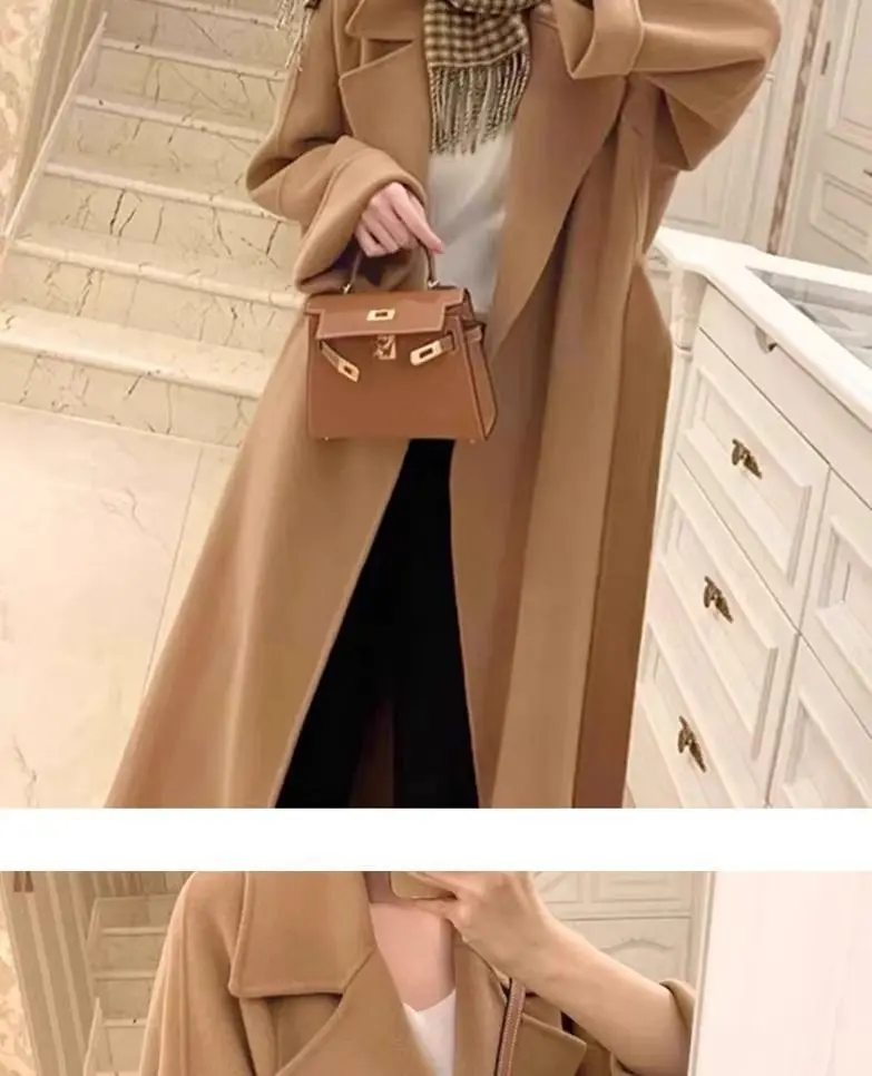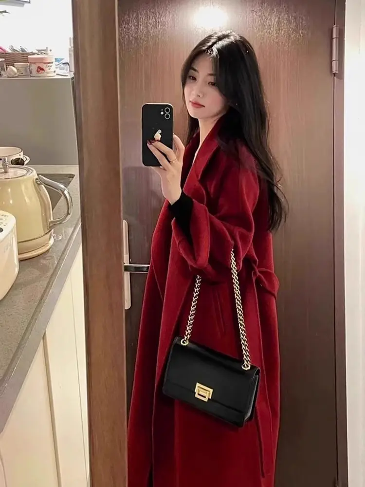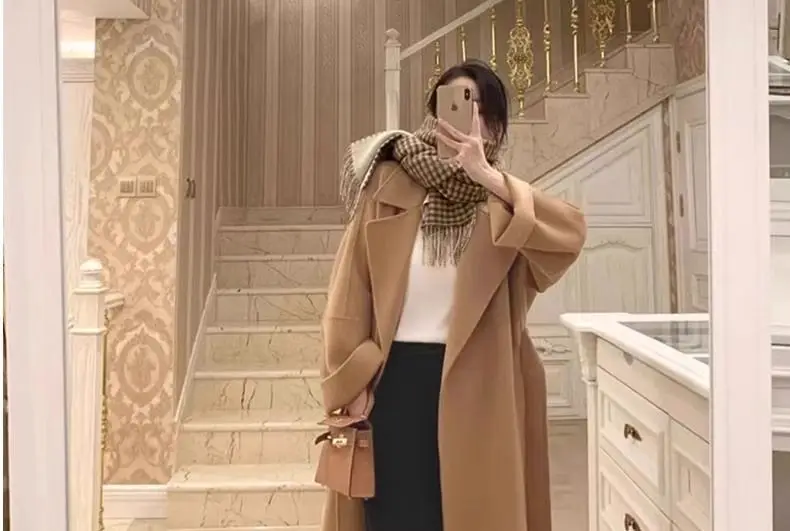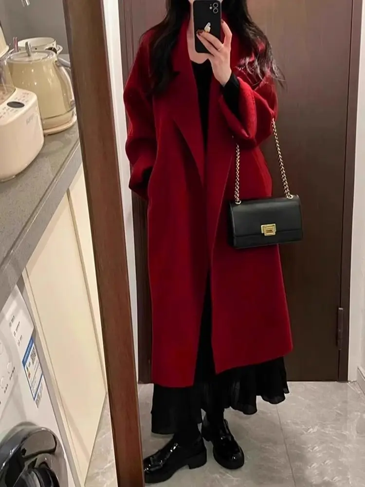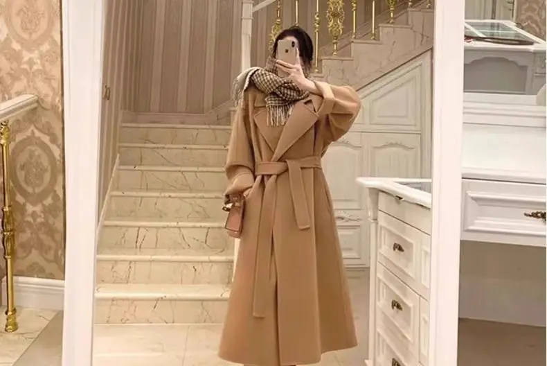 Mode Schwarz Lange Woolen Mantel Mit Gürtel Frauen Lose Revers Mantel Herbst Winter Warme Dame Oberbekleidung High Street