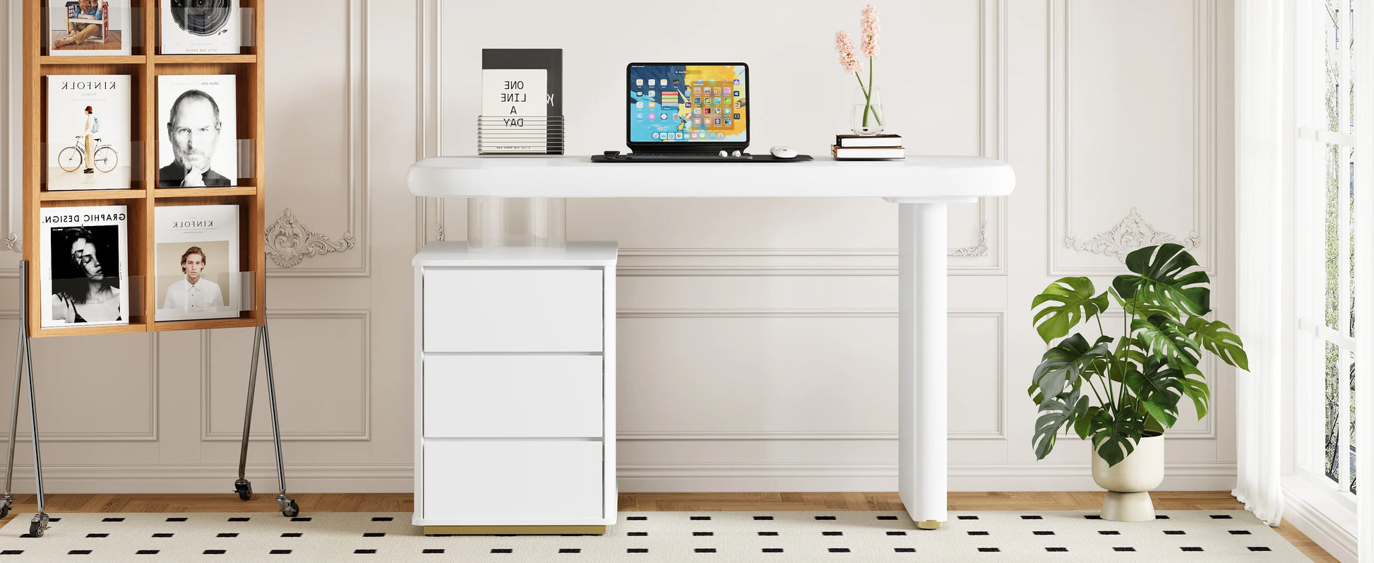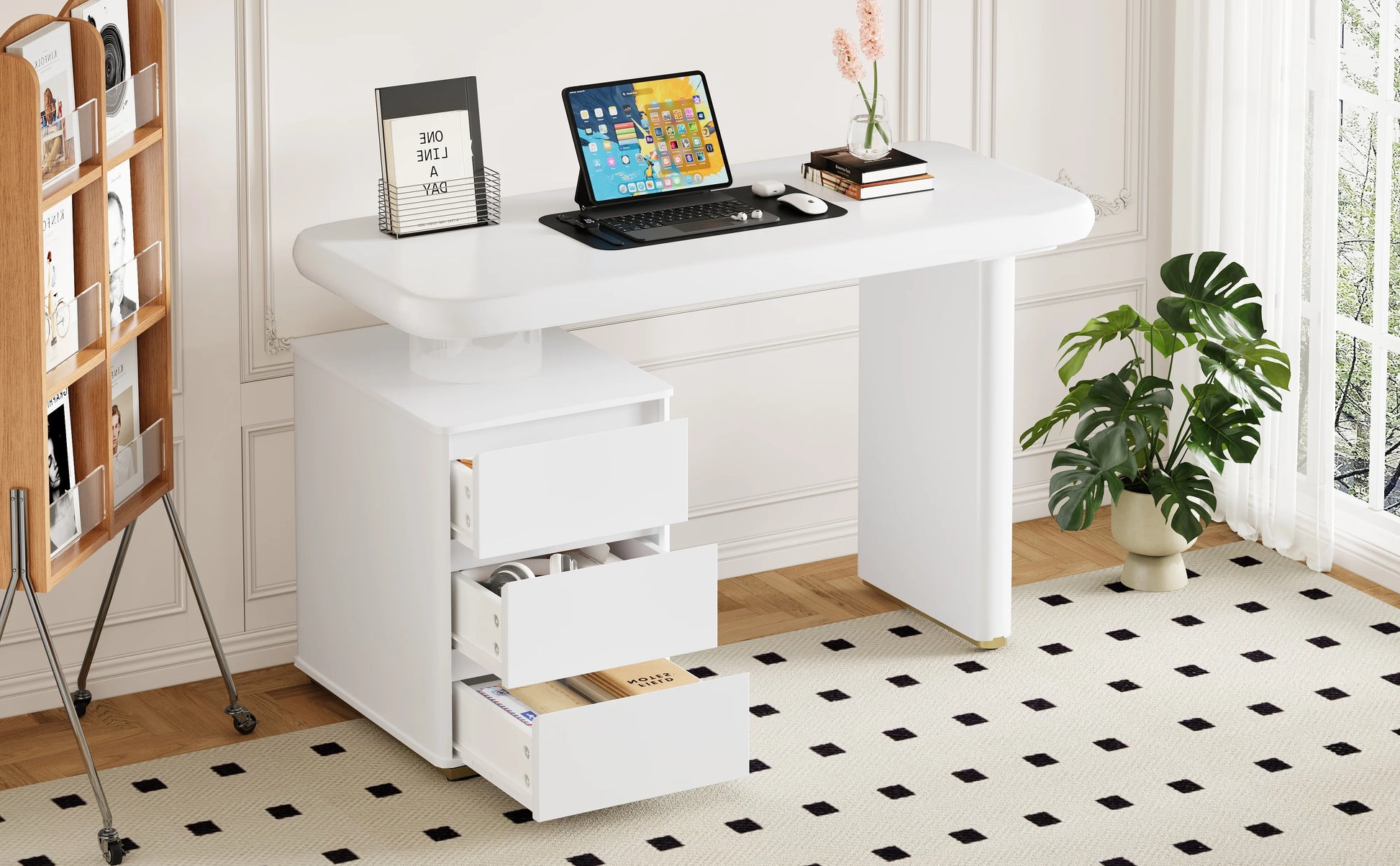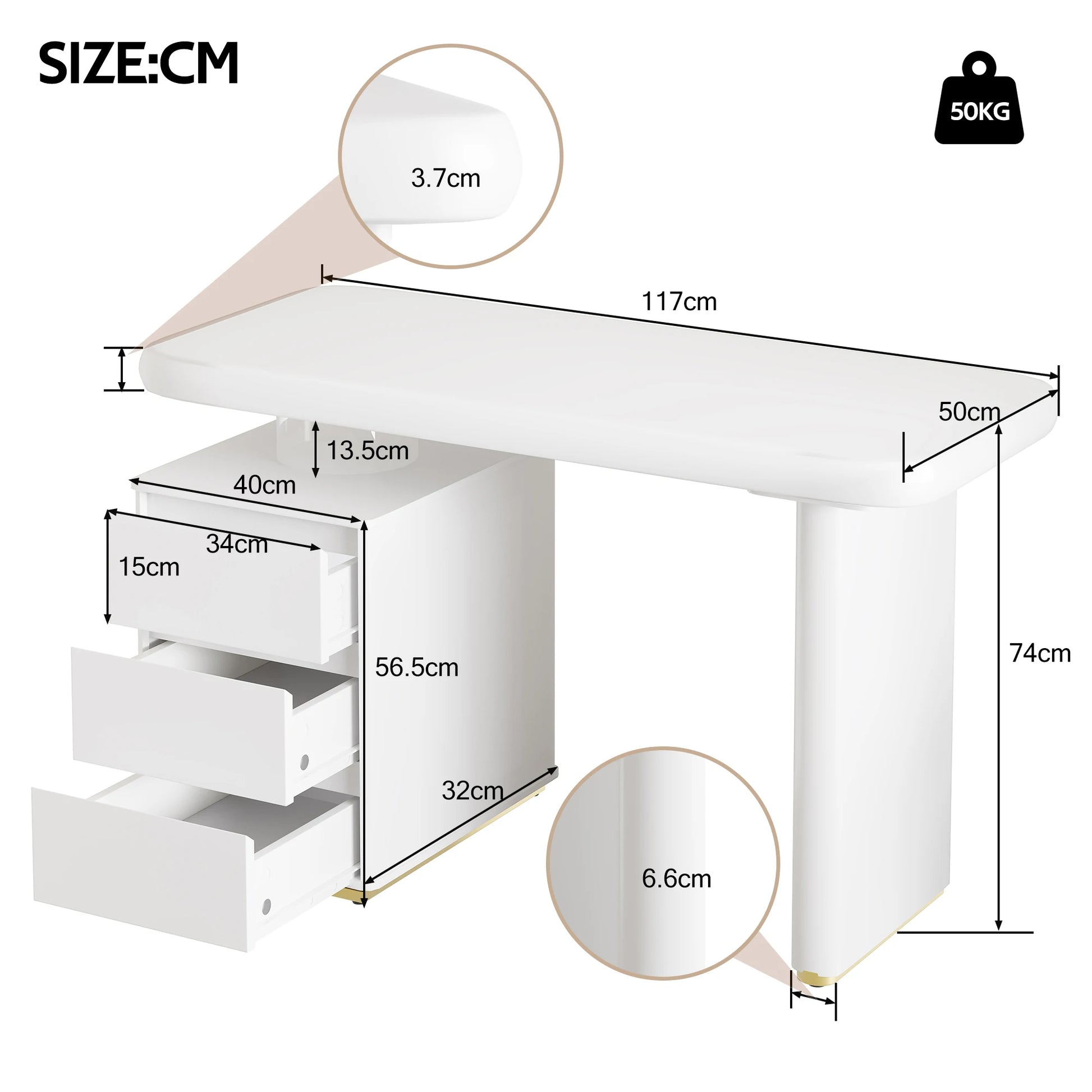 Moderner Schreibtisch 117×50×74 cm – weißes Volllack-Finish, Wolkenform, 3 Schubladen, verdickte Tischplatte und Beine, abgerundete Kurven, stabil
