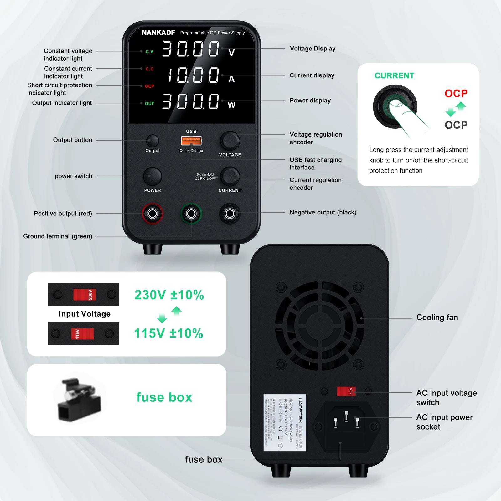 NANKADF Lab Bench Power Supply 30V 10A Switching Power Supply Unit 30V 5A Adjustable Source 60V 5A Voltage Stabilizer 120V 3A
