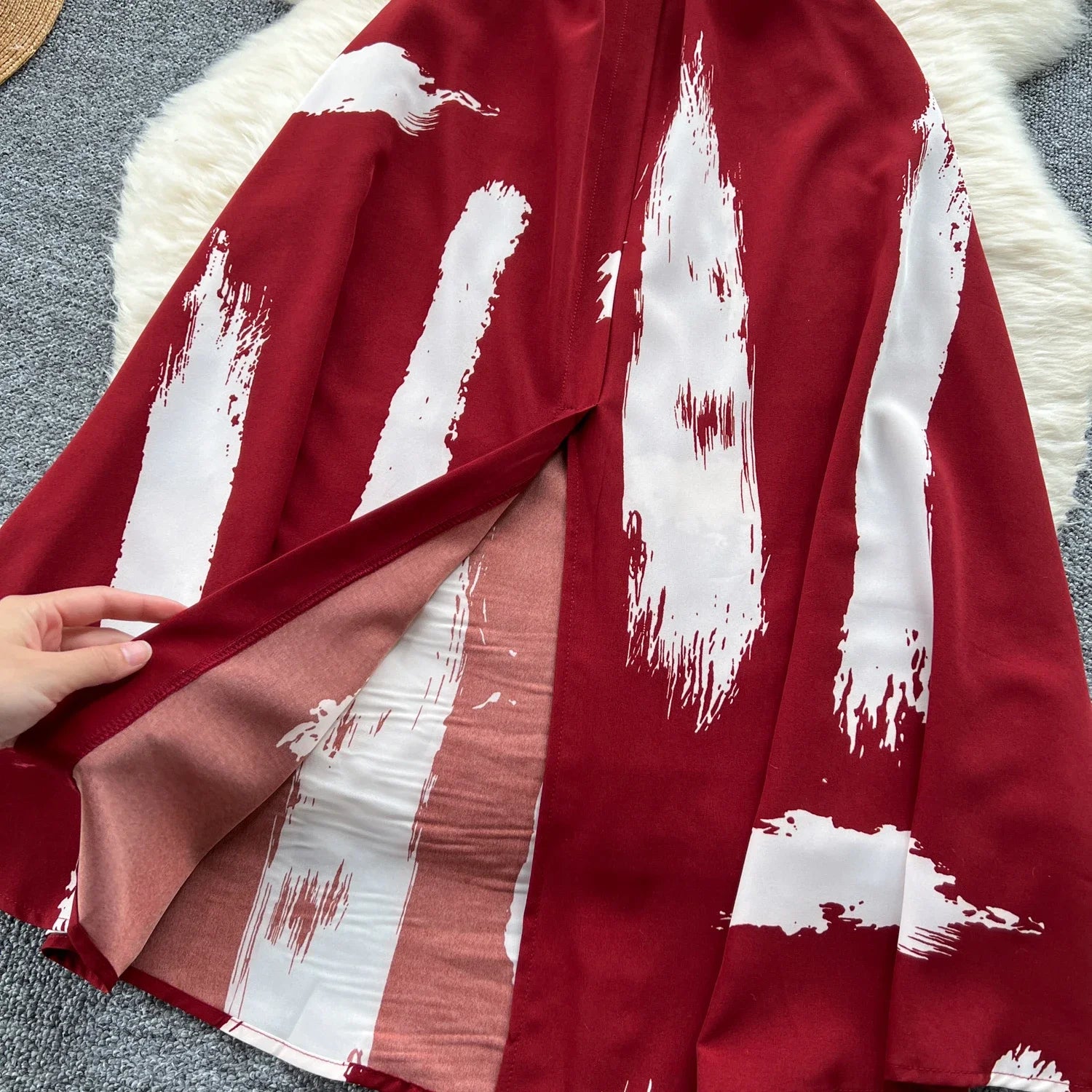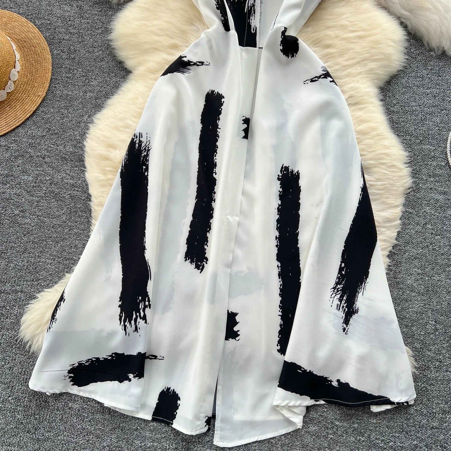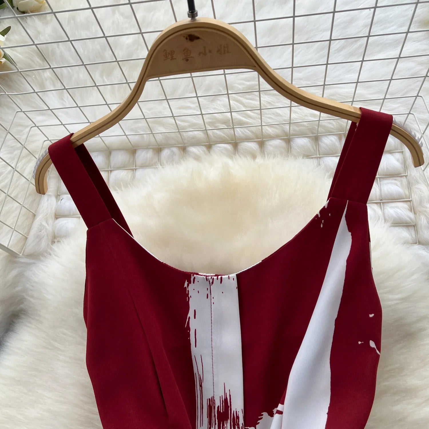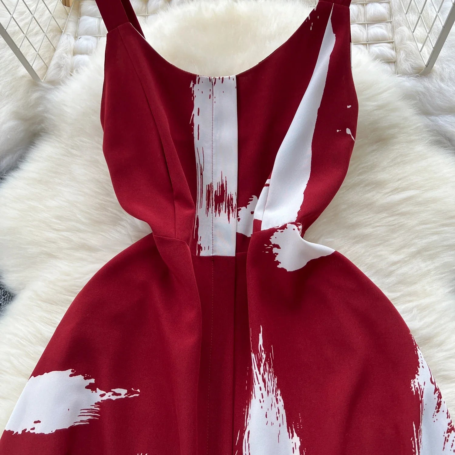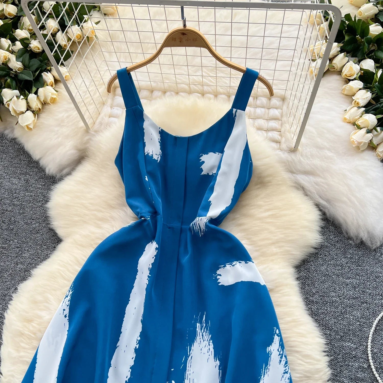 Neue Sommer Druck Süße Kleid Träger O Neck Backless Split Elegante Damen Urlaub Strand Party Midi Sommerkleid