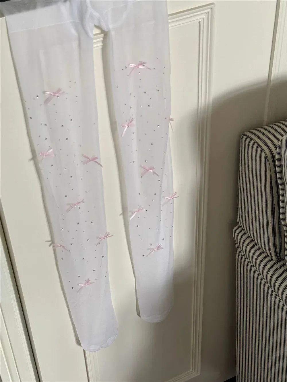 New Lolita Velvet Bowkont Embroidery Pearl Tights Pantyhose Flash Diamond Women Tight JK Style Sweet Girls Kawaii Cute Stockings