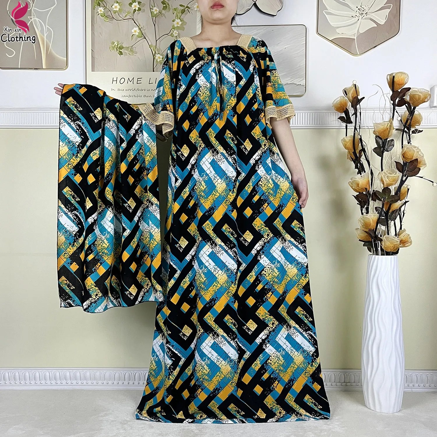 New Muslim Dubai Elegant Dress Summer Short Sleeve African Abaya Printing Cotton Loose Femme Robe Islamic Dresses With Scarf