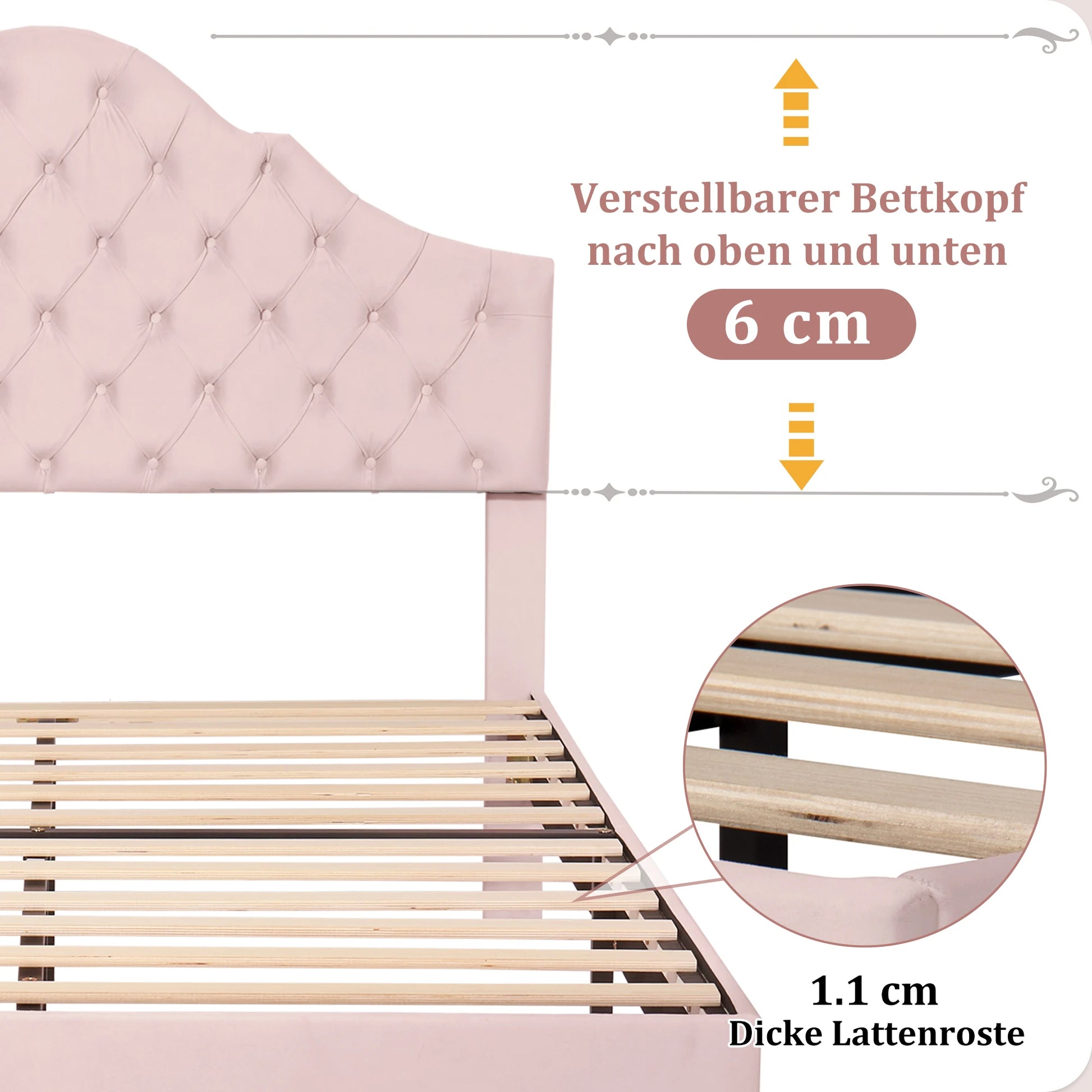 Polsterbett 140x200cm mit Lattenrost und höhenverstellbares Kopfteil, Holzlattenunterstützung, Einfache Montage, Samt, rosa