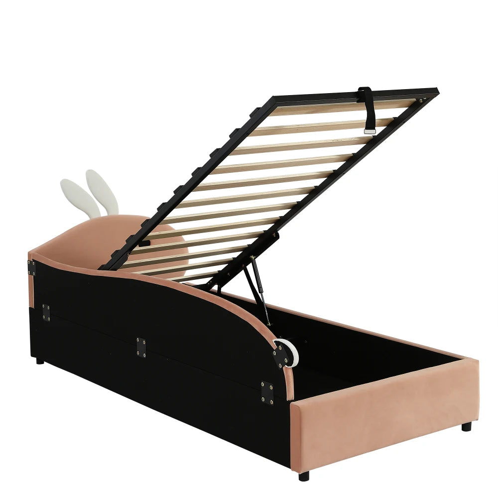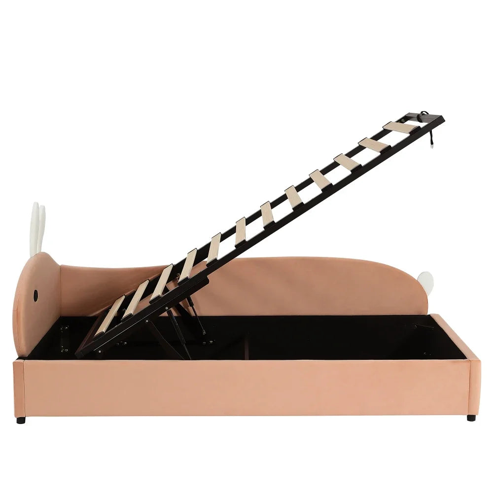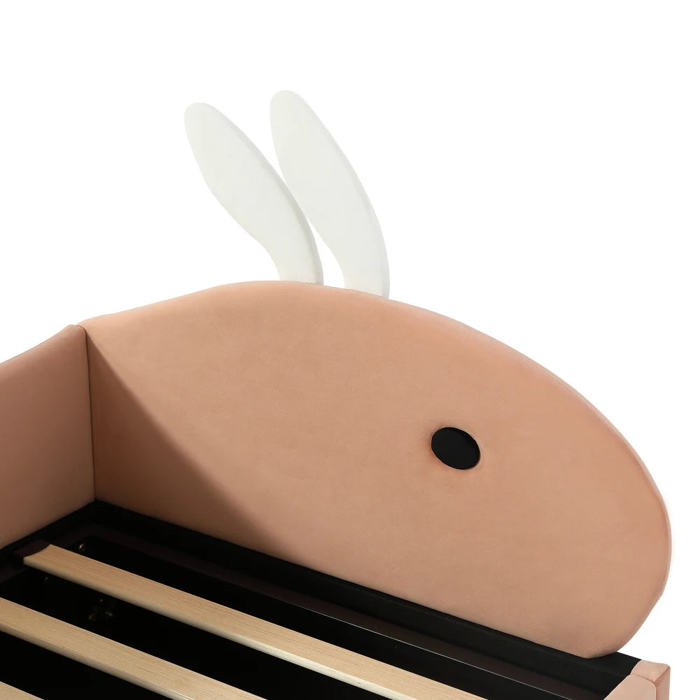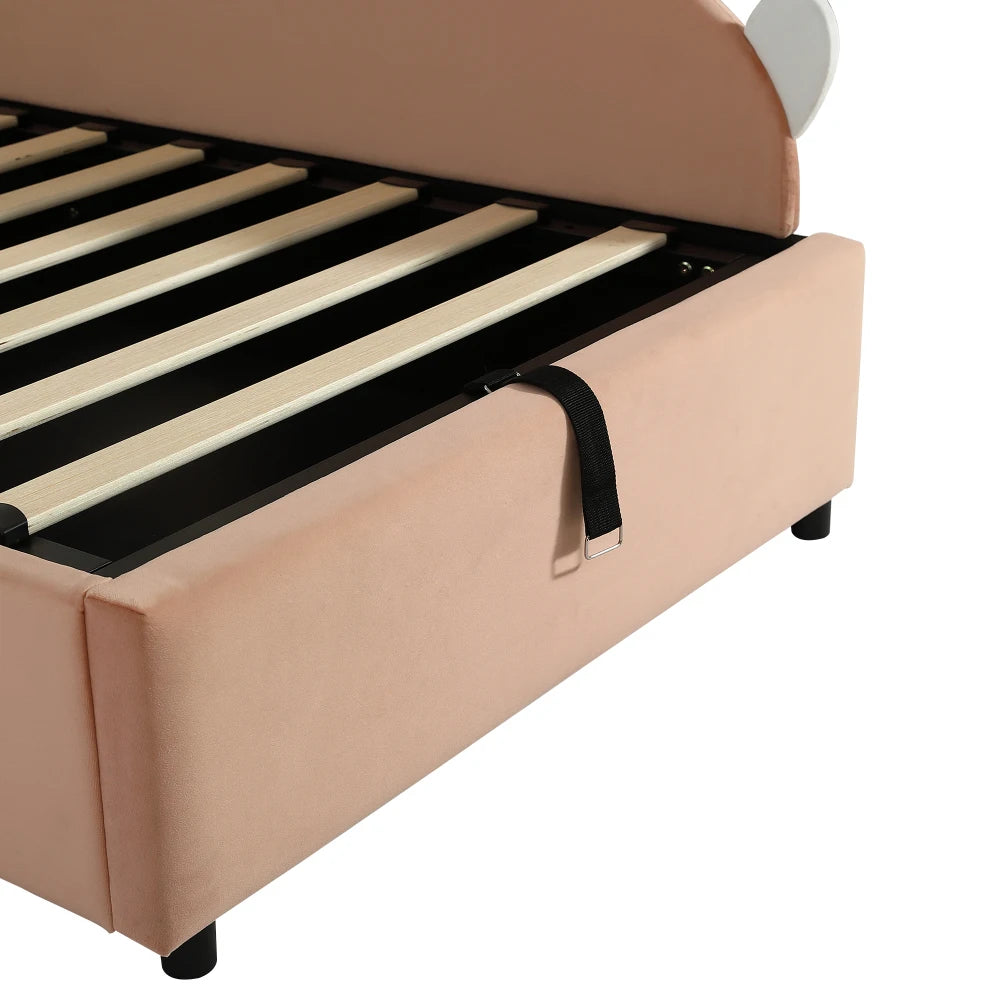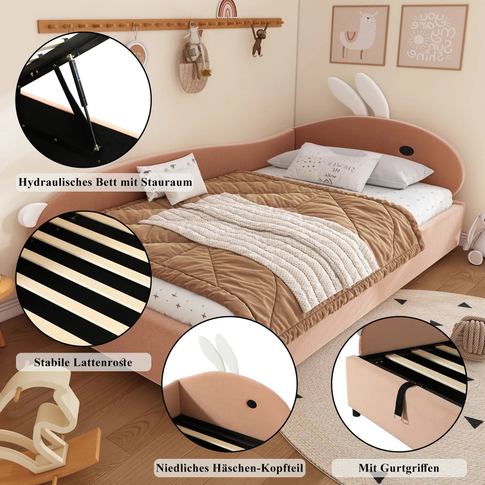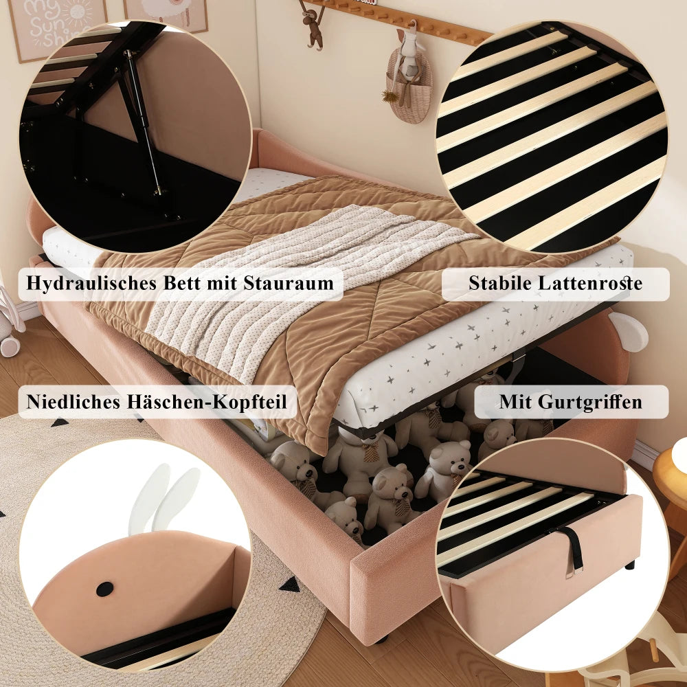 Polsterbett, Einzelbett, Babybett, niedlicher Hasenkopf, hydraulisches Bett mit Stauraum, erhöhter weicher Zaun, Samt, rosa + weiß, 90 x 200 cm