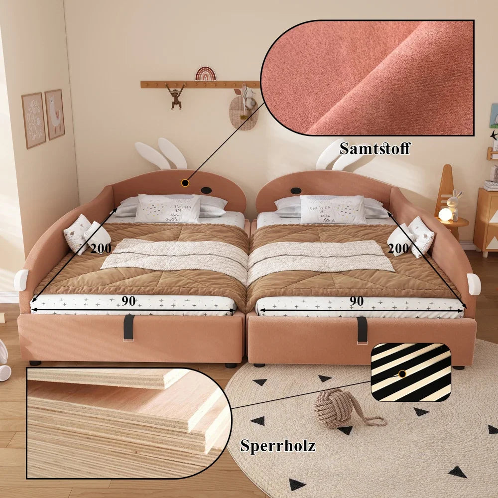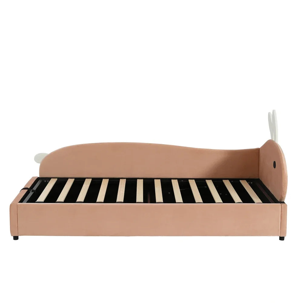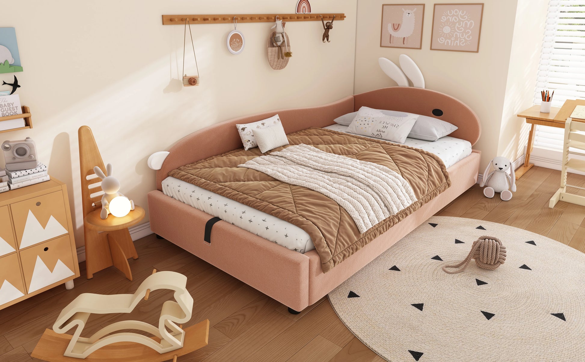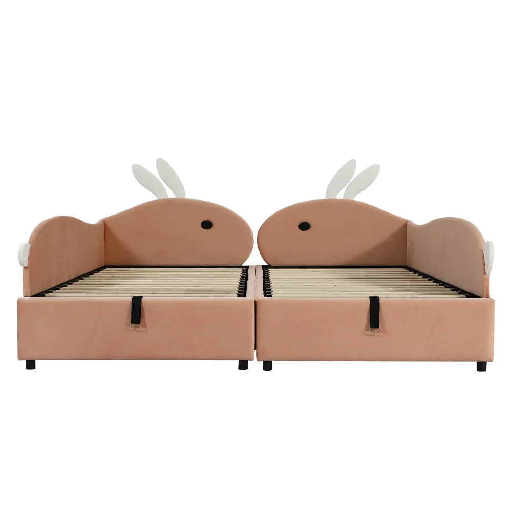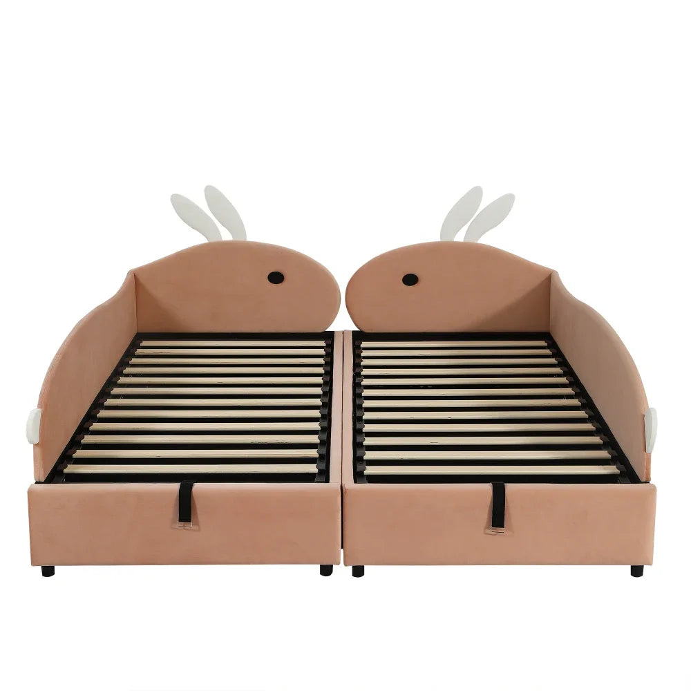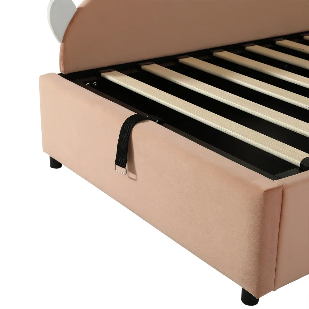 Polsterbett, Einzelbett, Babybett, niedlicher Hasenkopf, hydraulisches Bett mit Stauraum, erhöhter weicher Zaun, Samt, rosa + weiß, 90 x 200 cm