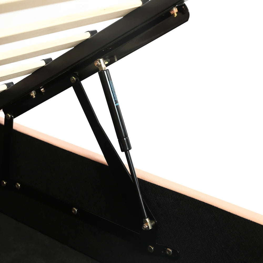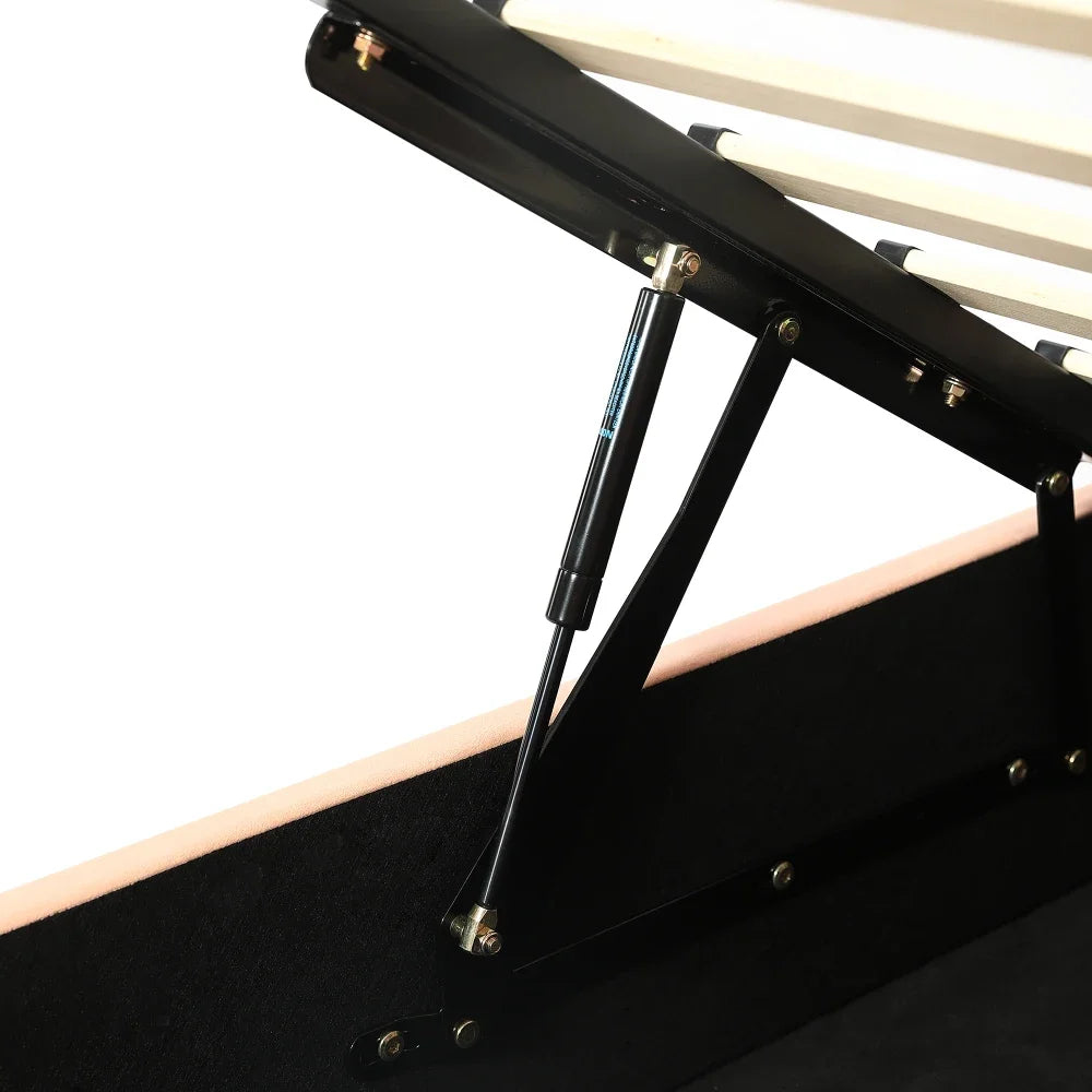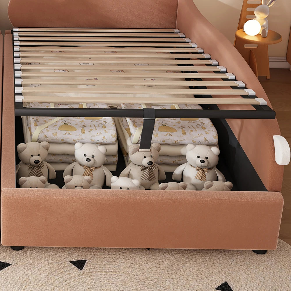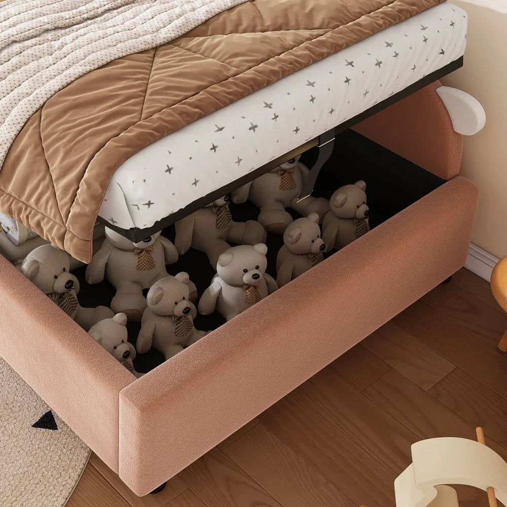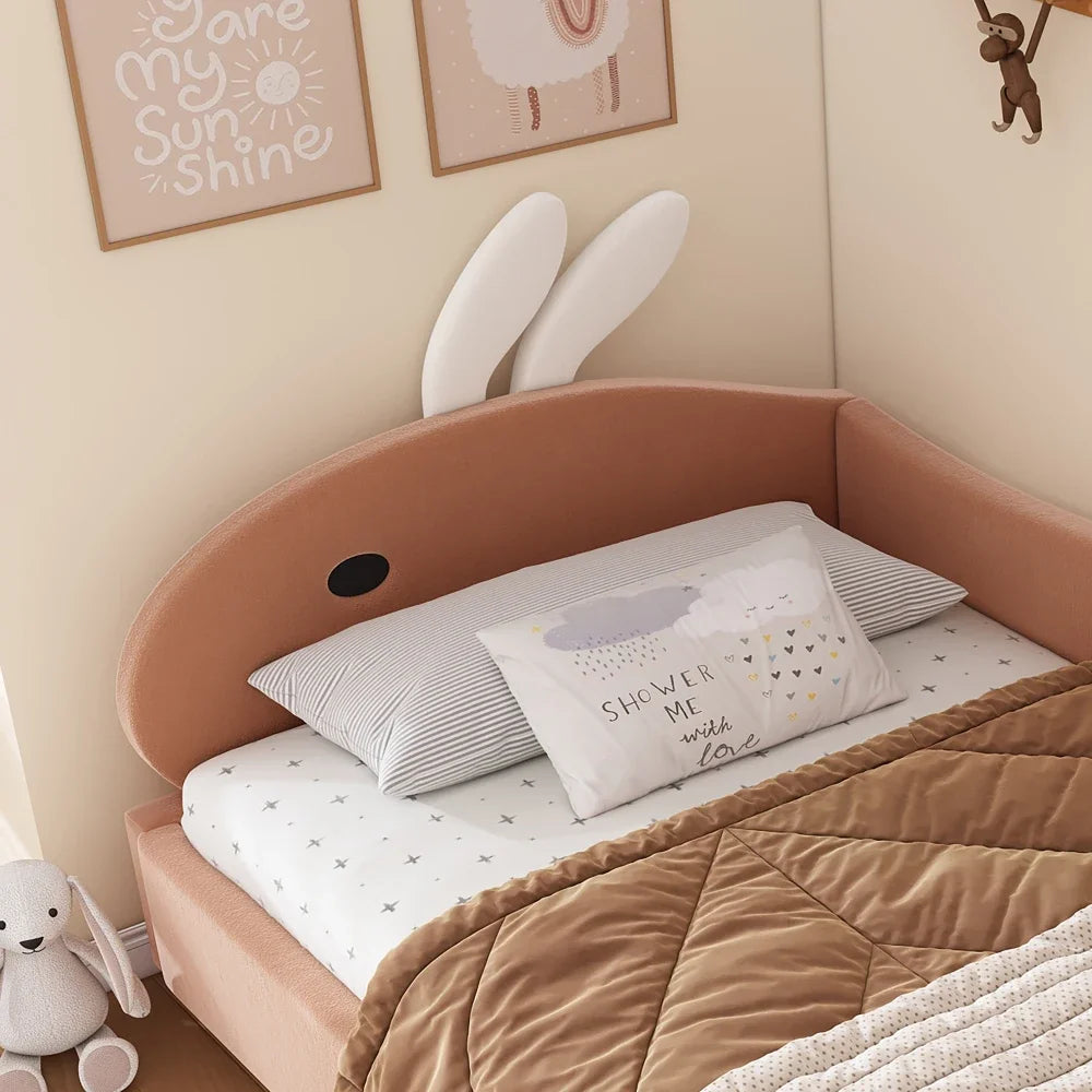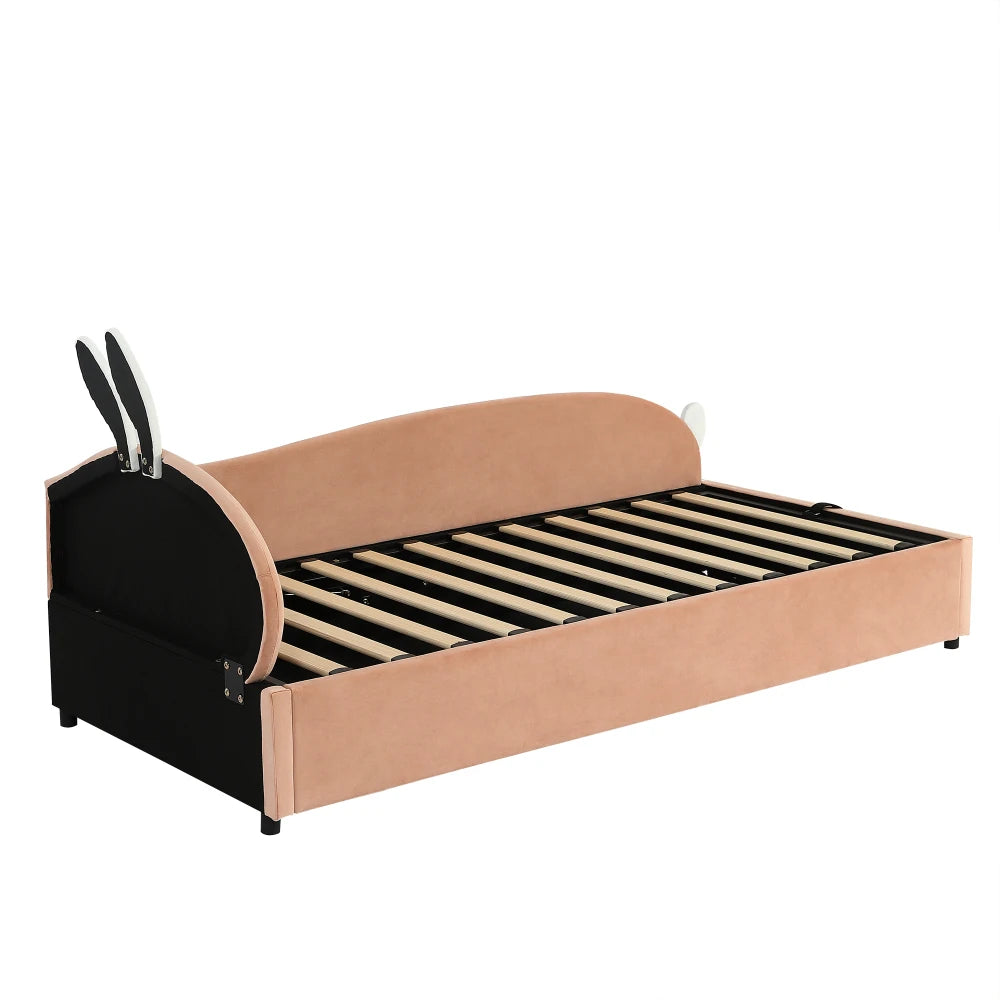 Polsterbett, Einzelbett, Babybett, niedlicher Hasenkopf, hydraulisches Bett mit Stauraum, erhöhter weicher Zaun, Samt, rosa + weiß, 90 x 200 cm