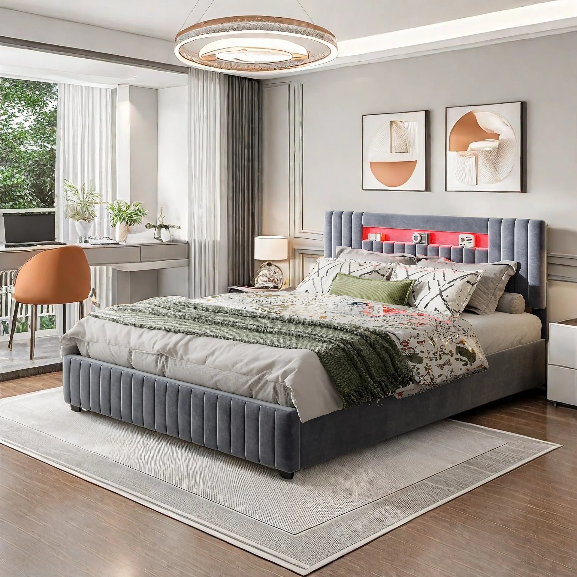 Rosahqnda 140x200 Bett mit Stauraum und Untergestell, gepolstertes Bett mit Stauraum, Doppelbett mit LED, Bettgestell aus Samt, mit Lattenrost, Grau