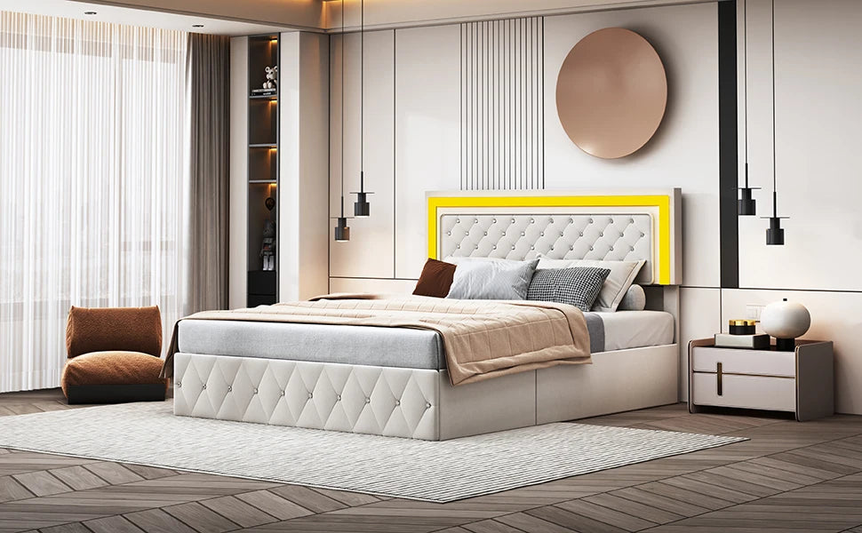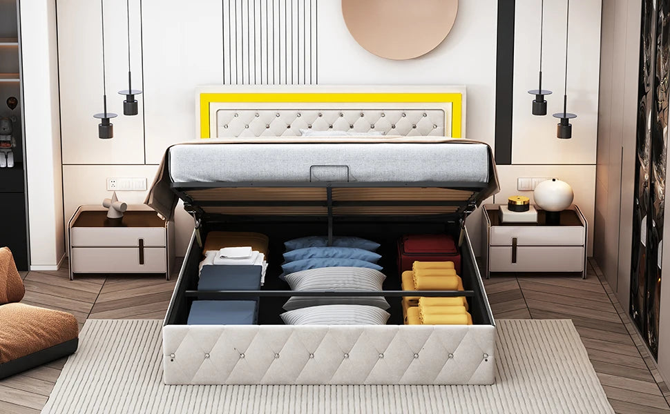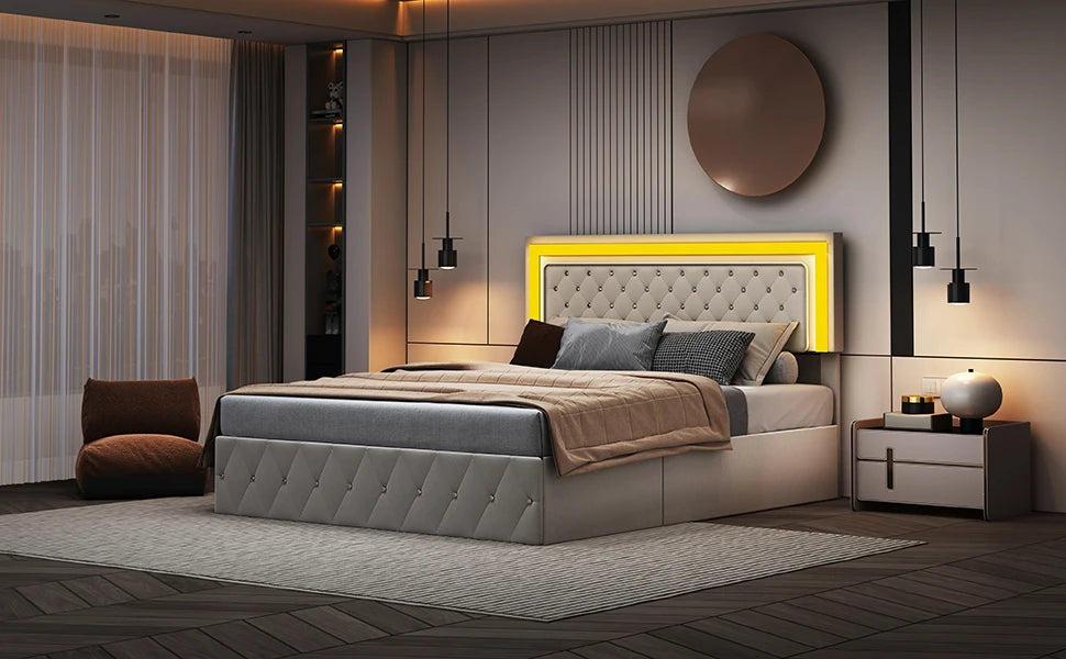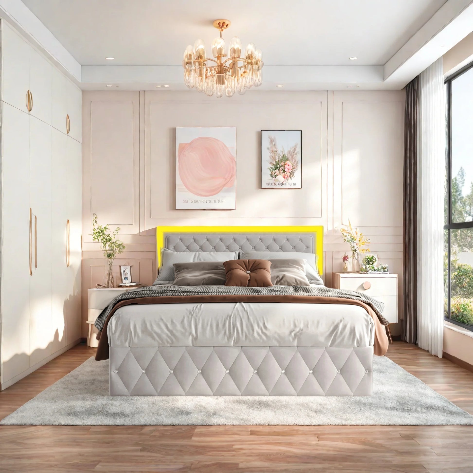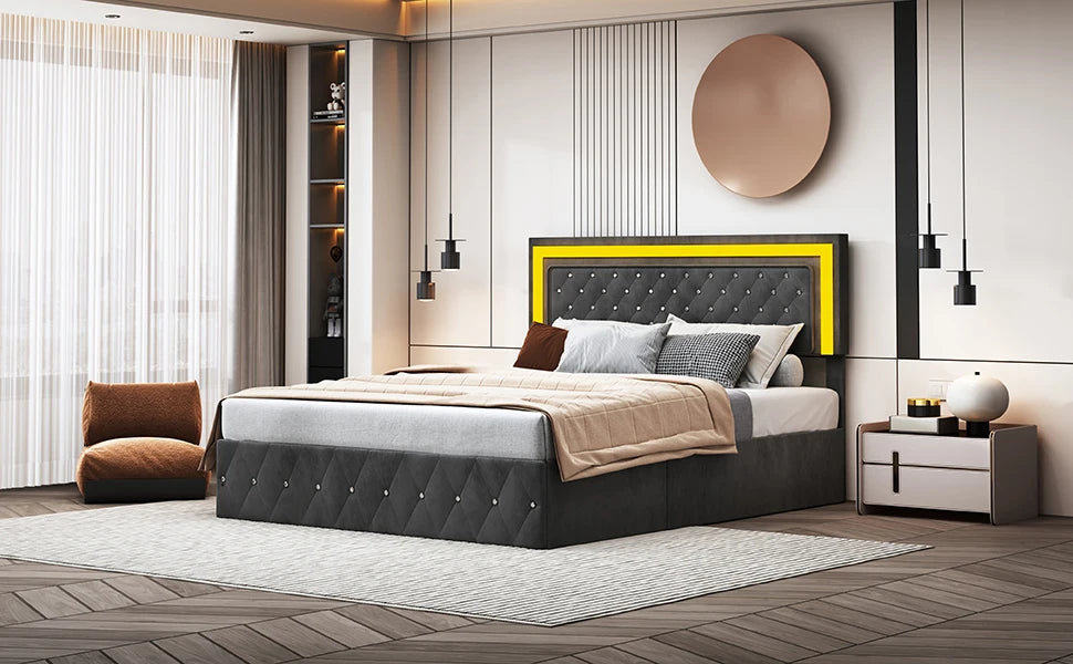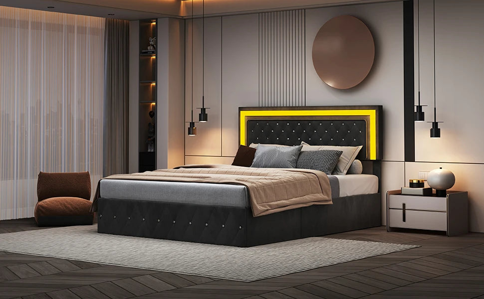 Rosahqnda Doppelbettgestell 140–160–180 x 200 cm, verstellbares LED-Kopfteil, hydraulisches Bett mit Stauraum, gepolstertes Jugendbett, Samt