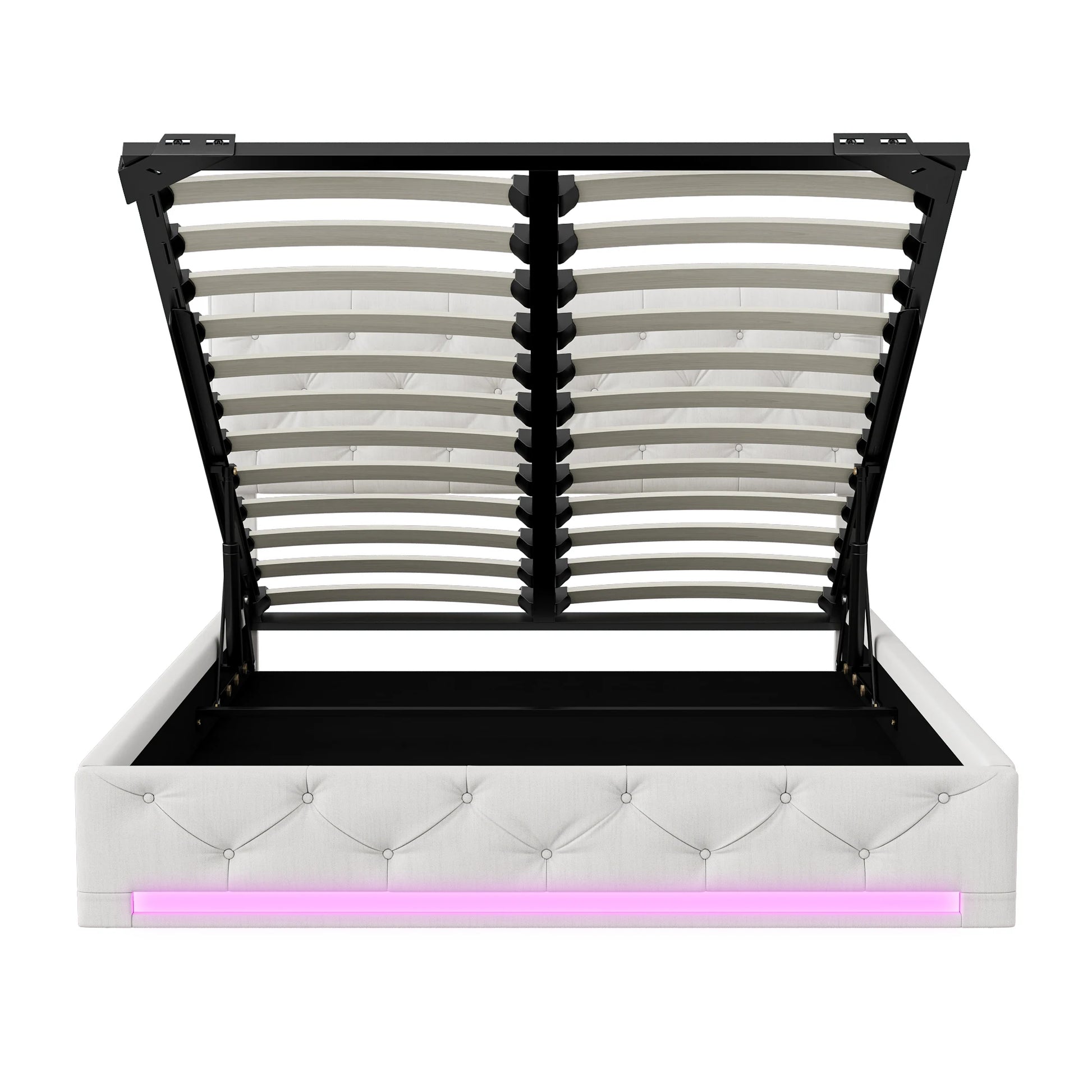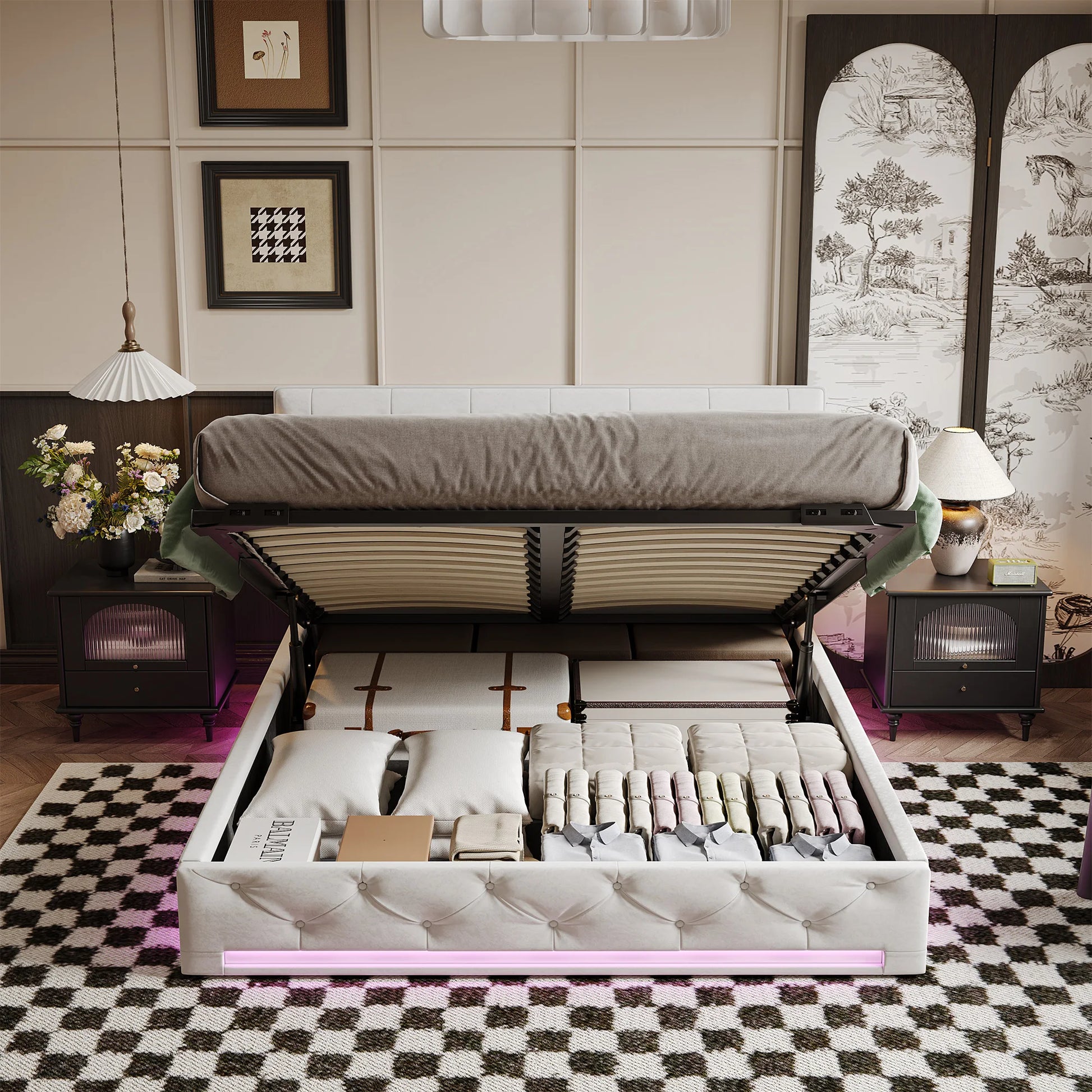 Rosahqnda Double Upholstered Bed 160x200,LED Hydraulic Storage Bed with Large Storage Space,Adjustable Headboard,Bedroom,Beige