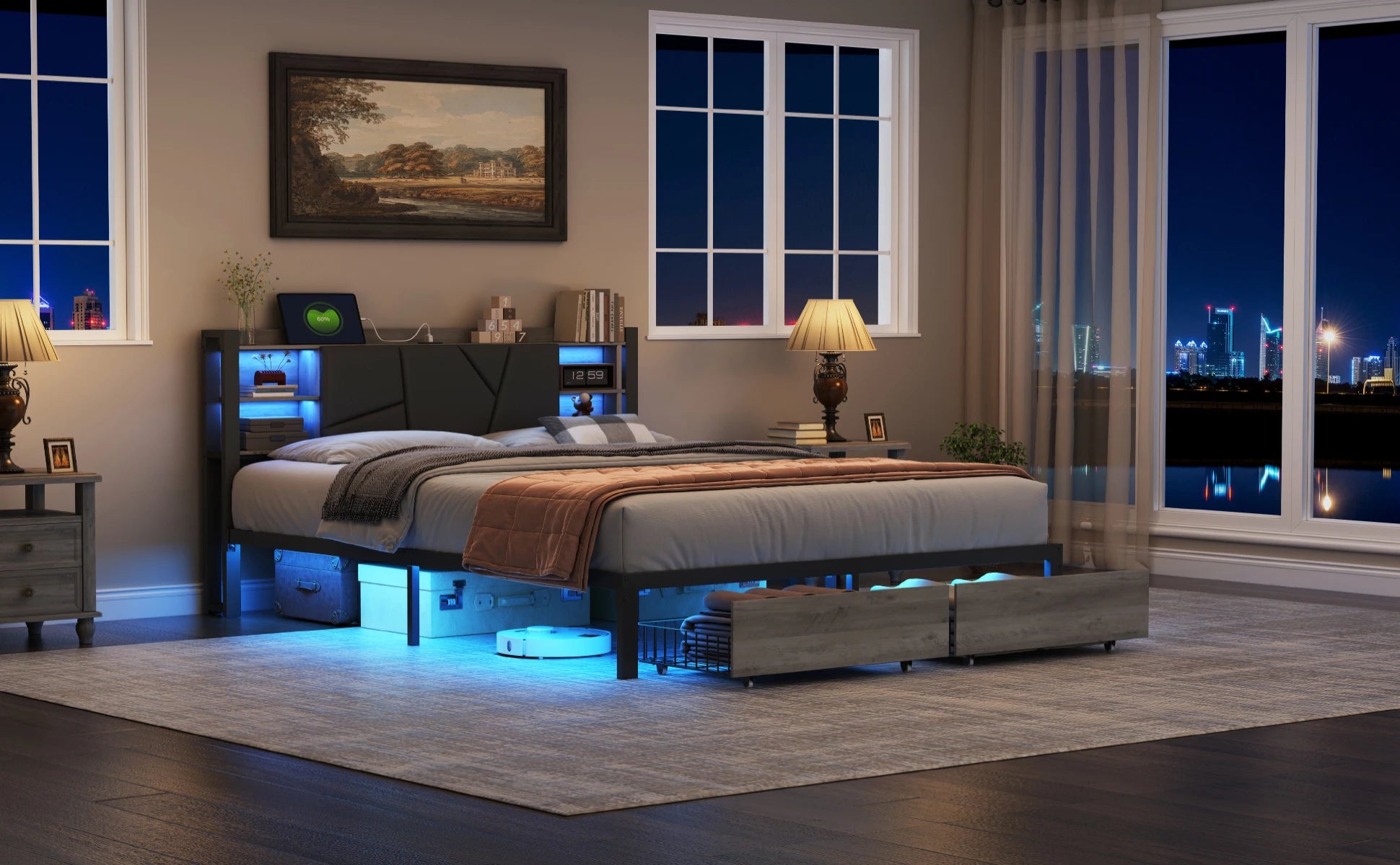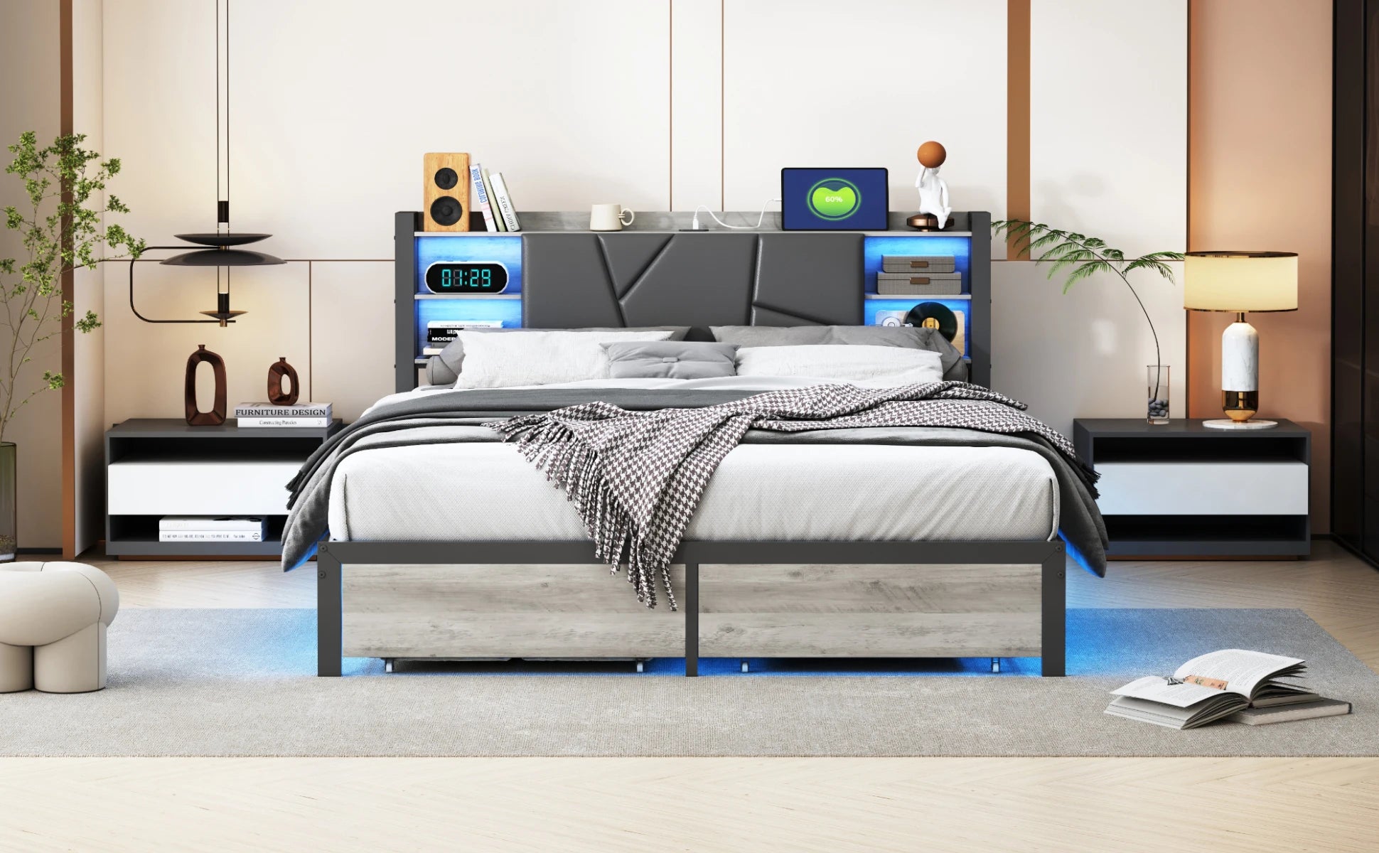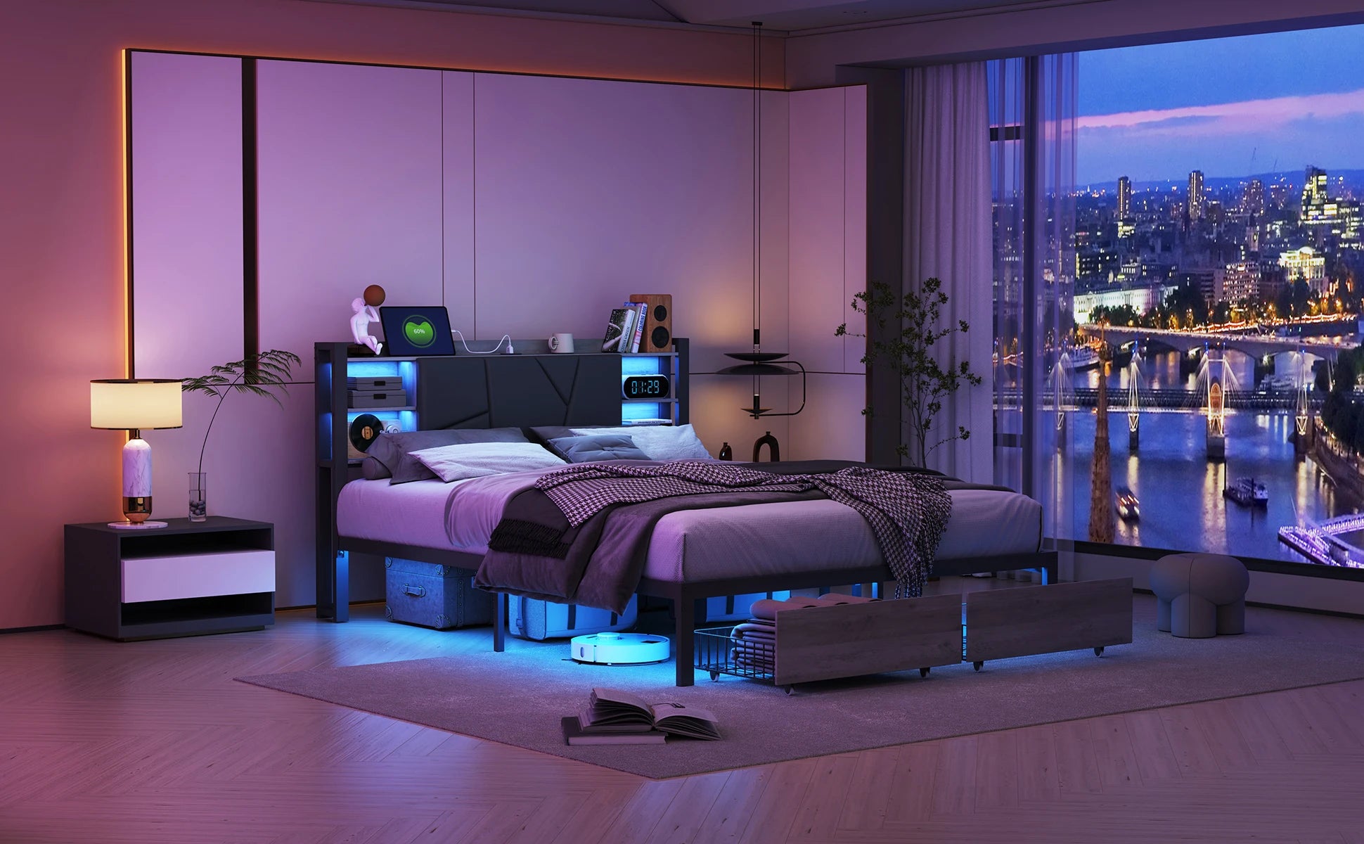 Rosahqnda gepolsterter Doppelbettrahmen 140–160–180 x 200 cm mit 2 Schubladen, Aufbewahrungs-Jugendbett, Gästebett, Apartmentbett, Eisenbett, PU