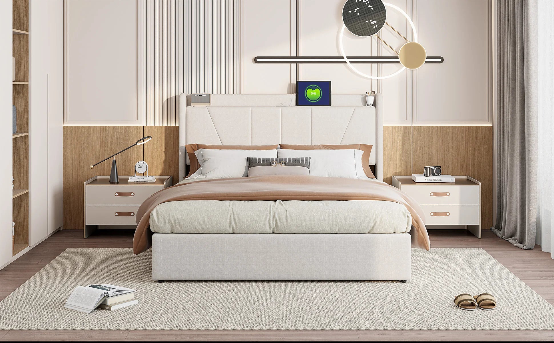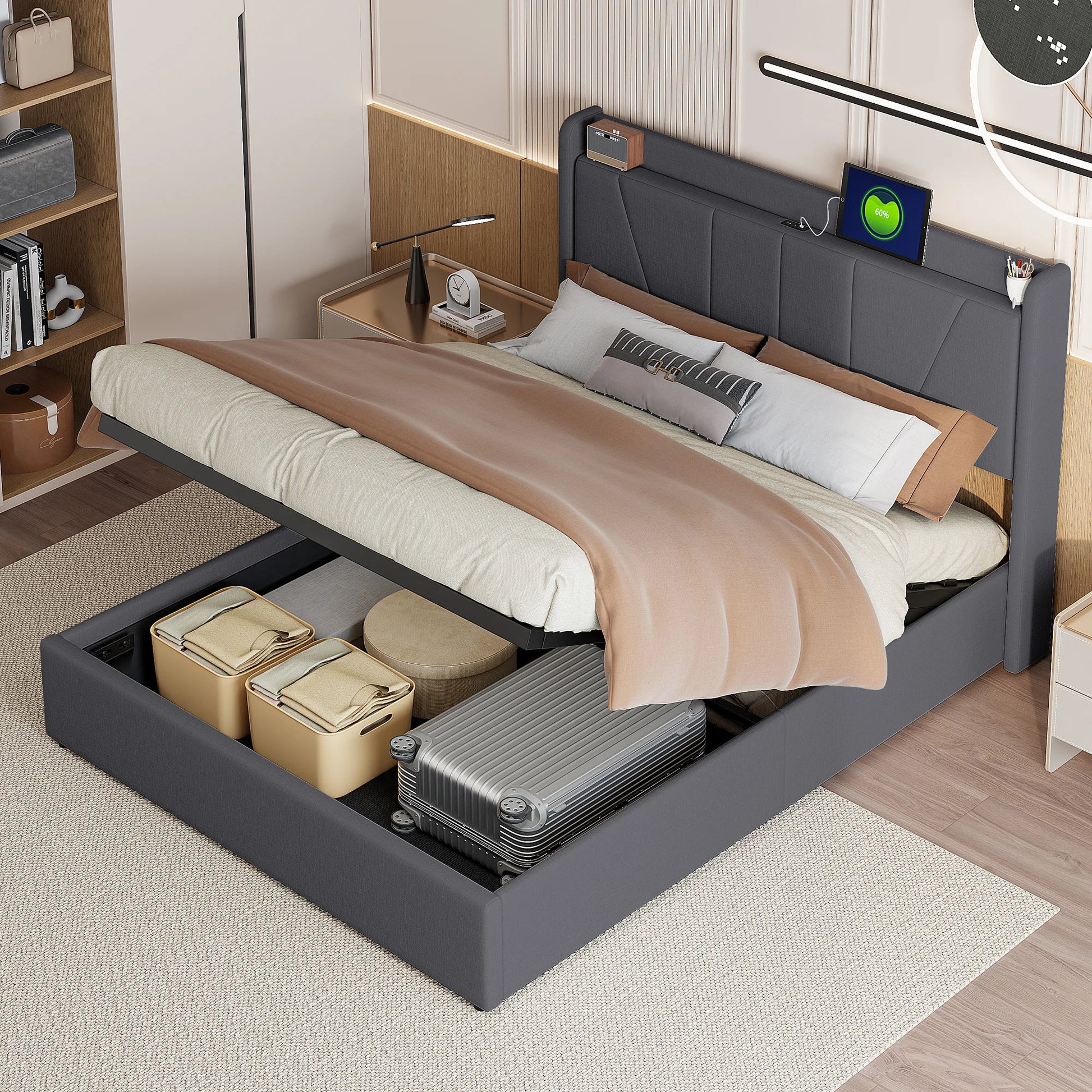 Rosahqnda Gepolsterter Doppelbettrahmen 140-160x200 cm Leinen USB-Hydraulikbett mit Stauraum Gästebett Schlafzimmer