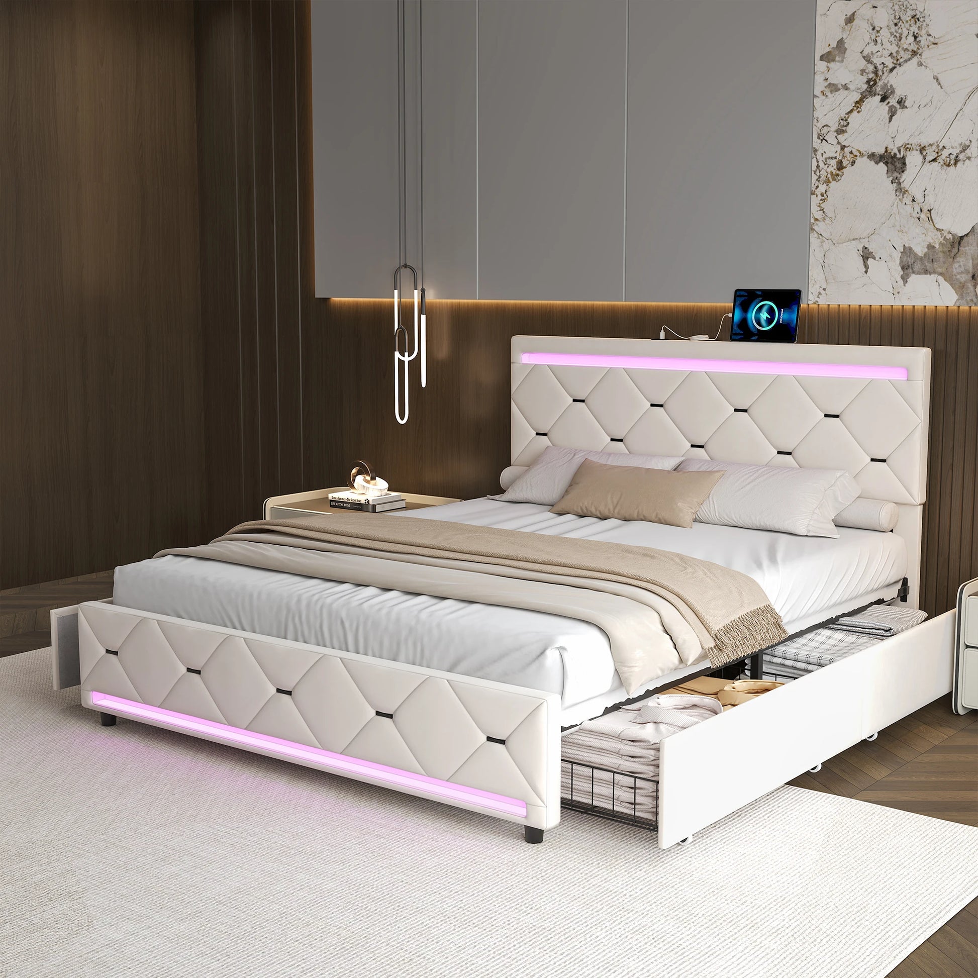Rosahqnda gepolstertes Bett mit Stauraum, USB-Ladefunktion und LED-Kopfteil und 4 Schubladen, Doppelbettrahmen