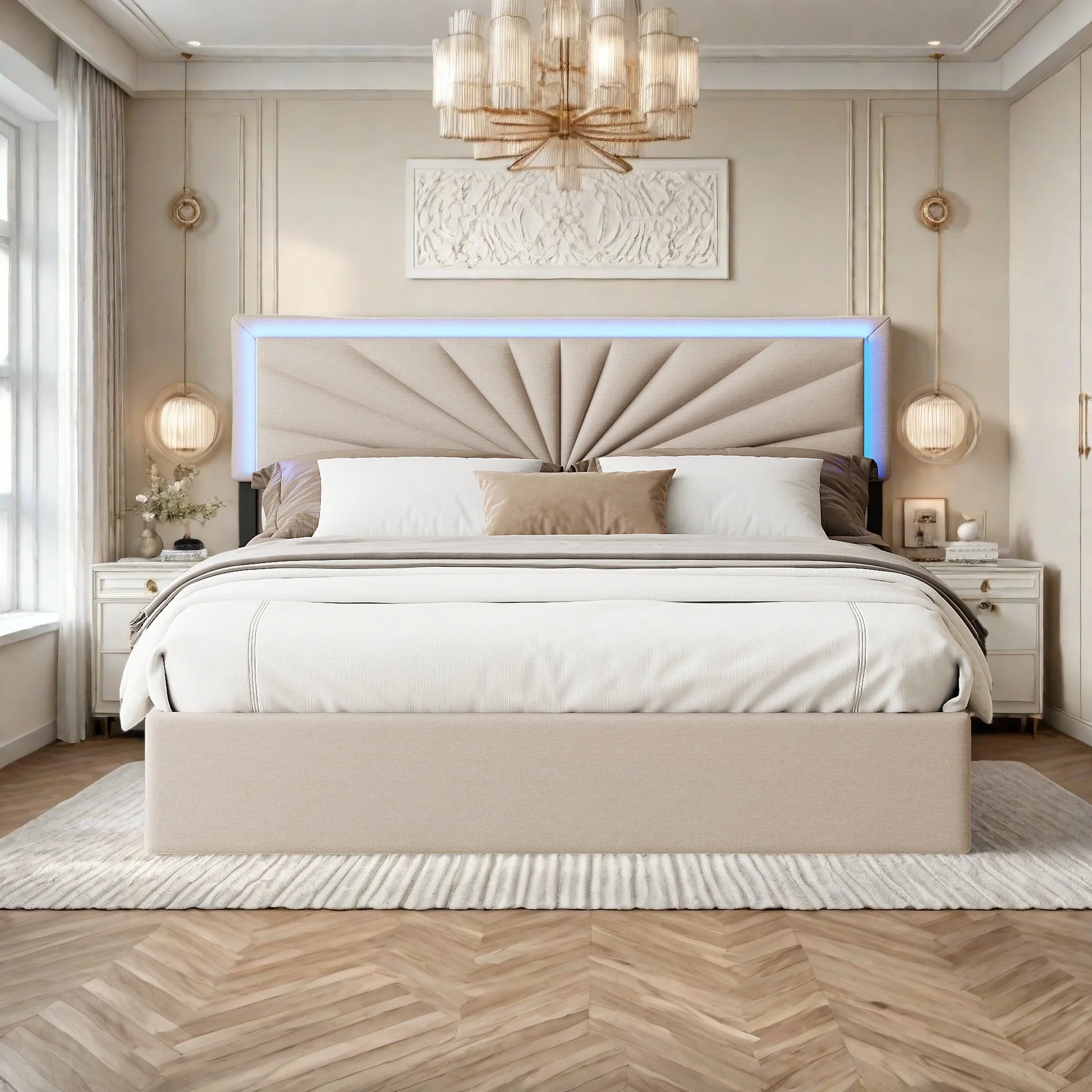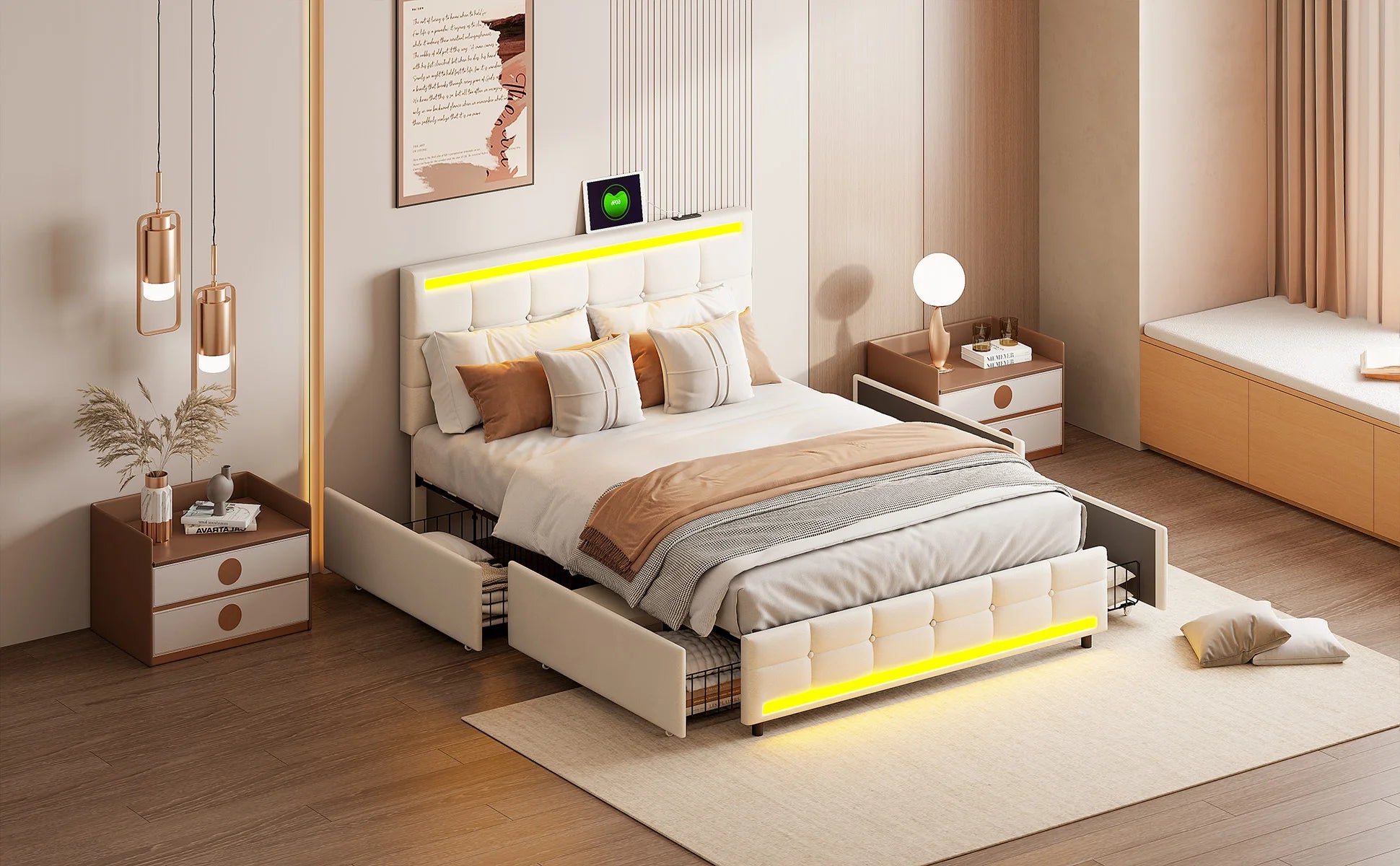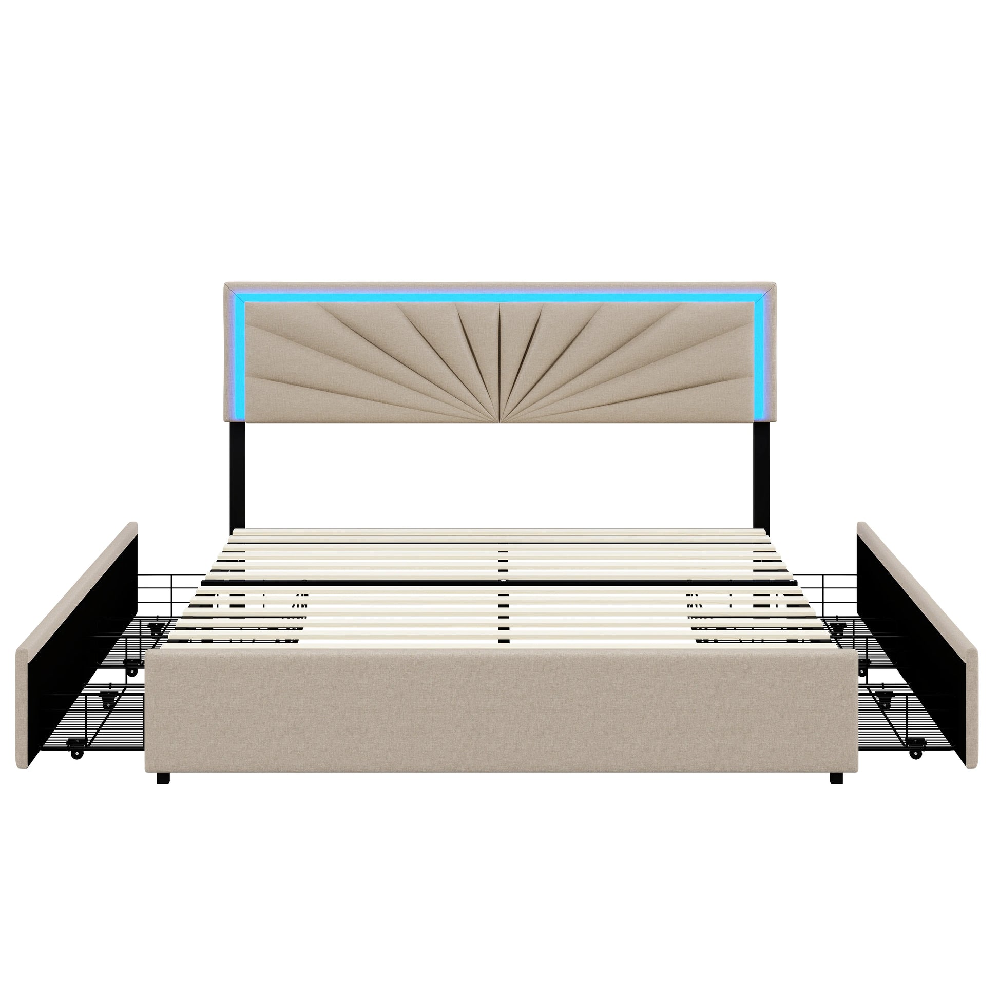 Rosahqnda Gepolstertes Doppelbett 140-160 x 200 cm mit 4 Schubladen und LED, Stauraumbett, Gästebett, Apartmentbett, Leinen