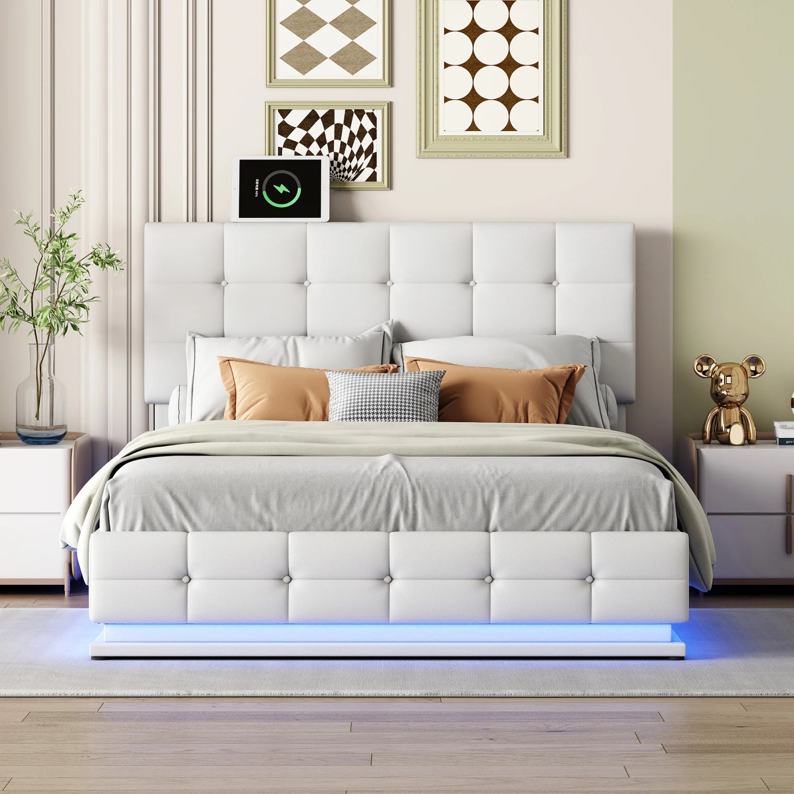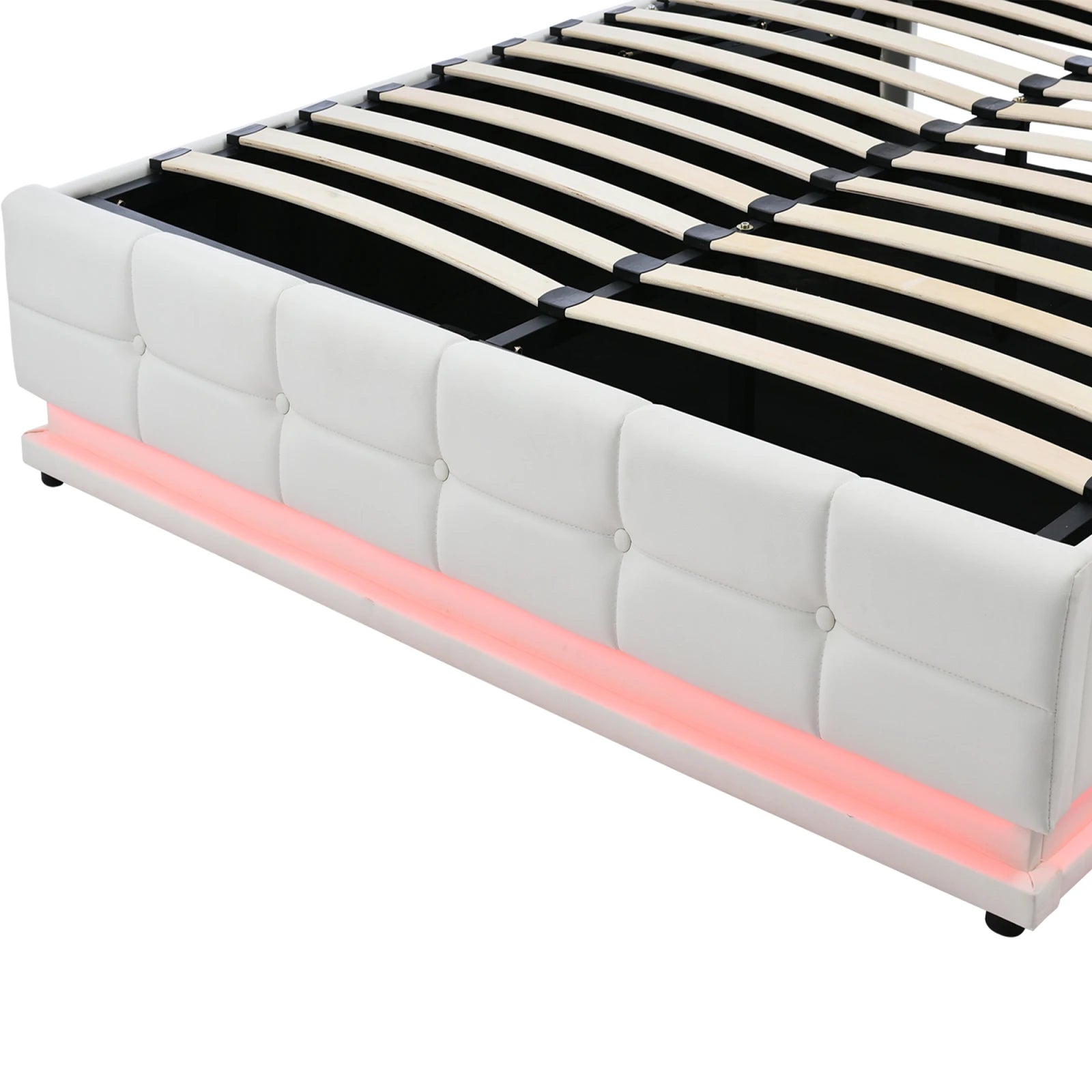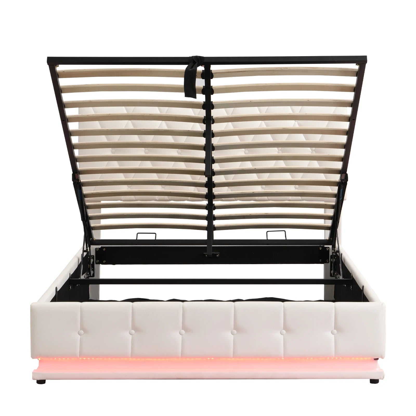 Rosahqnda Gepolstertes hydraulisches Bett 140 * 200 cm mit LED-verstellbarem Kopfteil, moderner Doppelbettrahmen mit Stauraum,PU