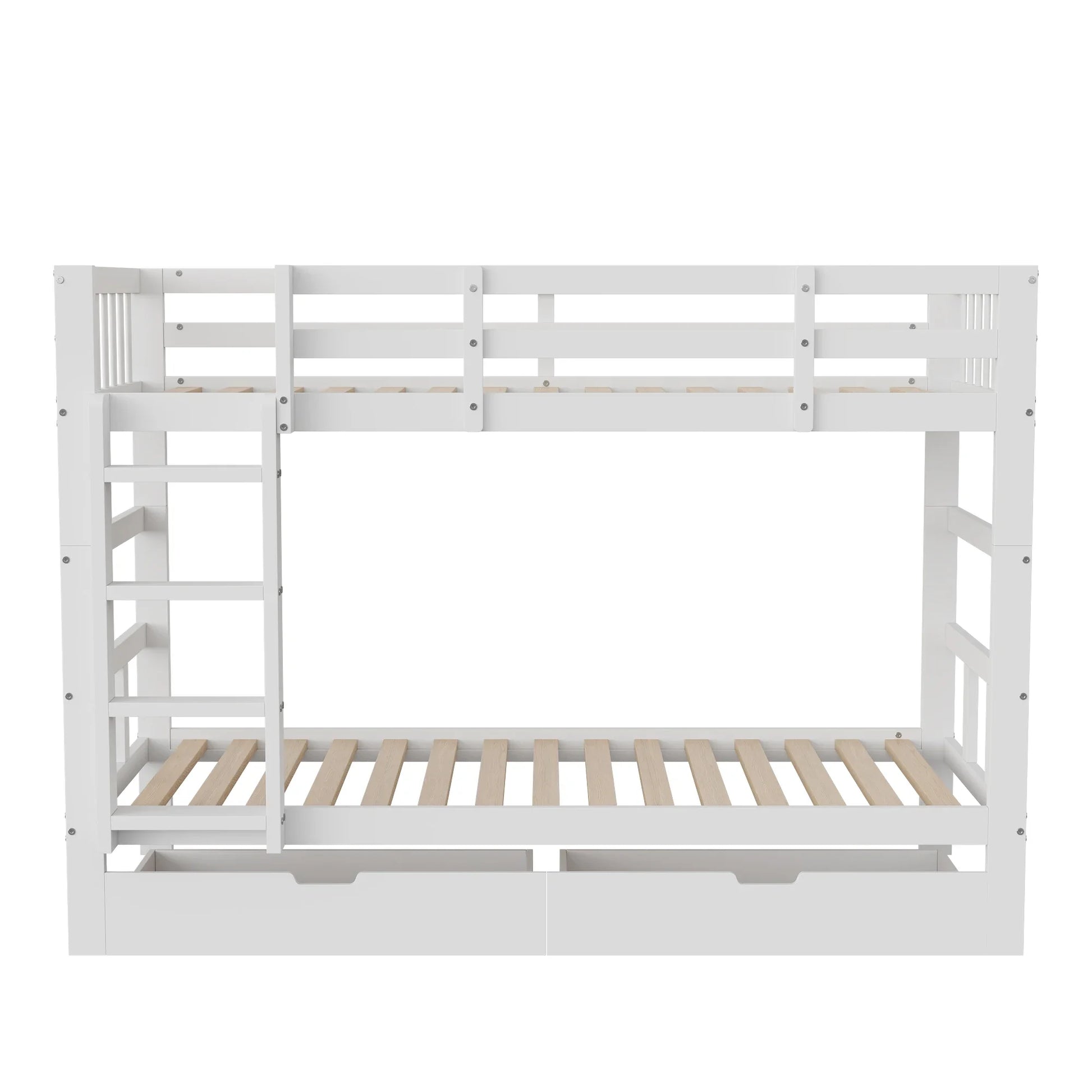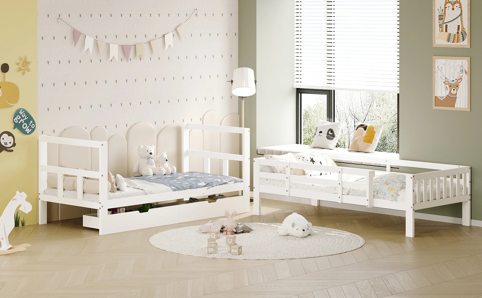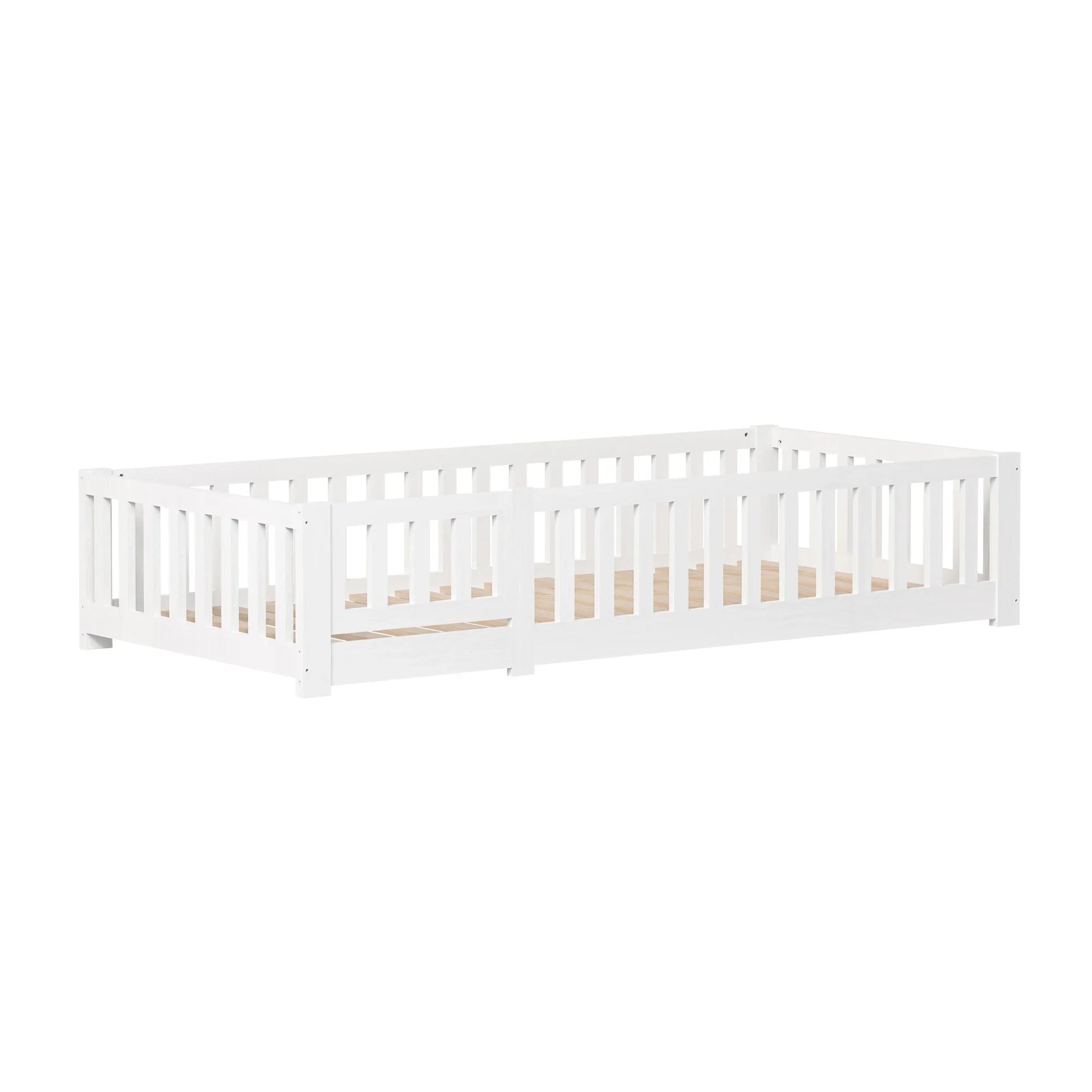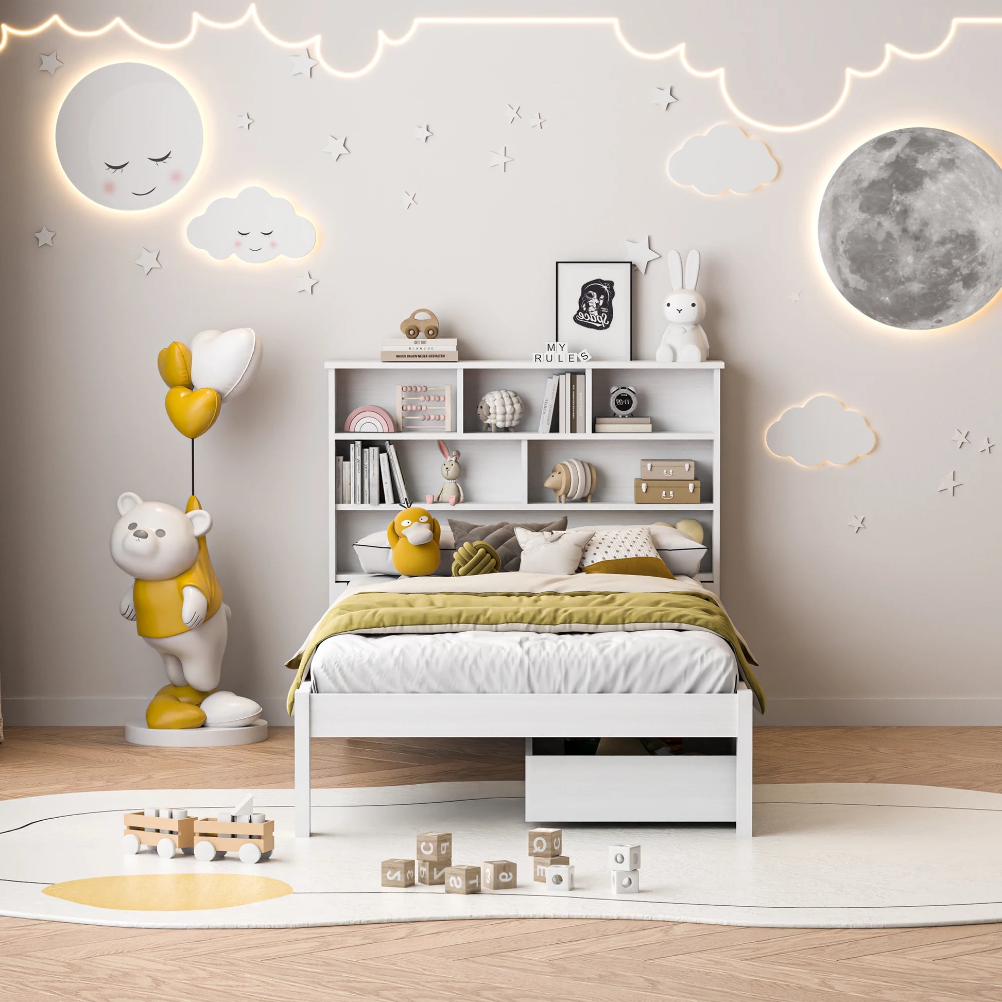 Rosahqnda Massivholz-Bettgestell 90 x 200 cm, Kinderbett mit Schubladen und Kopfteil für Bücher, Einzelzimmer, Weiß